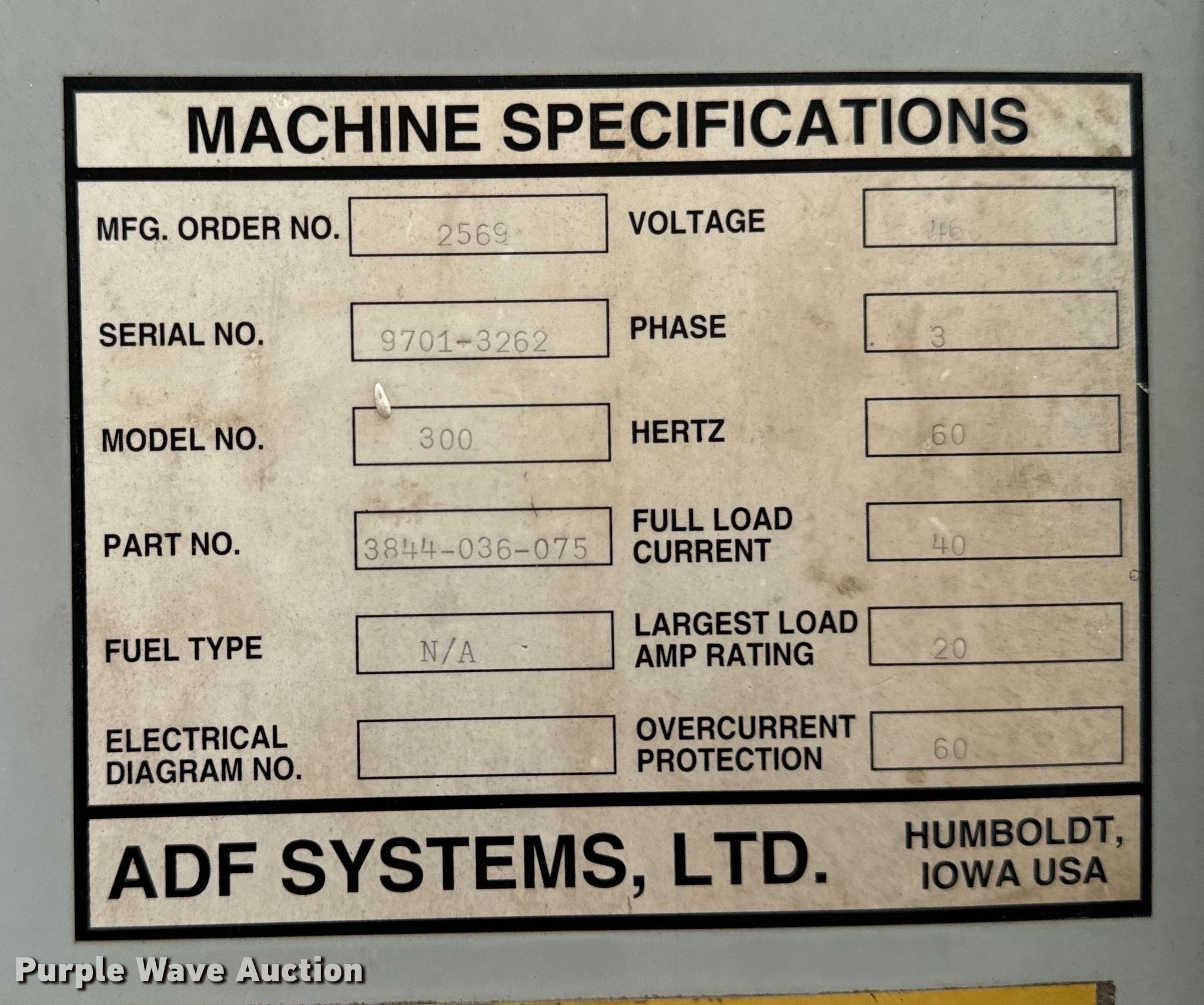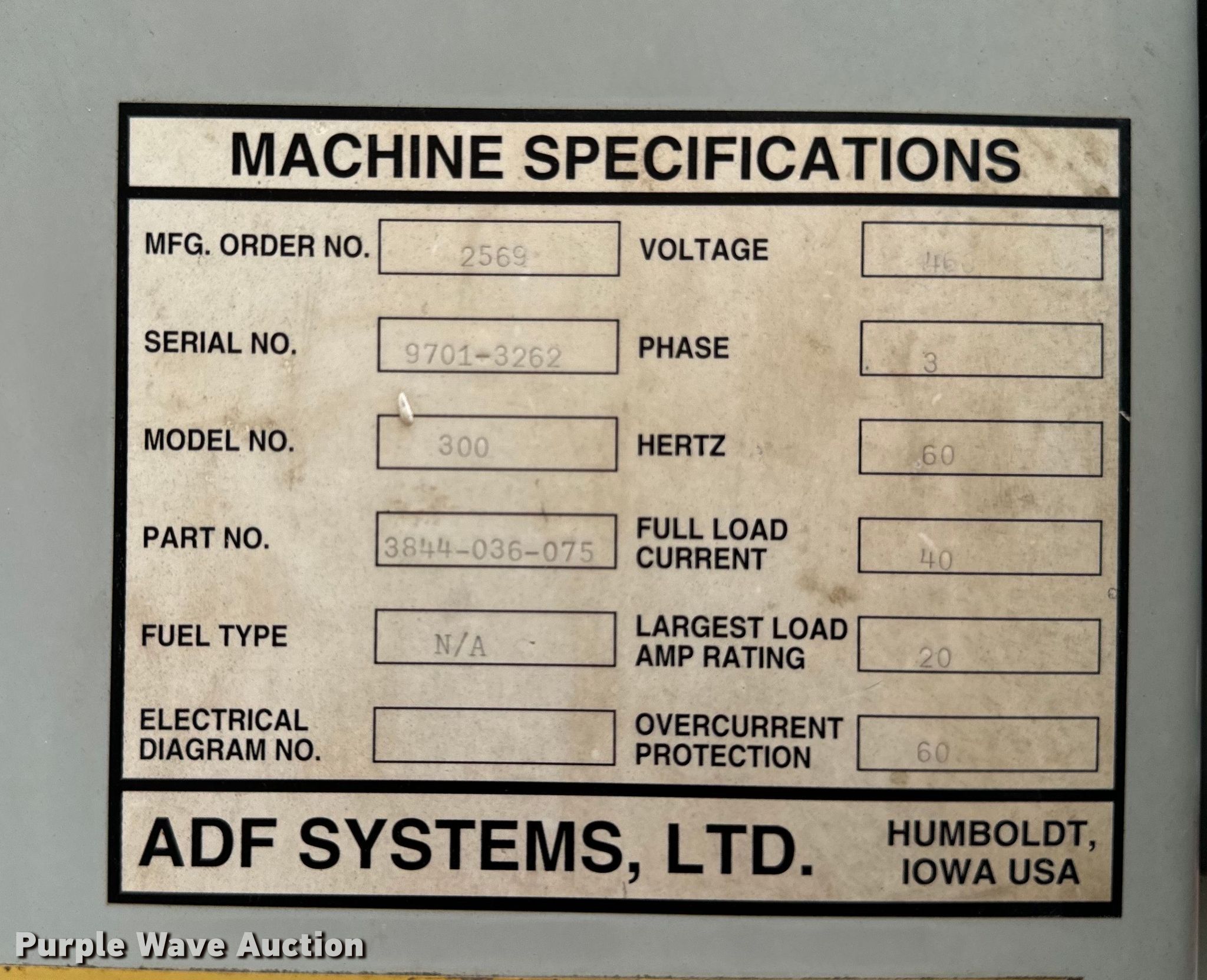 ADF Systems 300 parts washer. Serial: 9701-3262. Electric Motor Volts: 460, Phase: Three. Notes Unknown operating condition. vmenterprises. Pella, IA 50219
