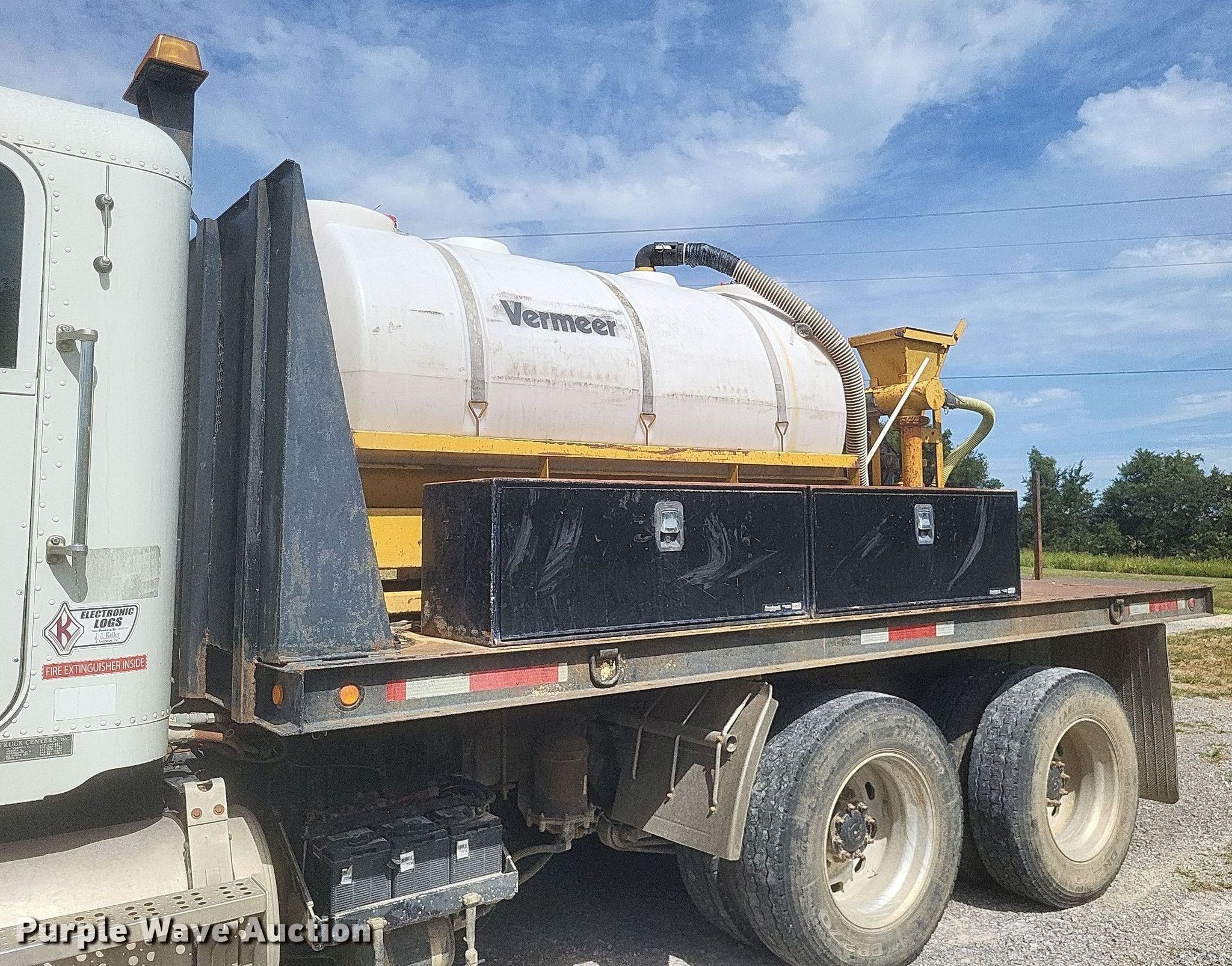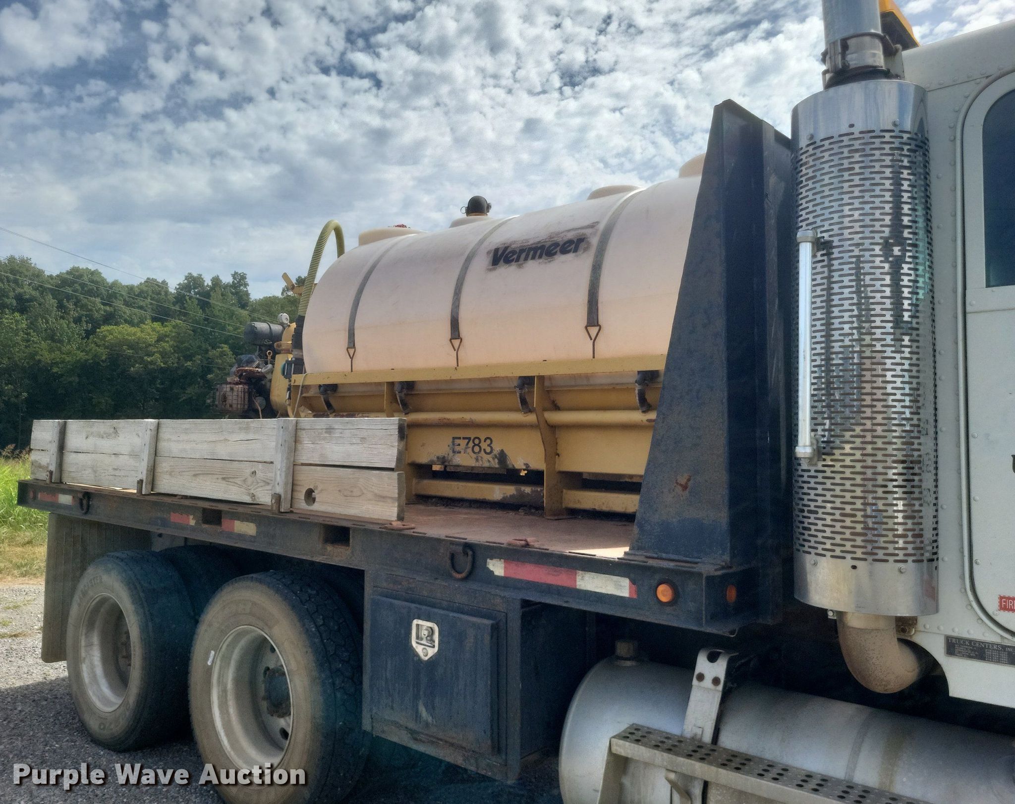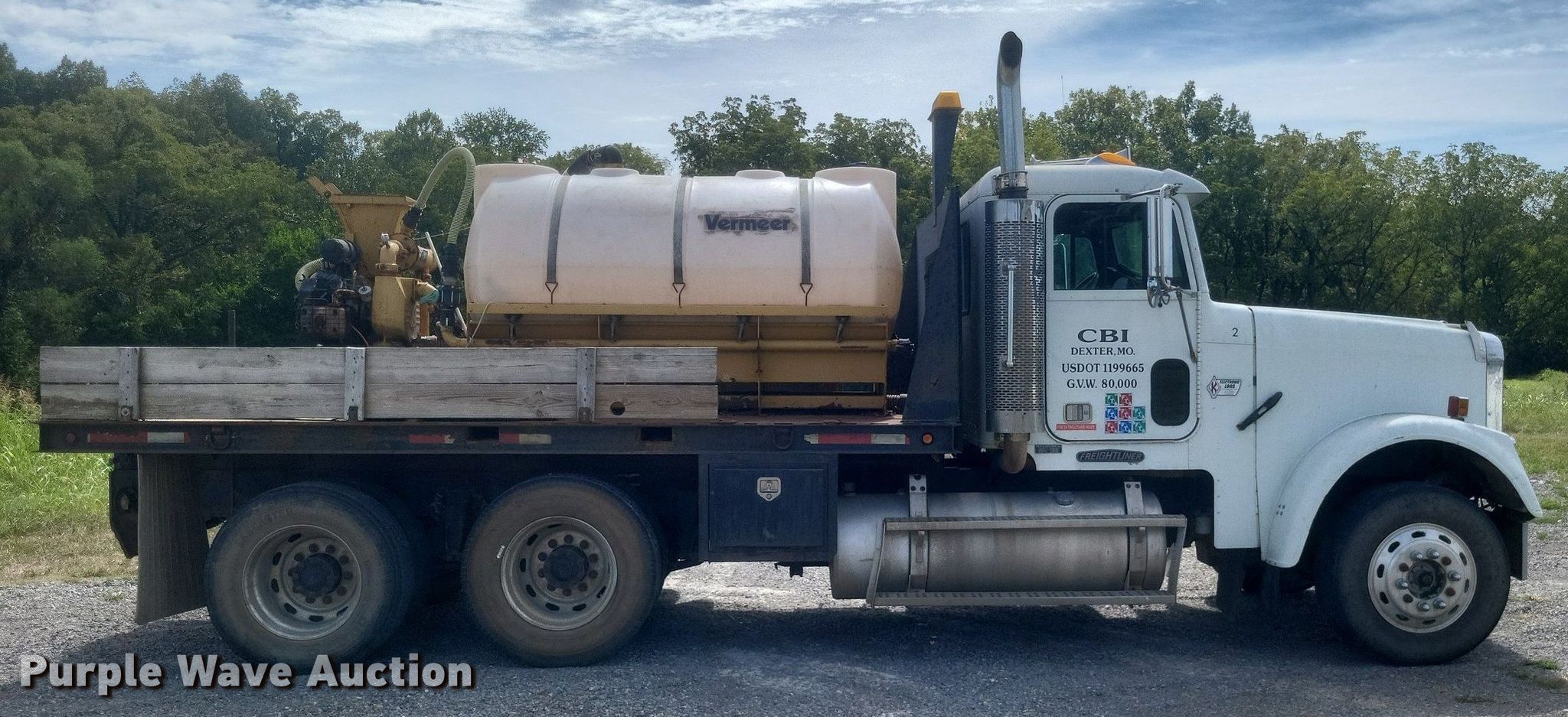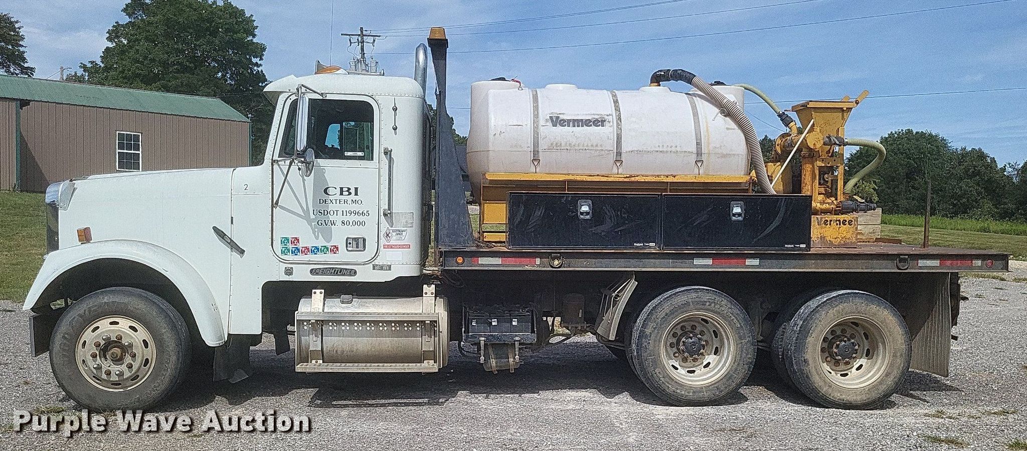 1996 Freightliner FLD flatbed truck. Miles: 552,052 on odometer, VIN: 1FUPFEDB0TP810710, Unit #: 2. Engine Caterpillar 3176, Displacement: 10.3L, Cylinders: 6, Fuel type: Diesel. Transmission Eaton Fuller, Manual, Speed: 10. Chassis Axles: Tandem, Differential: Inter-axle, Suspension: Air, Brakes: Air, GVWR: 52,000 lbs. Interior AC, Heat, Power windows, Cruise control, Brake controller. Features Flatbed 185" L x 8' W, Removable sides, Dump valve, Mixing fluid system. Tires Size: 295/75R22.5. Vermeer ST750A mud tank VIN: 1VRT1106441001169, Unit #: E783, Skid mounted. Engine Kohler, Fuel type: Gas. Features Fuel tank, Poly tank Capacity: Approx. 750 gallons, 2" outlet. Notes Windshield chipped or cracked, Driver door lock missing, Mud tank engine issues, cranks but won't start. Missouri title. Mileage has not been verified. Exempt will be written in the odometer disclosure on the title. Title distribution may be delayed up to 14 days from verification of funds. Coastal Bay Inc.. Bloomfield, MO 63825