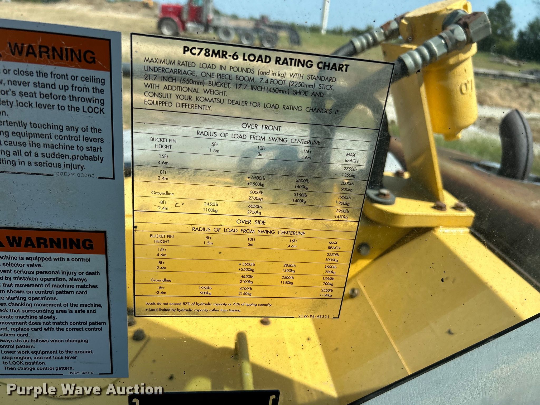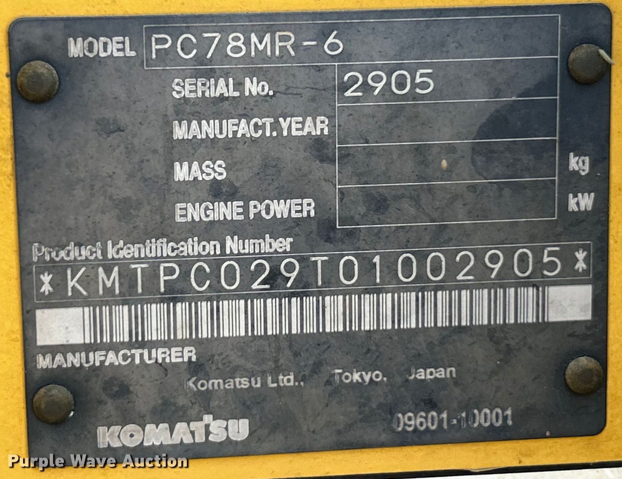 Purple Wave is selling a used Mini Excavator in Missouri. This item is a 2007 Komatsu PC78MR-6 mini excavator with the following: Hours: 6,640 on meter, Serial: KMTPC029T01002905
