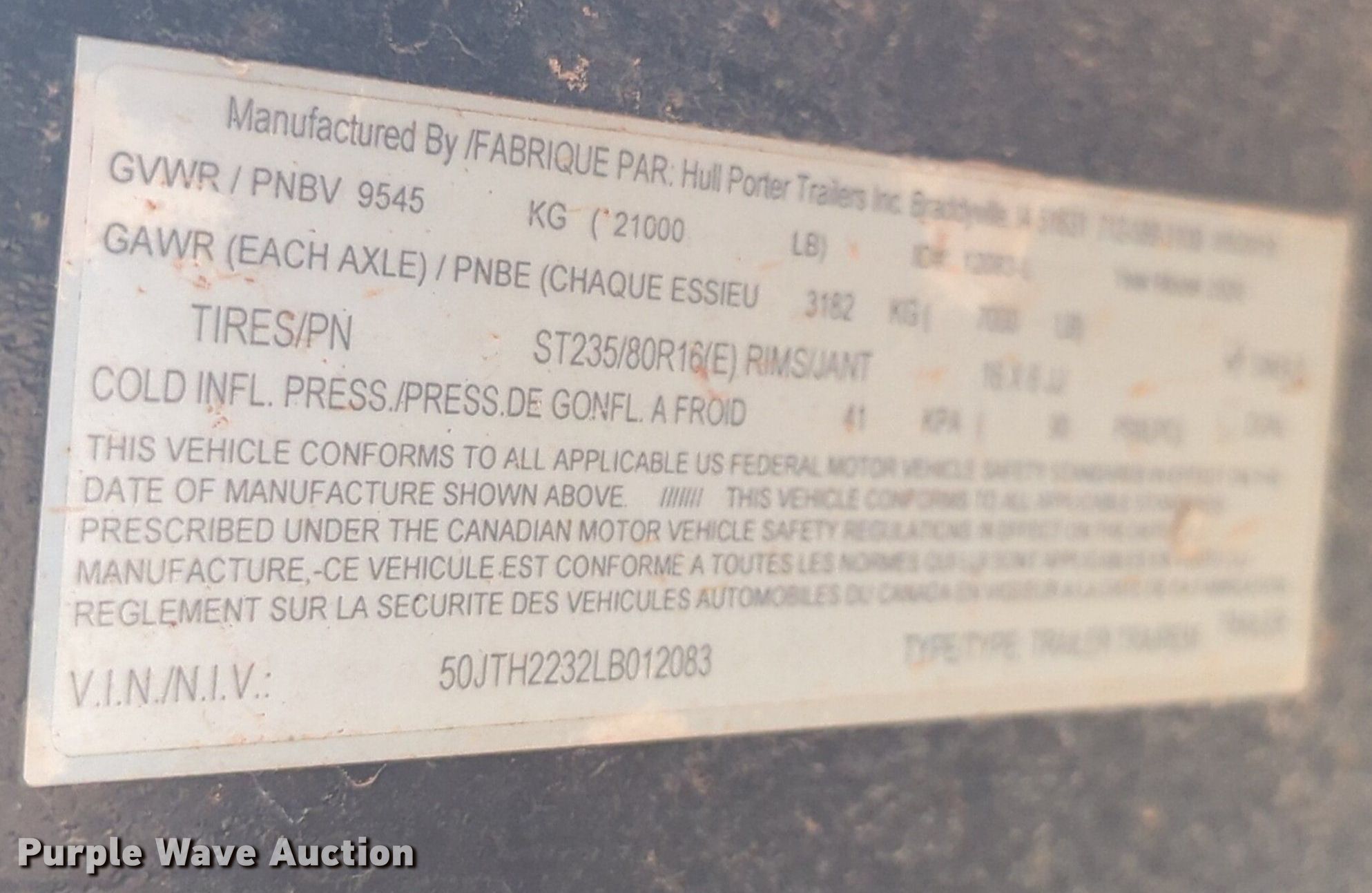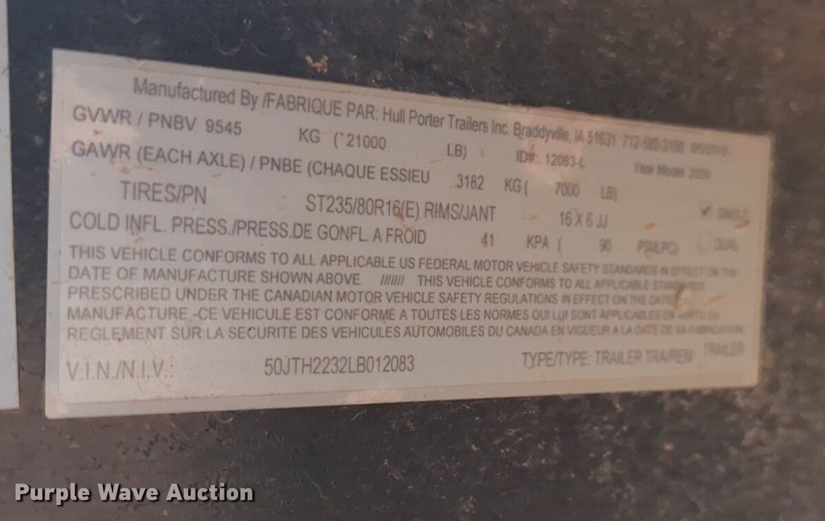 Purple Wave is selling a used Car or Utility Trailer in Oklahoma. This item is a Hull Porter Trailers Inc. utility trailer with the following: VIN: 50JTH2232LB012083