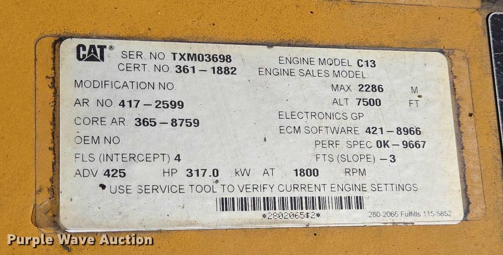 2013 Caterpillar 349EL excavator. Hours: 11,384 on meter, Serial: CAT0349ELTFG00722. Engine Caterpillar C13, Serial: TXM03698, Displacement: 12.5L, Cylinders: 6, Fuel type: Diesel, HP: 425. Transmission Hydrostatic, Two speed travel. Operators station Enclosed cab, AC, Heat, Pattern changer. Features Boom Standard, Stick Stick length: 12' 8", Quick coupler: Hydraulic Caterpillar, Bucket Caterpillar, Width: 74", Teeth: 6. Tracks Width: 35.5", Steel, Grouser pads: Triple. Notes Unknown operating condition of AC. Power Motive Corporation. Denver, CO 80216