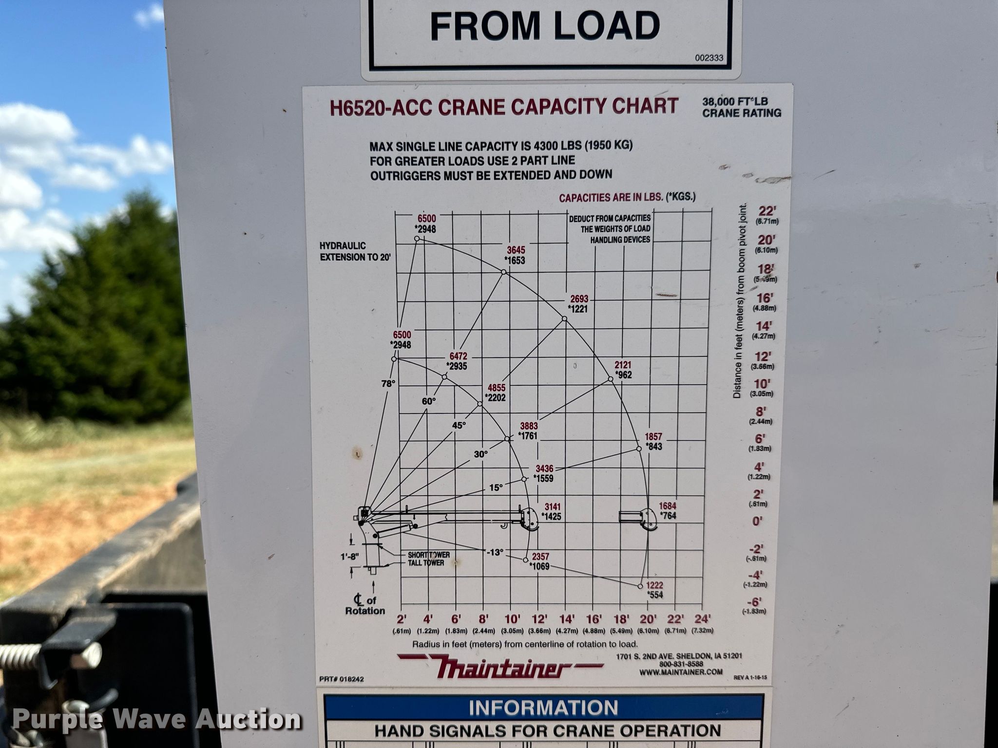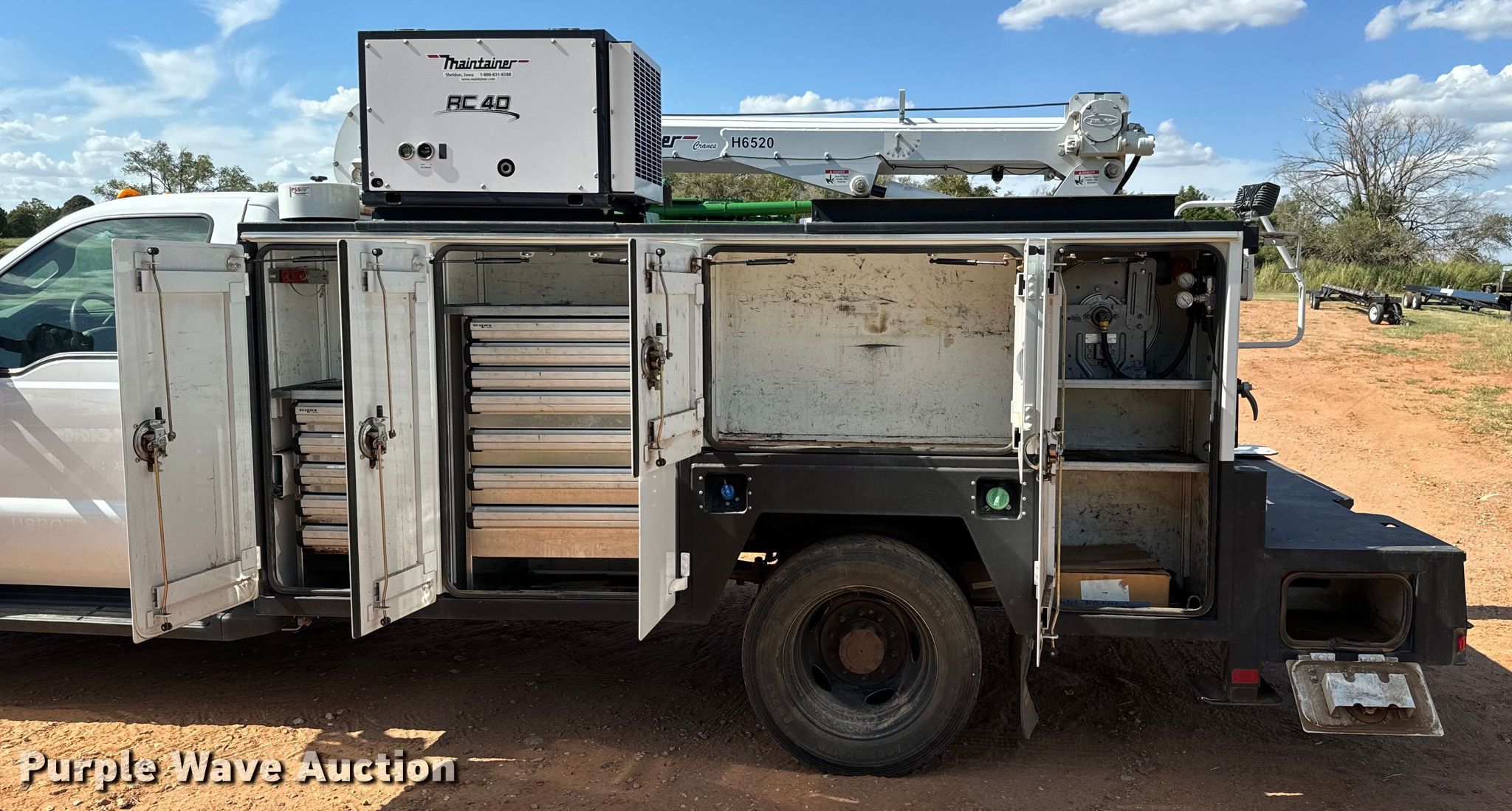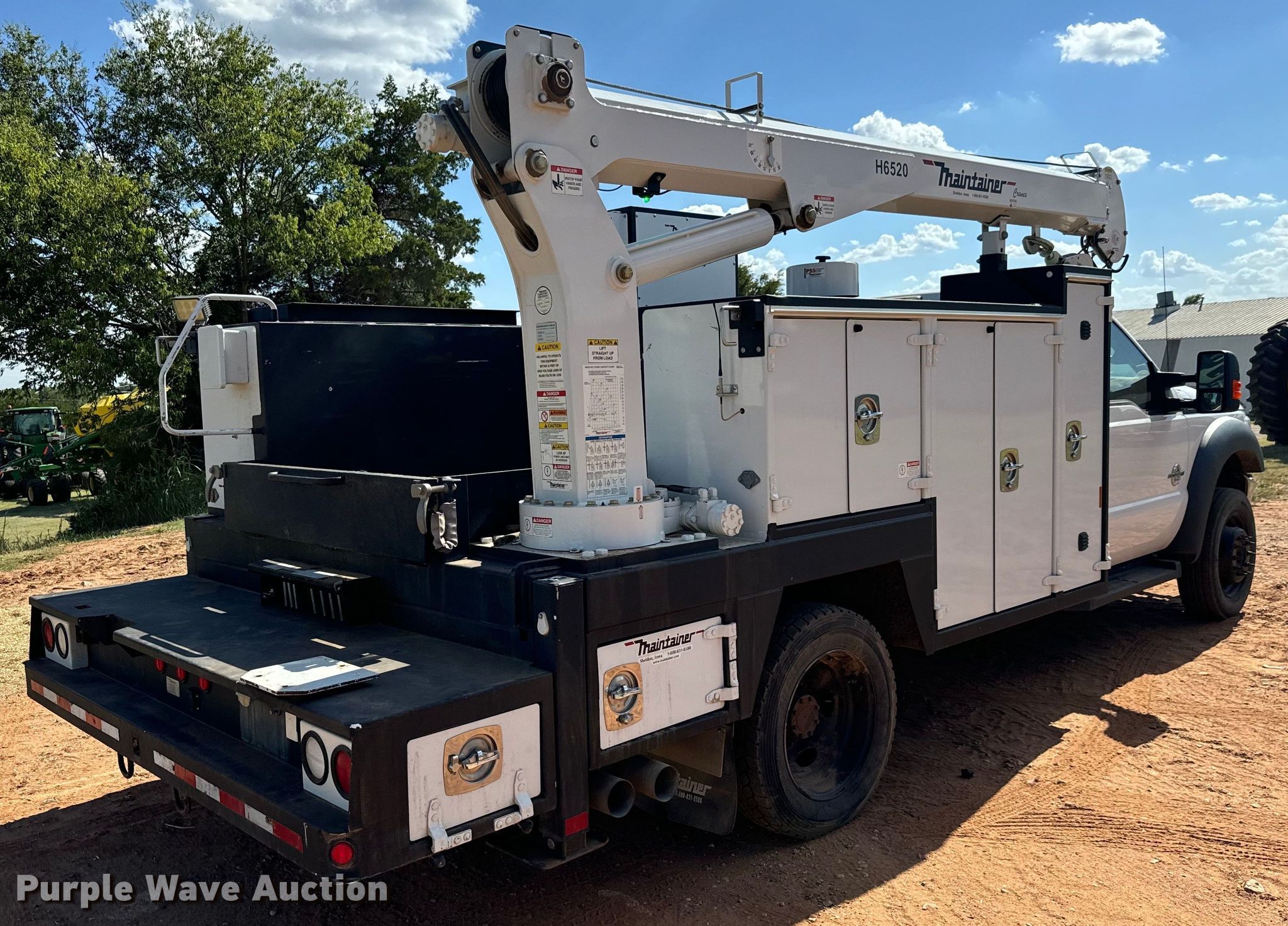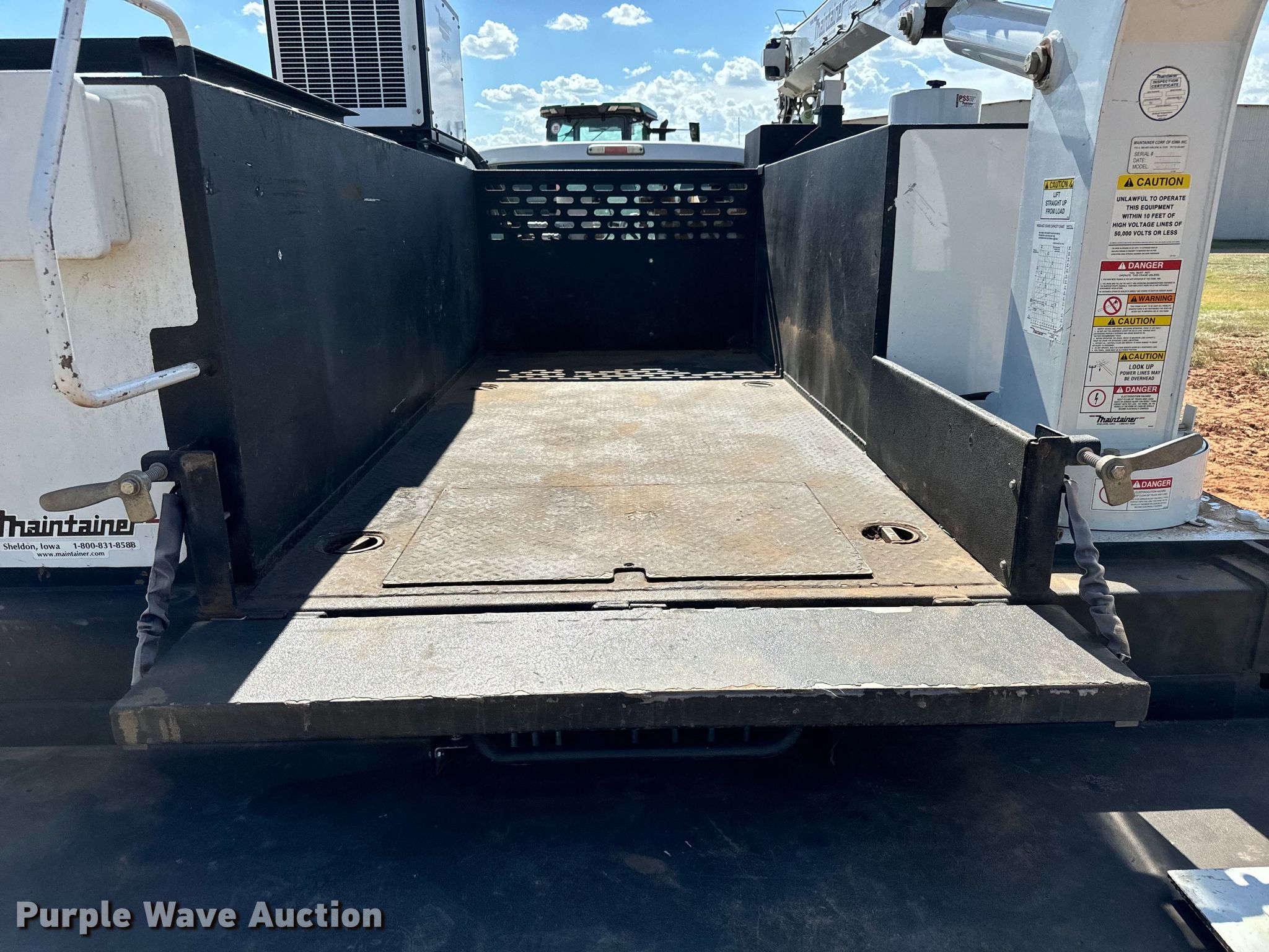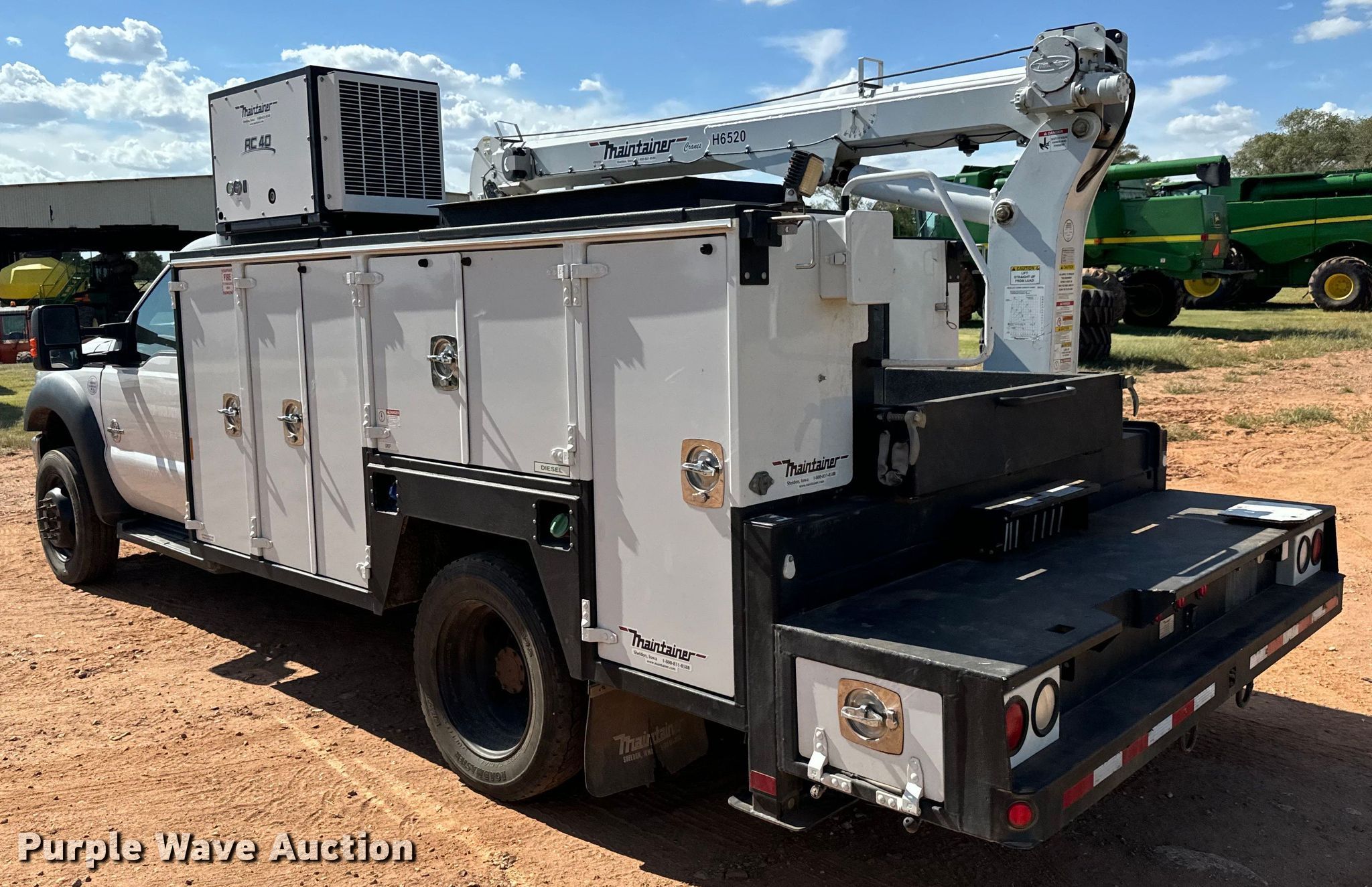 2015 Ford F550 Super Duty XL utility / service truck. Miles: 85,956 on odometer, VIN: 1FDUF5HT3FED43677. Engine Displacement: 6.7L, Cylinders: 8, Fuel type: Diesel. Transmission Automatic. Chassis Four wheel drive, Axles: Single, Suspension: Spring, Brakes: Hydraulic, PTO, GVWR: 19,500 lbs. Interior AC, Heat, Heated mirrors, Power windows, Power locks, Cruise control, Auxiliary controls, Brake controller. Features Bed Maintainer, 13' L x 95" W, Air compressor Maintainer RC40, Hours: 183 on meter, Crane Maintainer H6520, Maximum boom length: 20' Maximum lift capacity: 6,500 lbs.. Tires Size: 225/70R19.5. Kansas title. Title distribution may be delayed up to 14 days from verification of funds. AVE-PLP, Inc. Kingman, KS 67068