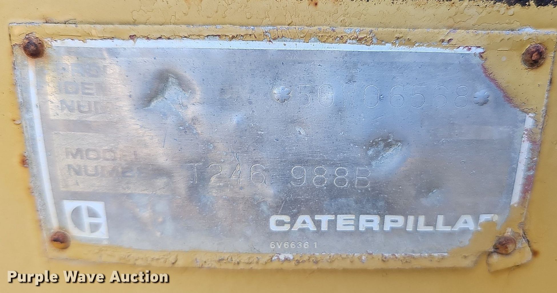 1983 Caterpillar 988B wheel loader. Hours: 27,273 on meter, Serial: 50W06568. Engine Cylinders: 8, Fuel type: Diesel. Transmission Powershift, 4F - 4R. Operators station Enclosed cab, AC, Heat, Bucket controls: Two-lever. Features Bucket Width: 144", Self- leveling bucket, Cutting edge: Bolt-on. Tires Size: 35/65-33. Erlen Group. Green Forest, AR 72638