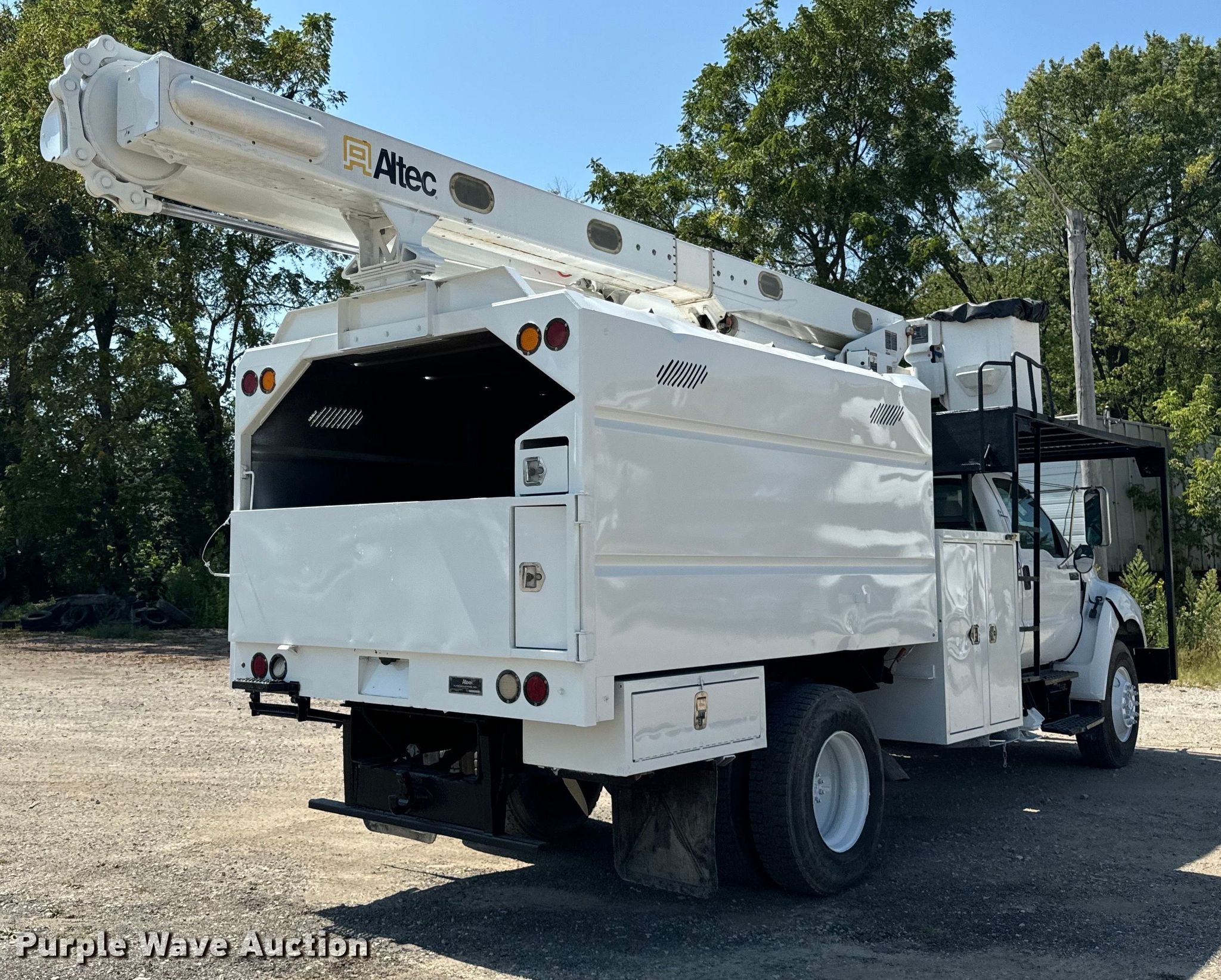 2013 Ford F750 Super Duty XL forestry bucket truck. Miles: 49,695 on odometer, VIN: 3FRPF7FC1DV766052. Engine Cummins, Displacement: 6.7L, Cylinders: 6, Fuel type: Diesel. Transmission Manual, Speed: 6. Chassis Axles: Single, Suspension: Spring, Brakes: Hydraulic, PTO, GVWR: 33,000 lbs. Interior Heat, Cruise control, Auxiliary controls, Brake controller. Features Bed Altec, 15' L x 96" W, Boom Altec LR756, Serial: 0513FF1105, Mast height: 56', Maximum lift capacity: 400 lbs, Boom type: Articulating, Insulated, Man basket, Boom controls Ground, Platform/ basket, Certification valid through: 07/2023. Tires Size: 11R22.5. Notes Dash warning indicator: Check engine, Service engine. Wisconsin title. Seller is a Wisconsin licensed motor vehicle dealer. The buyer may be required to pay sales tax and/or registration fees to the dealer prior to taking possession. Title will be assigned and distributed by the dealer. Please contact the seller for distribution questions. Bison Motors LTD. Arlington, WI 53911
