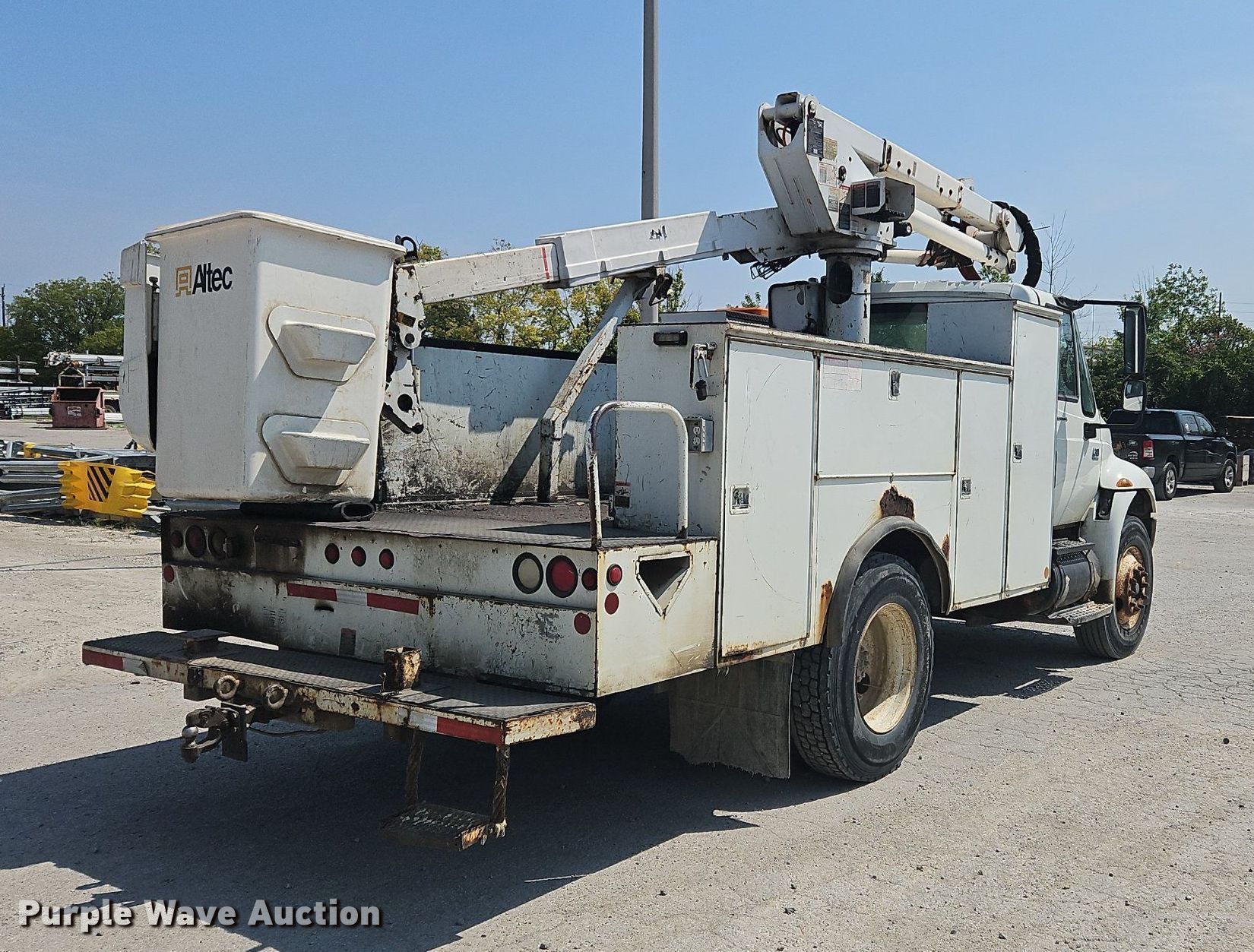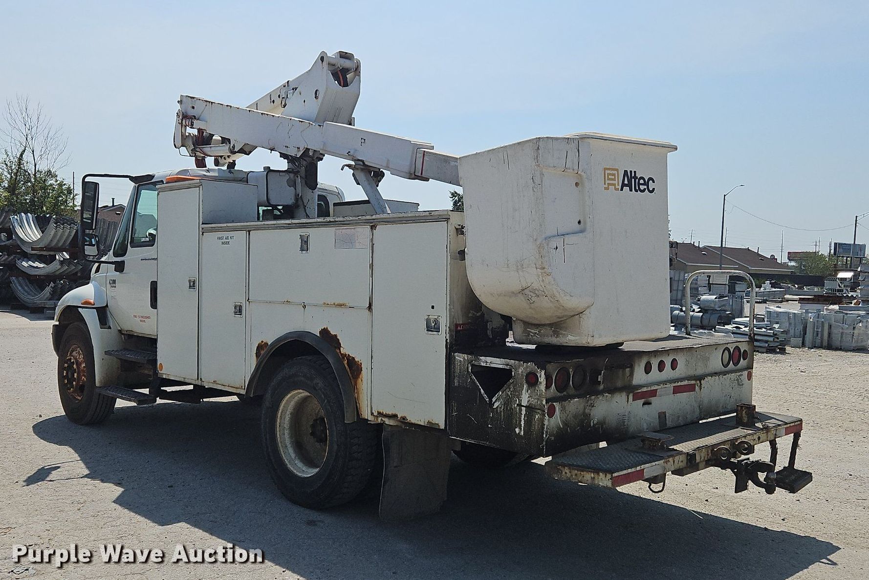 2006 International 4300 bucket truck. Miles: 206,174 on odometer, Hours: 4,542 on meter, VIN: 1HTMMAAM26H187316. Engine International DT466, Displacement: 7.6L, Cylinders: 6, Fuel type: Diesel. Transmission Manual, Speed: 6. Chassis Axles: Single, Suspension: Spring, PTO. Interior AC, Heat. Features Bed Knapheide 6133H640, 13' 5" L x 95" W, Boom Altec AT35-G, Maximum lift capacity: 350 lbs, Maximum lift height: 35.8', Boom type: Insulated, Boom controls Ground, Platform/ basket.. Tires Size: 11R22.5. Notes Non-operational AC or heat, Non-operational bucket, hoses blown. Indiana title. Title distribution may be delayed up to 14 days from verification of funds. James H. Drew Corp.. Indianapolis, IN 46268