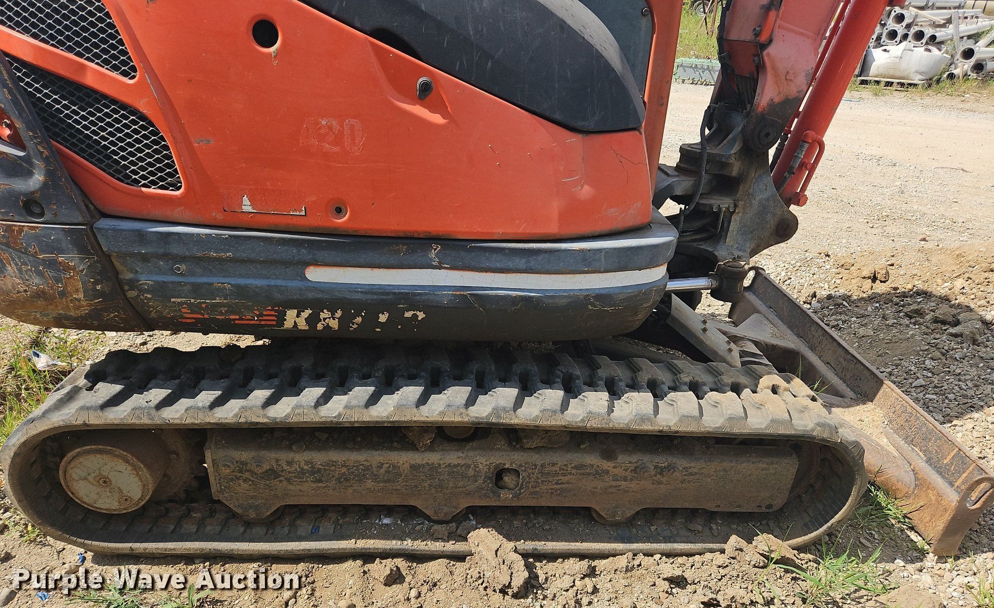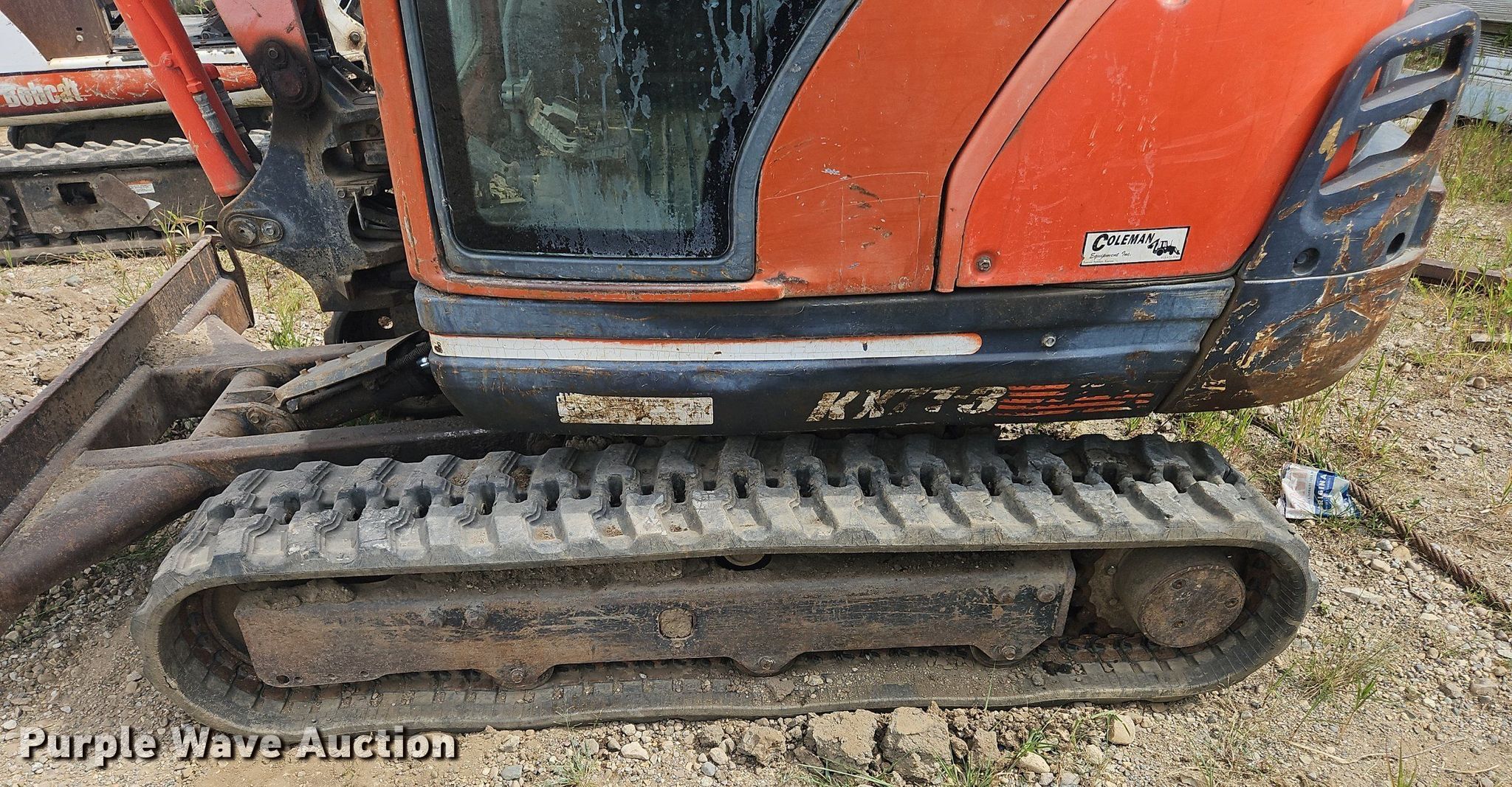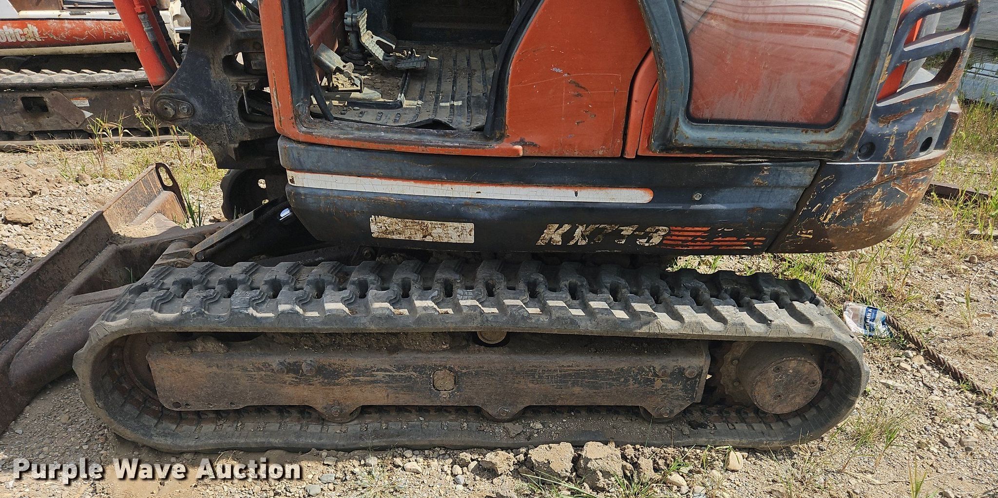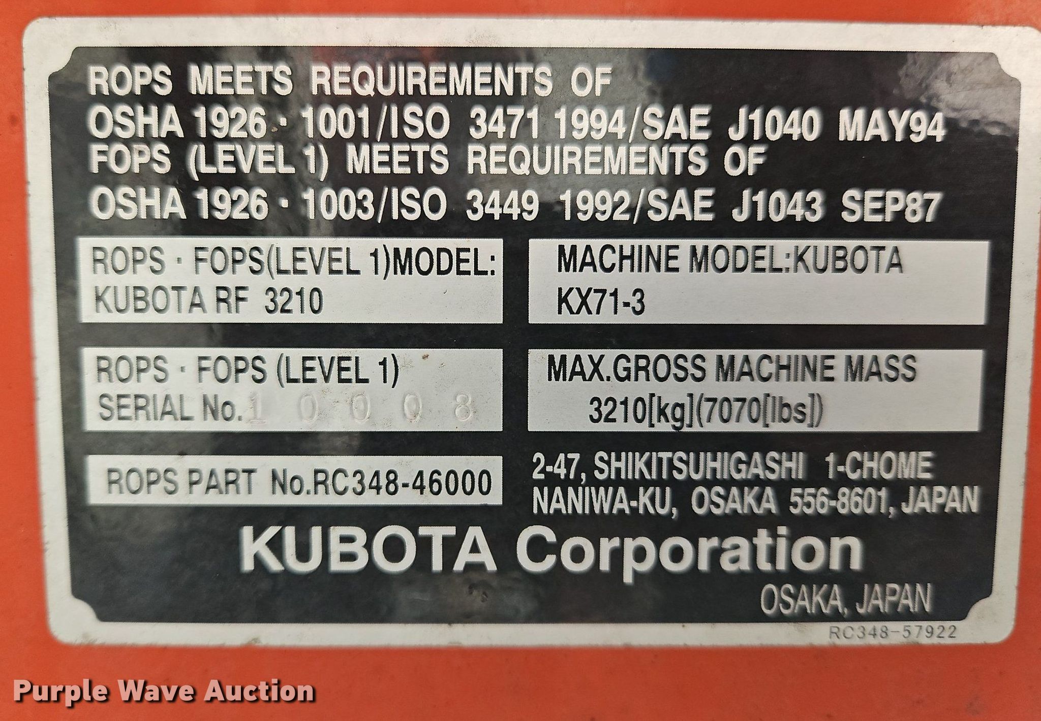 2005 Kubota KX71-3 mini excavator. Hours: 3,440 on meter, Serial: 10070. Engine Kubota DT722, Cylinders: 4, Fuel type: Diesel. Transmission Hydrostatic, Two speed travel. Operators station Enclosed cab. Features Backfill blade Width: 59", Boom Swing, Quick coupler: Mechanical, Bucket Width: 15", Teeth: 3. Tracks Width: 12", Rubber. Notes Non-operational right final drive, Bucket tooth missing. James H. Drew Corp.. Indianapolis, IN 46217