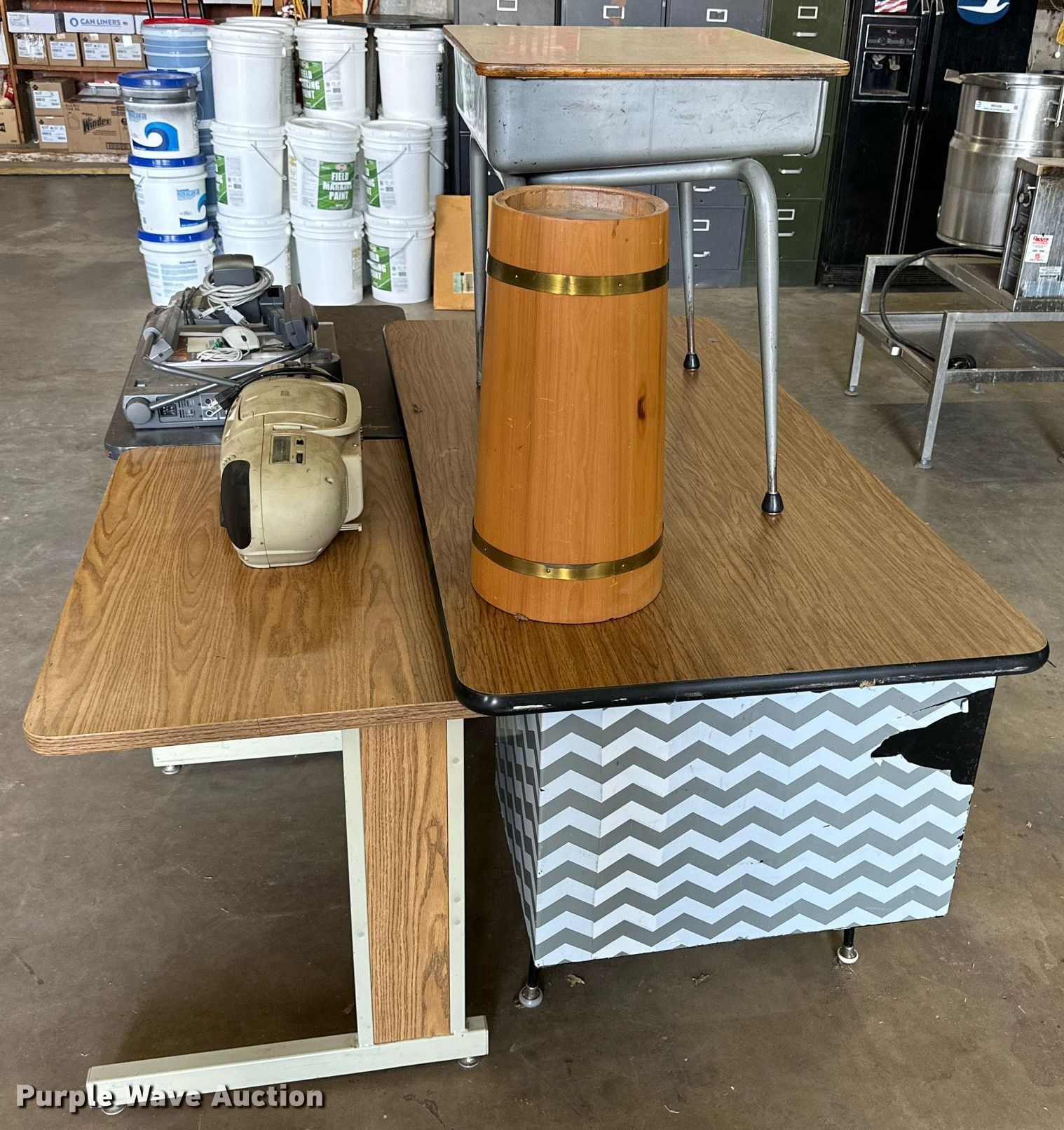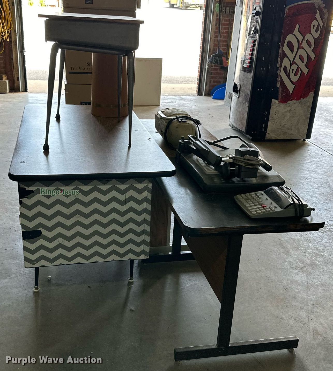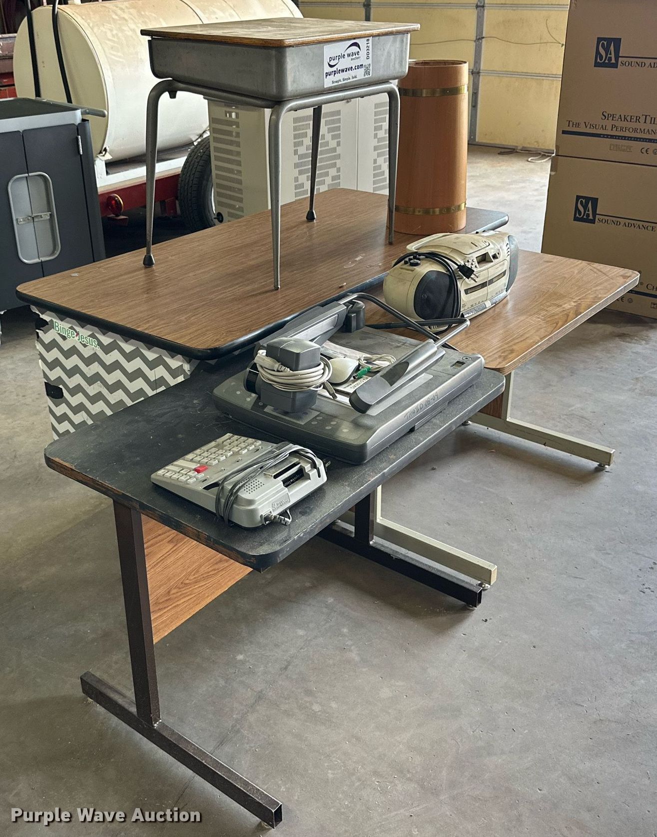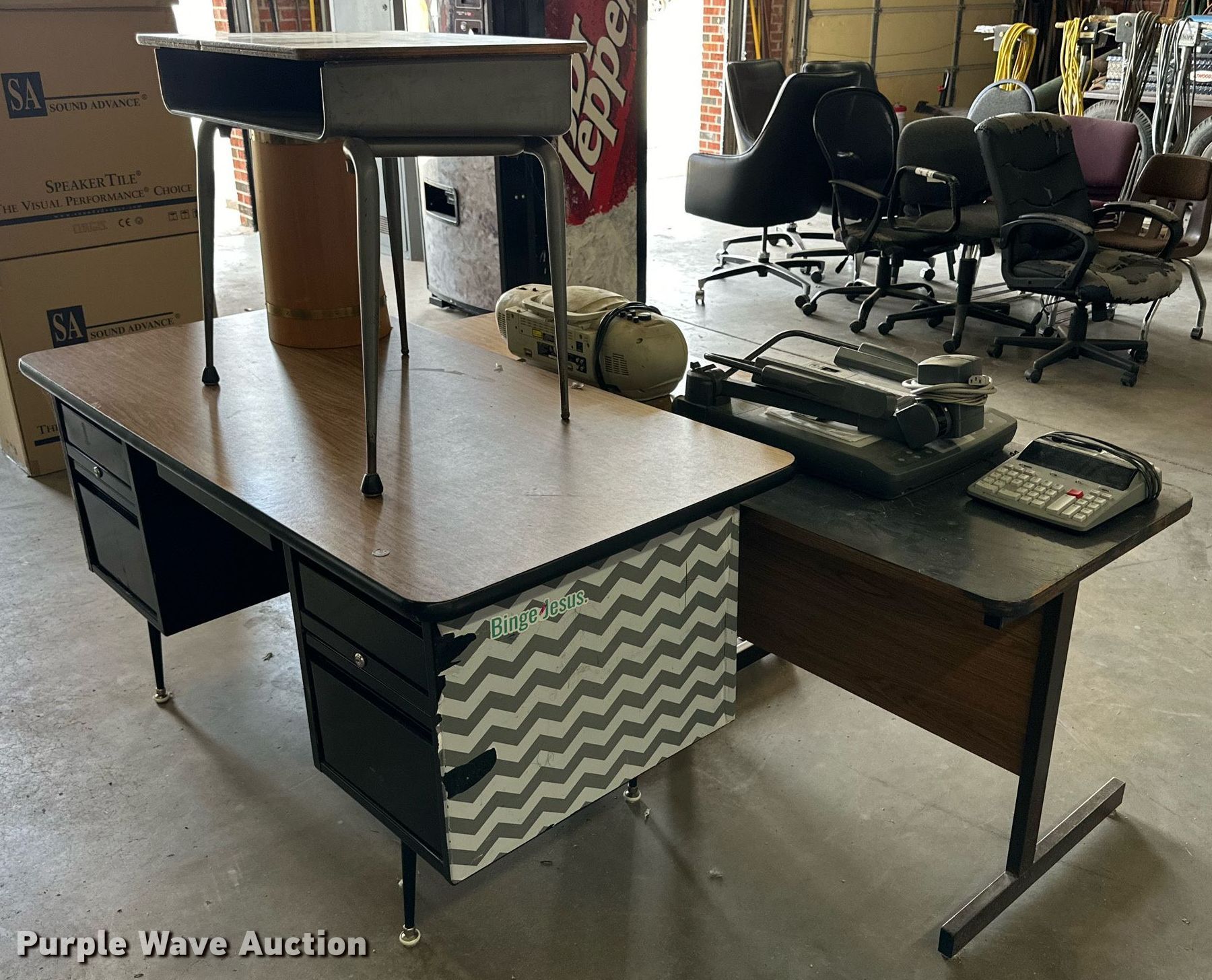 Purple Wave is selling a used Furniture in Oklahoma. This item is a Furniture with the following: (3) desks, Elmo stereo, Adding machine