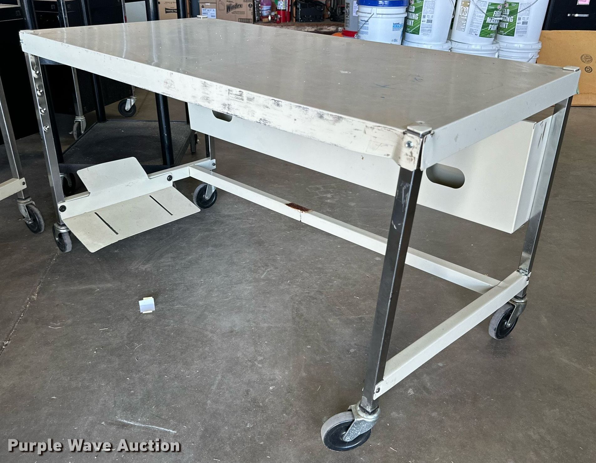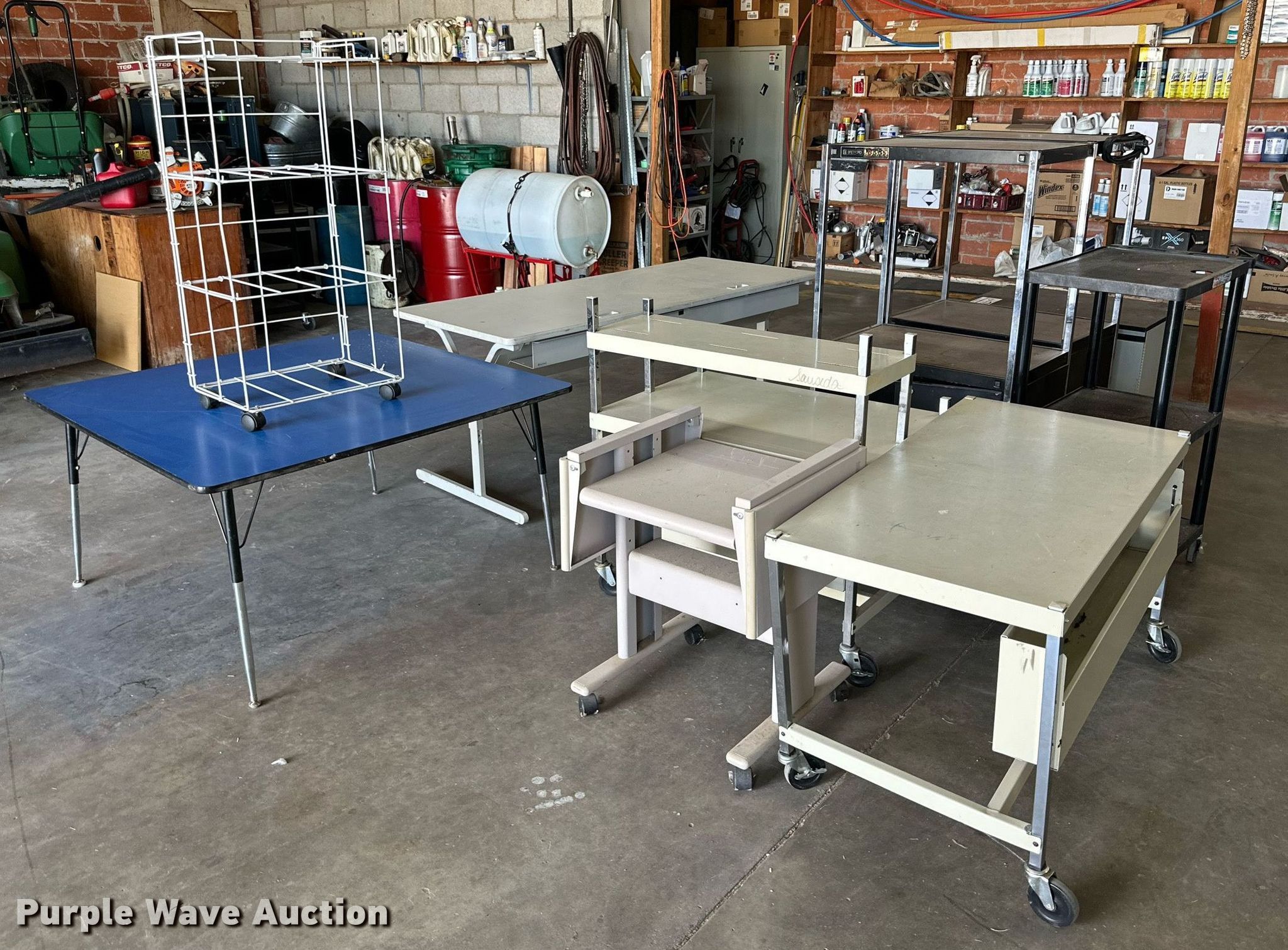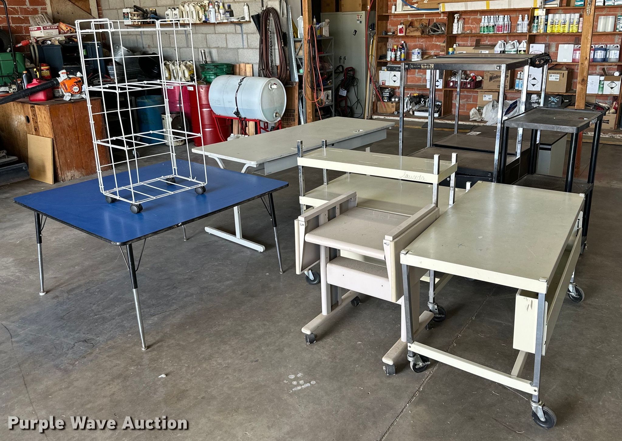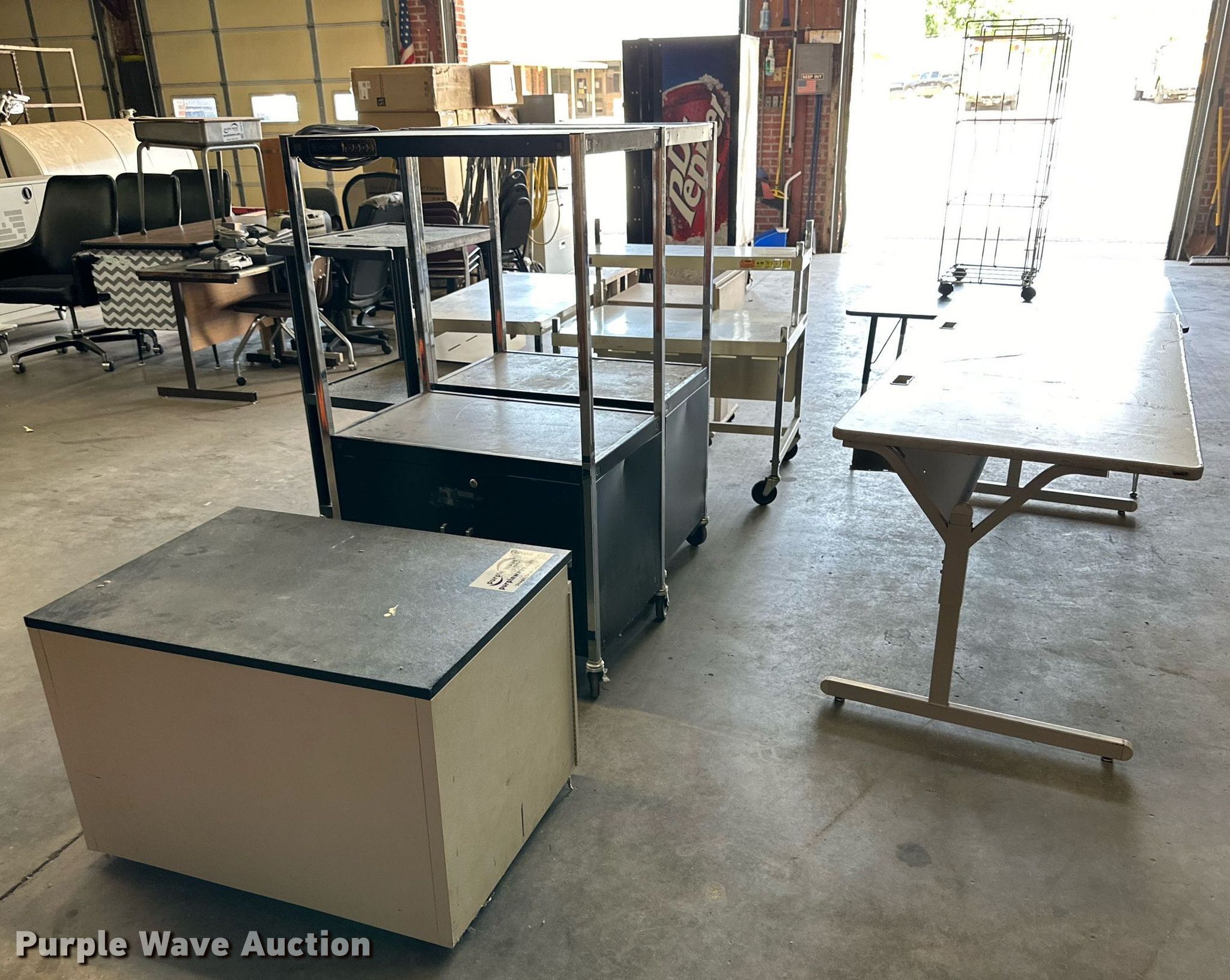Purple Wave is selling a used Furniture in Oklahoma. This item is a Furniture with the following: (5) rolling carts, (2) tables, Metal cabinet