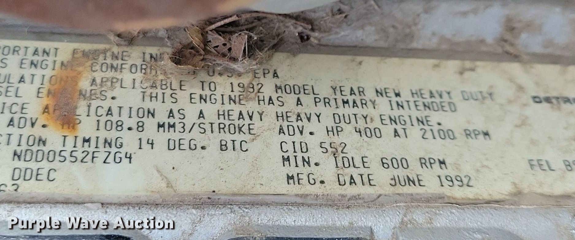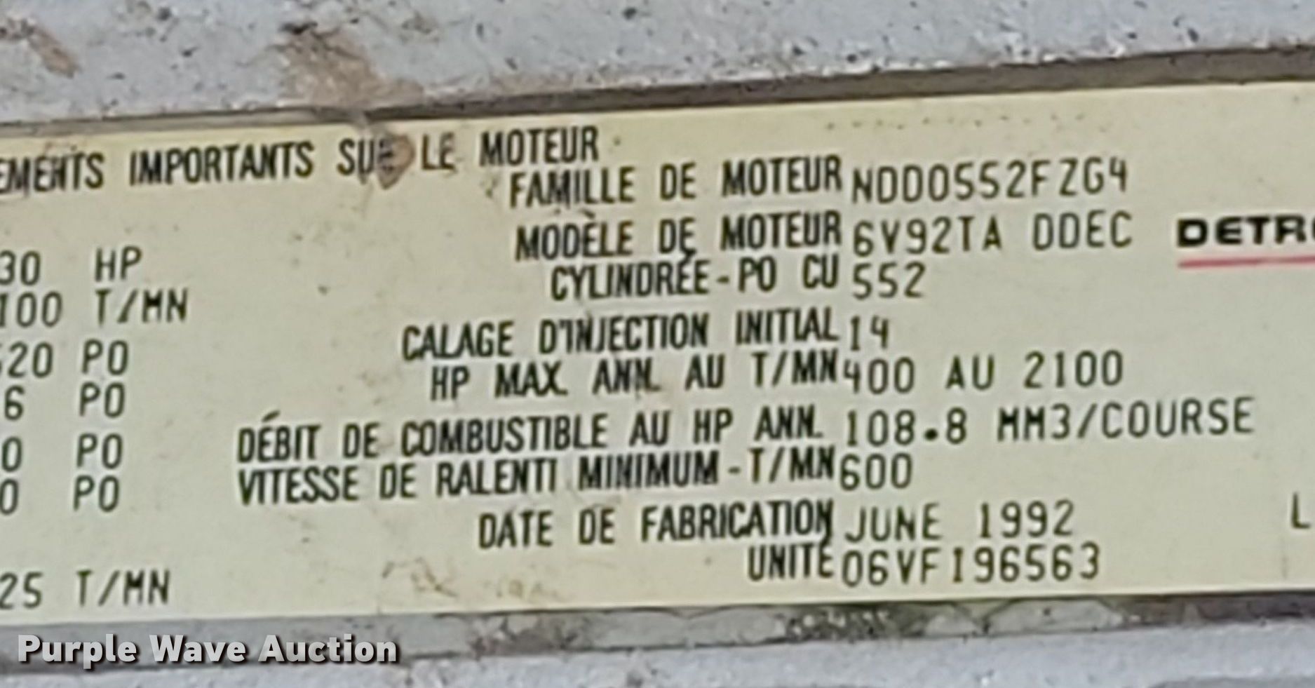 1992 Oshkosh HB2518-MP3 snowblower truck. Miles: Unknown, VIN: 10T3E1BX7N1046176. Engine No engine. Secondary Engine Detroit Diesel, Cylinders: 6, Displacement: 552 C.I.D., HP: 400. Transmission Automatic. Chassis Four wheel drive, Axles: Single, Suspension: Spring, Brakes: Air, GVWR: 45,500 lbs FAWR: 27,000 lbs, RAWR: 18,500 lbs. Features Fuel tank: Dual. Notes Parts missing, Snow blower missing, Non-operational unit. South Dakota title. Mileage has not been verified. Exempt will be written in the odometer disclosure on the title. Title distribution may be delayed up to 30 days from verification of funds. Huron, SD 57350