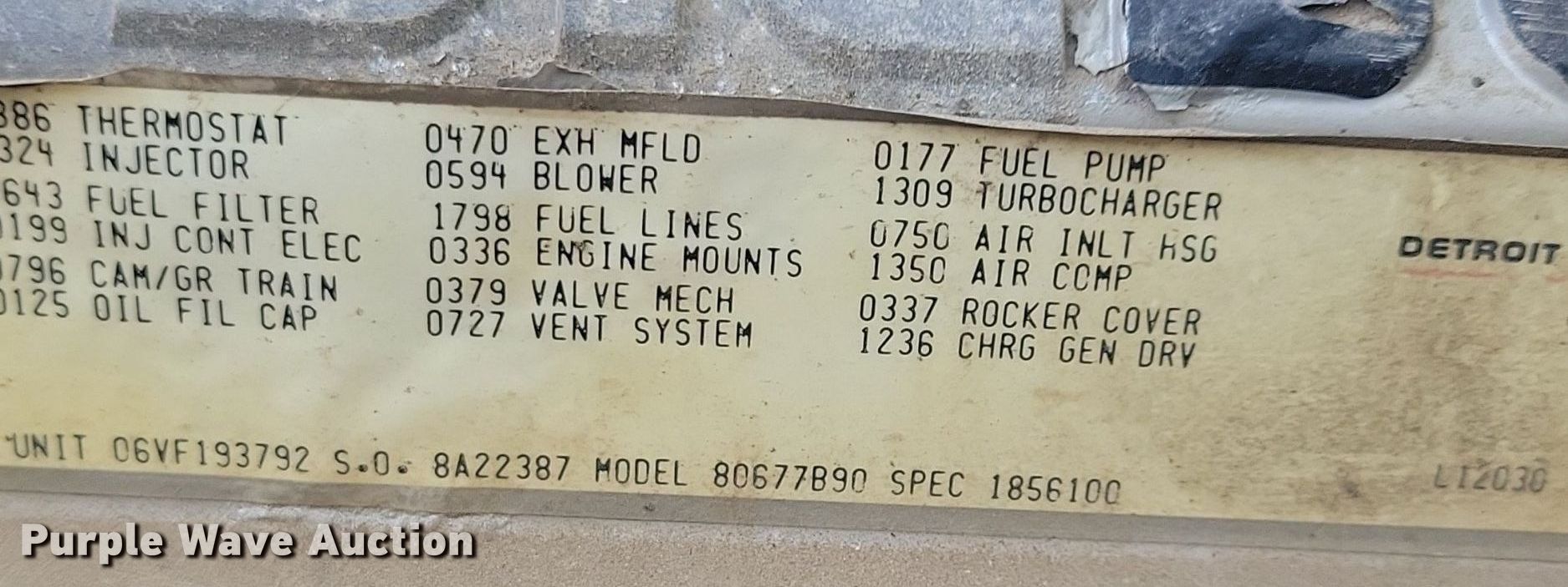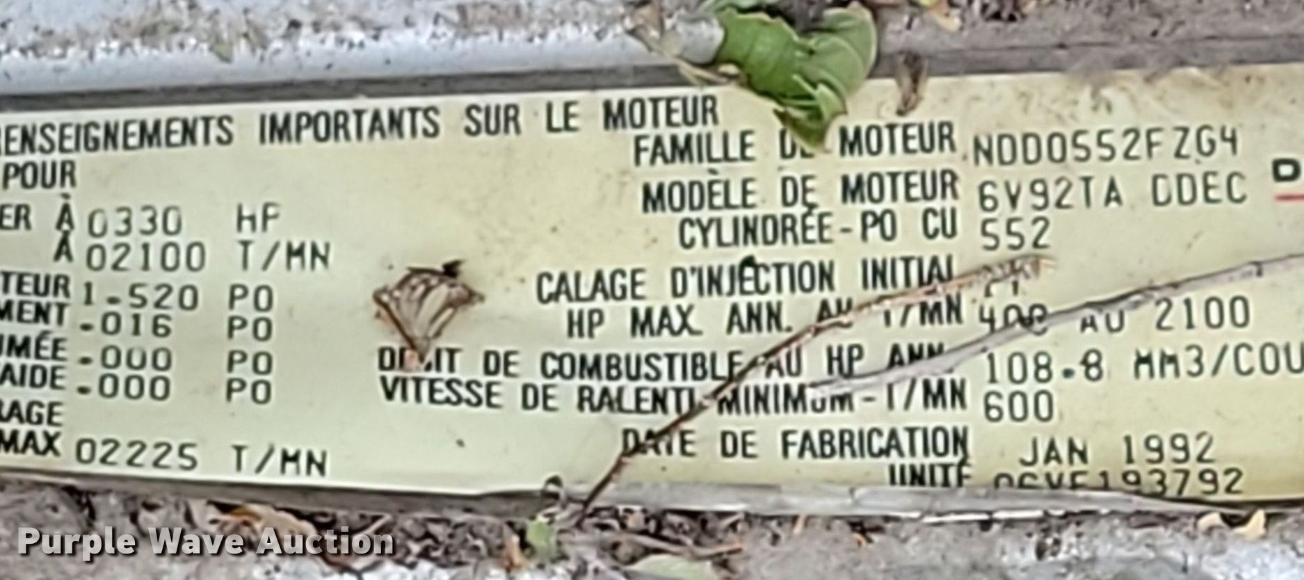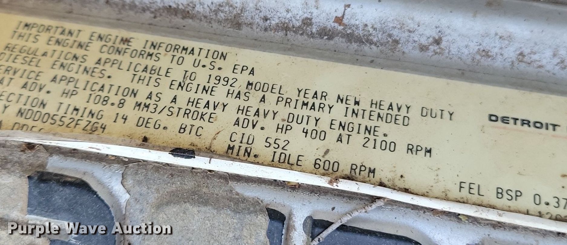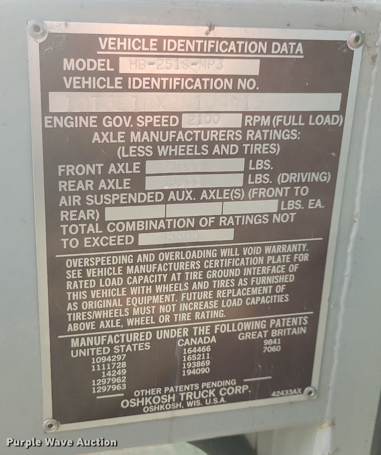 1992 Oshkosh HB2518-MP3 snow blower truck. Miles: Unknown, VIN: 10T3E1BX2N1044156. Engine Detroit Diesel 6V92TA, Displacement: 552 C.I.D., Cylinders: 8, Fuel type: Diesel, HP: 400. Secondary Engine Detroit Diesel 6V92TA, Displacement: 552 C.I.D., Cylinders: 6, HP: 400. Transmission Automatic. Chassis Four wheel drive, Axles: Single, Suspension: Spring, Brakes: Air, GVWR: 45,500 lbs FAWR: 27,000 lbs, RAWR: 18,500 lbs. Features Fuel tank: Dual. Tires Size: 395/85R20. Notes Parts missing, Snowblower missing, Non-operational unit. South Dakota title. Mileage has not been verified. Exempt will be written in the odometer disclosure on the title. Title distribution may be delayed up to 30 days from verification of funds. Huron, SD 57350