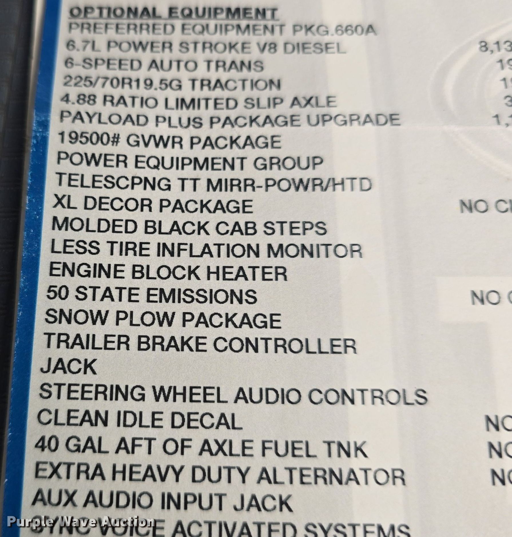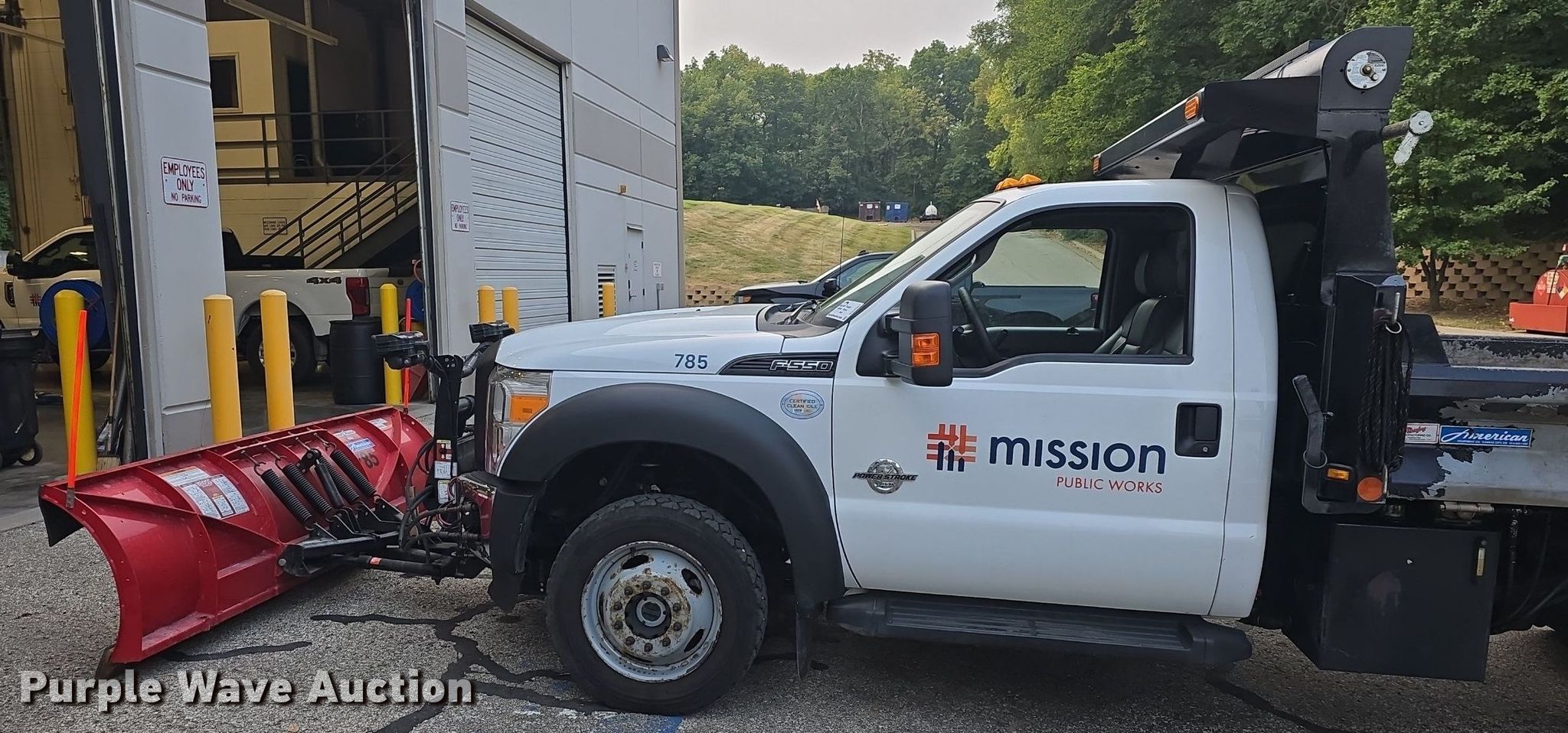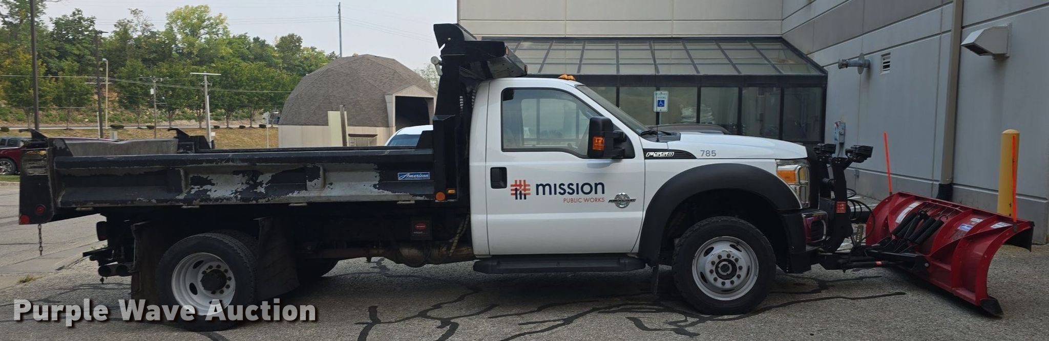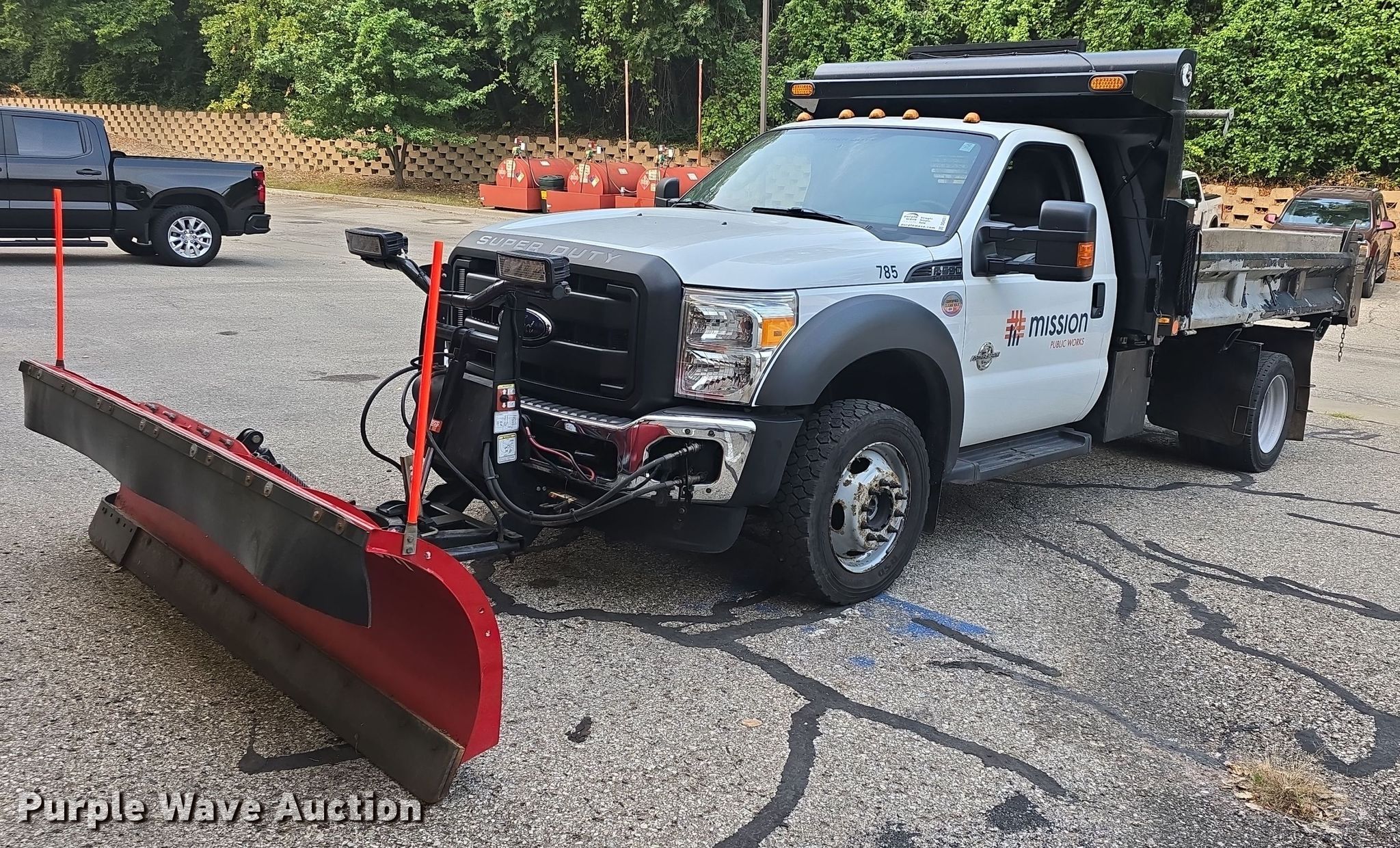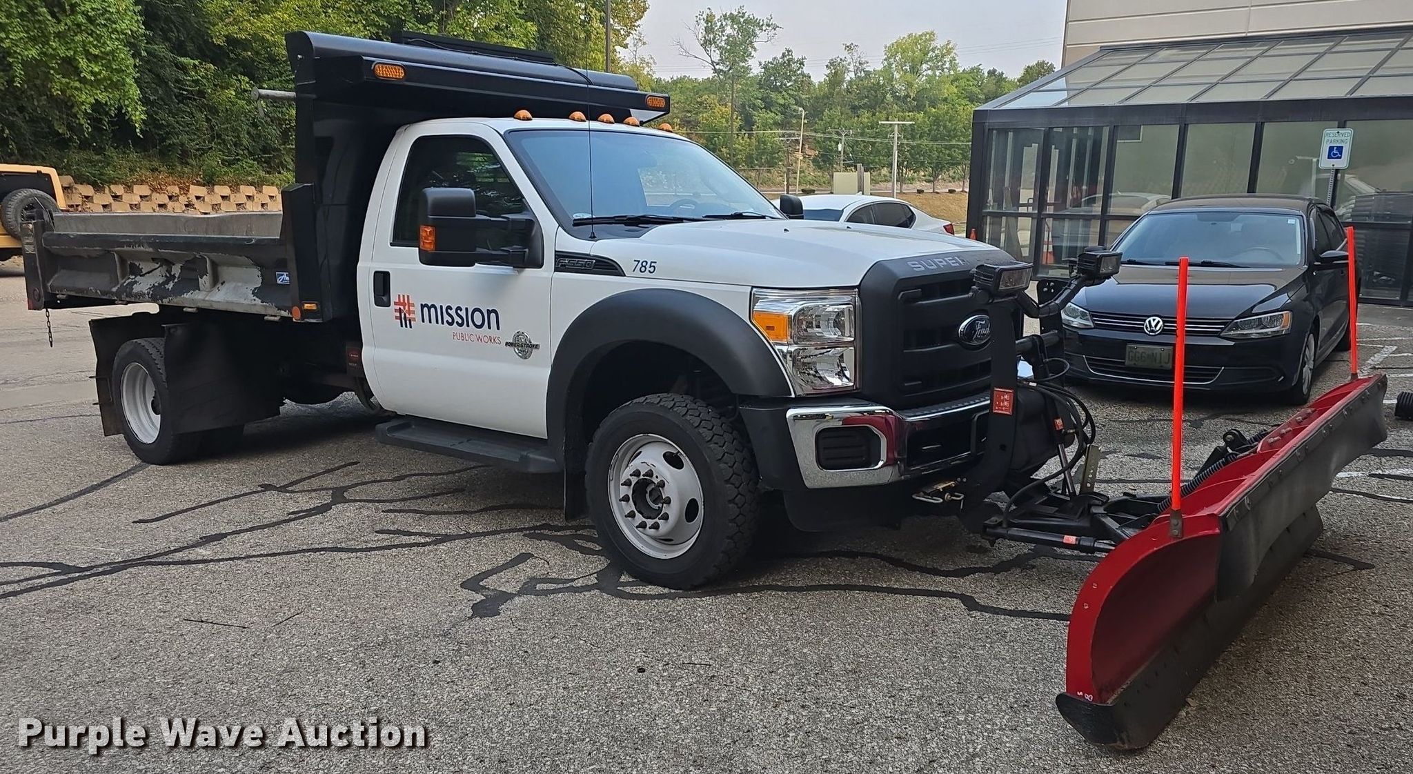 2015 Ford F550 Super Duty XL dump truck. Miles: 35,658 on odometer, VIN: 1FDUF5HT7FEA10785, Unit #: 785. Engine Model: B20 power stroke, Displacement: 6.7L, Cylinders: 8, Fuel type: Diesel. Transmission Automatic. Chassis Four wheel drive, Axles: Single, Suspension: Spring, Brakes: Hydraulic, PTO, GVWR: 19,500 lbs FAWR: 7,000 lbs, RAWR: 14,706 lbs, Wheelbase: 165". Interior AC, Heat, Heated mirrors, Power windows, Cruise control, Brake controller. Features Dump bed Rugby 338217, 11' L x 8' W, Side height: 12", Bed type: Steel, Roll tarp, End gate: Manual, Plow Boss RT3 straight, Width: 102". Tires Size: 225/70R19.5. Notes Decals will be removed prior to auction. Kansas title. Title distribution may be delayed up to 14 days from verification of funds. City of Mission. Mission, KS 66202