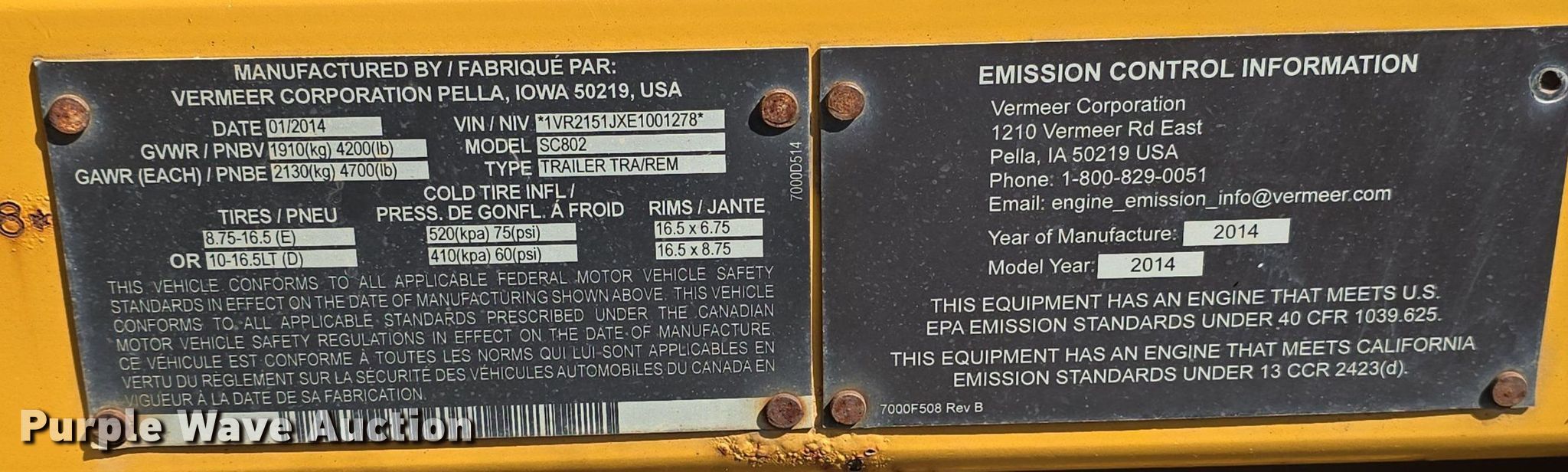2014 Vermeer SC802 stump grinder. Hours: 1,481 on meter, VIN: 1VR2151JXE1001278, Unit #: 51-68. Engine Cylinders: 4, Fuel type: Diesel. Features Cutting head diameter: 28" Bolt-on teeth. Tires Size: Unreadable. Trailer 14' L x 78" W, Axles: Single, Tire size: Unreadable, GVWR: 4,200 lbs, GAWR: 4,700 lbs. Notes Engine issues, oil leaks out of dipstick tube, Flat tires, Non-operational unit. This is worksite support equipment and will not come with a title. Transfer of ownership documentation will be a bill of sale. City of Sioux Falls Street Department- Open Inspection Friday, October 4 11:00 A.M. to 1:00 P.M. Sioux Falls, SD 57104