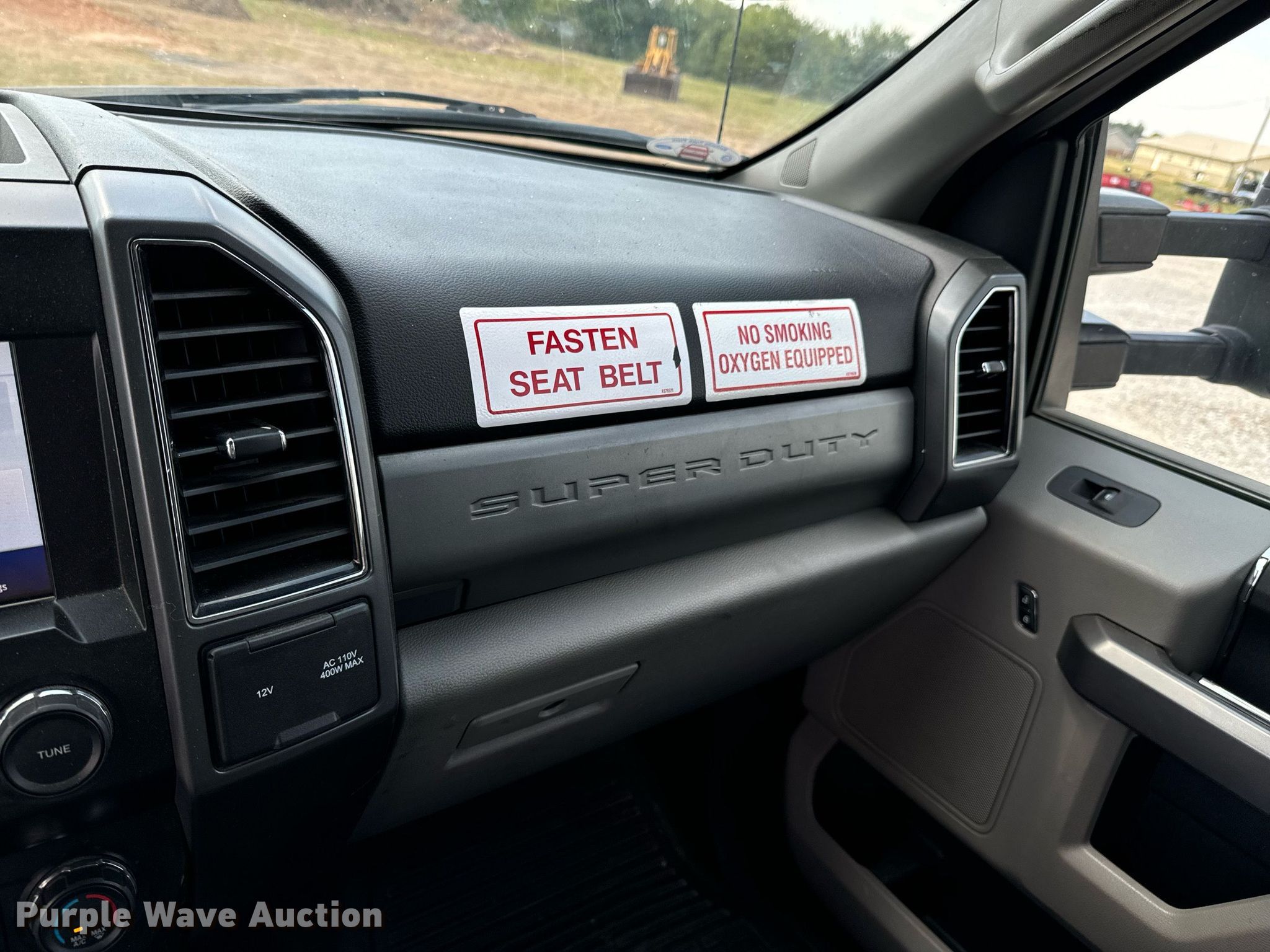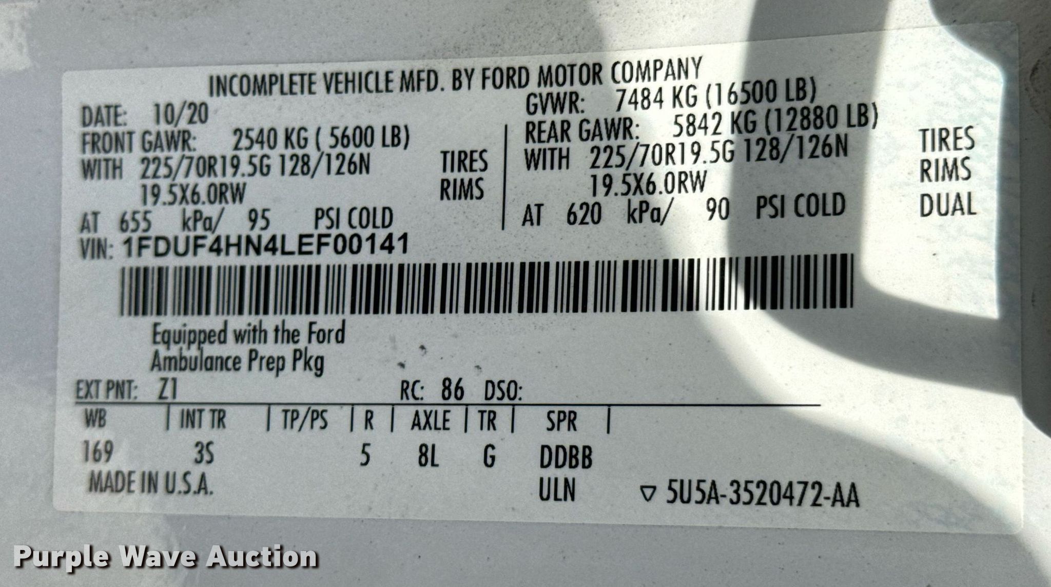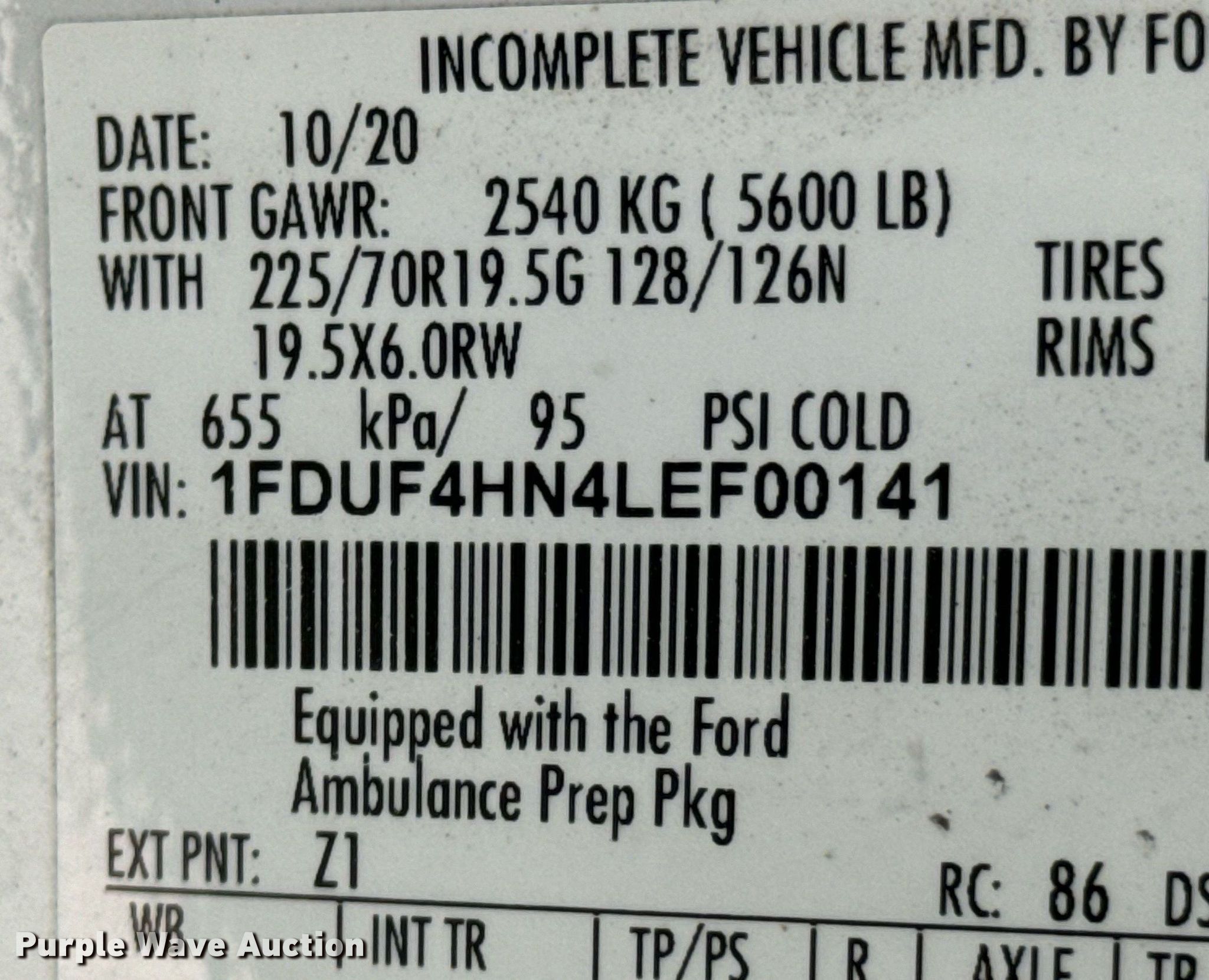 2020 Ford F450 Super Duty XLT flatbed truck. Miles: 186,039 on odometer, VIN: 1FDUF4HN4LEF00141. Engine Displacement: 7.3L, Cylinders: 8, Fuel type: Gas. Transmission Automatic. Chassis Four wheel drive, Axles: Single, Suspension: Spring, Brakes: Hydraulic. Interior AC, Heat, Heated mirrors, Power windows, Power locks, Cruise control, Brake controller. Features Flatbed, Hitch: Gooseneck, Hydraulic raise and lower. Tires Size: 245/70R19.5. Notes Dash warning indicator: Check engine, Fuel cap evaporation sensor issues. Missouri title. Newton County Ambulance District. Neosho, MO 64850