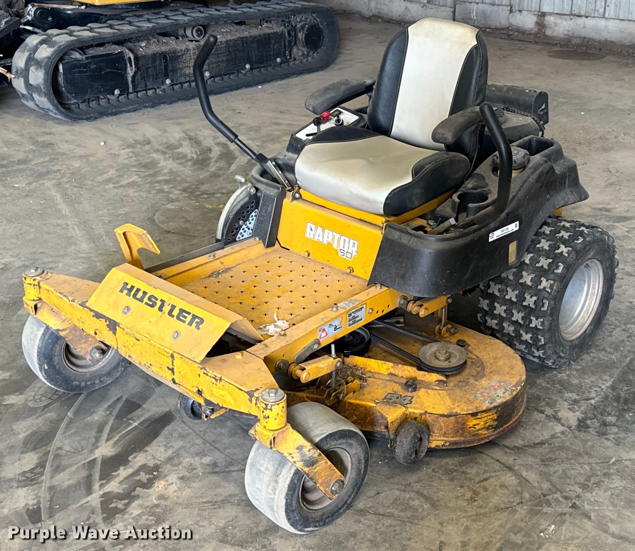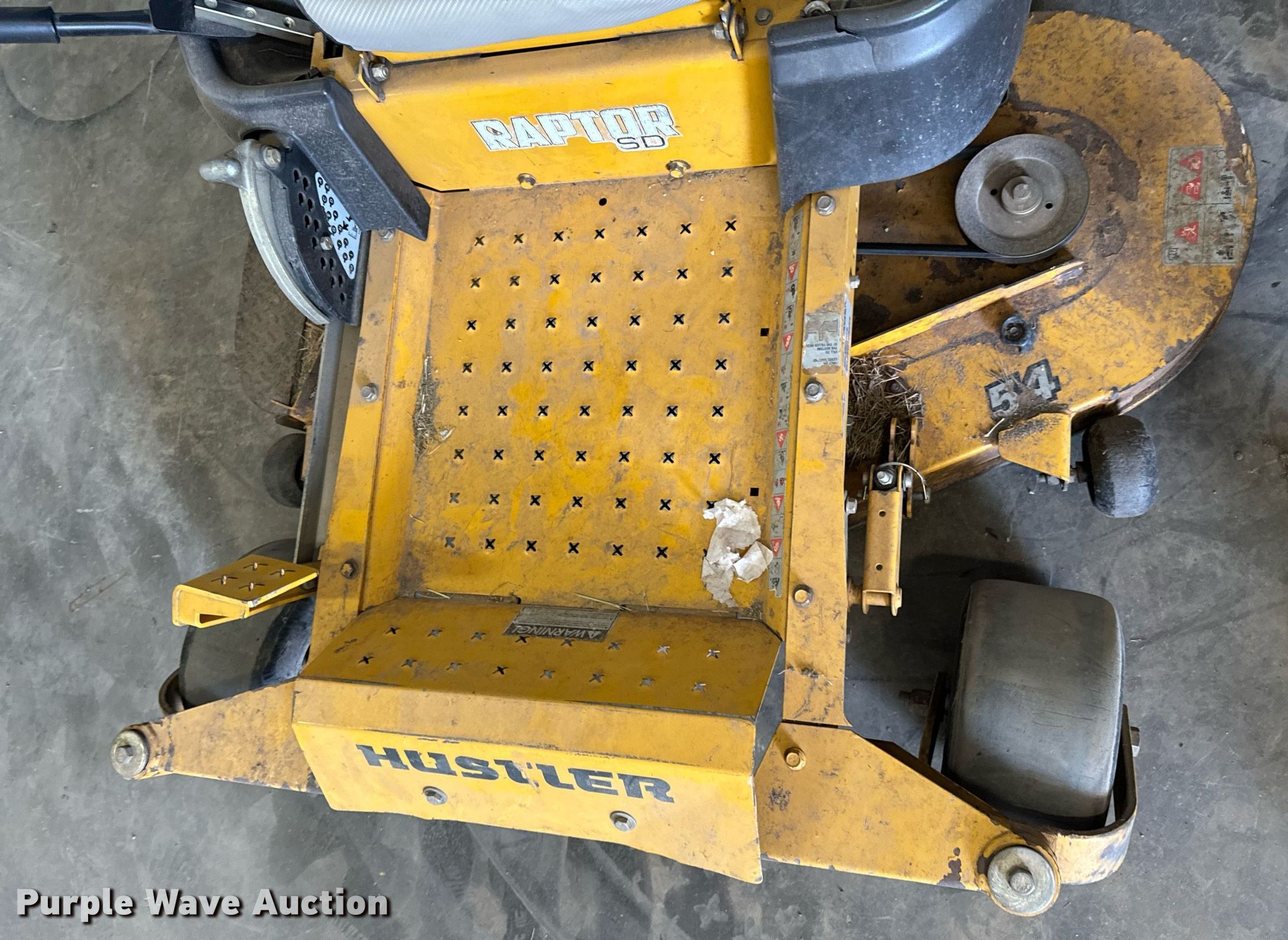 Purple Wave is selling a used Lawn Mower in Oklahoma. This item is a 2017 Hustler Raptor SD ZTR lawn mower with the following: Hours: 762 on meter, Cutting width: 54", Serial: 17037950