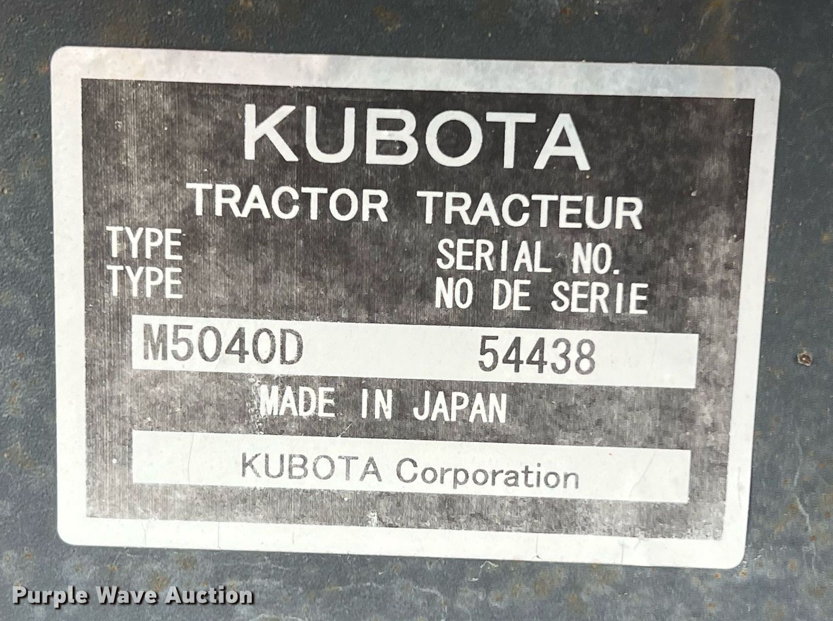 Purple Wave is selling a used Tractor in Texas. This item is a Kubota M5040D MFWD tractor with the following: Hours: 2,854 on meter, Serial: 54438