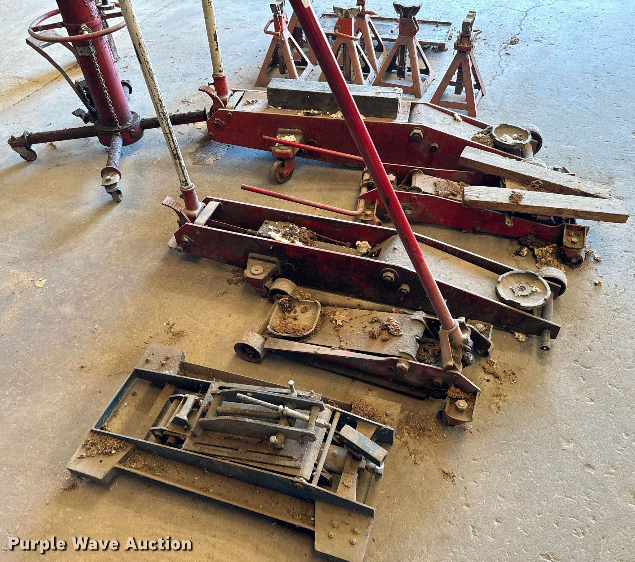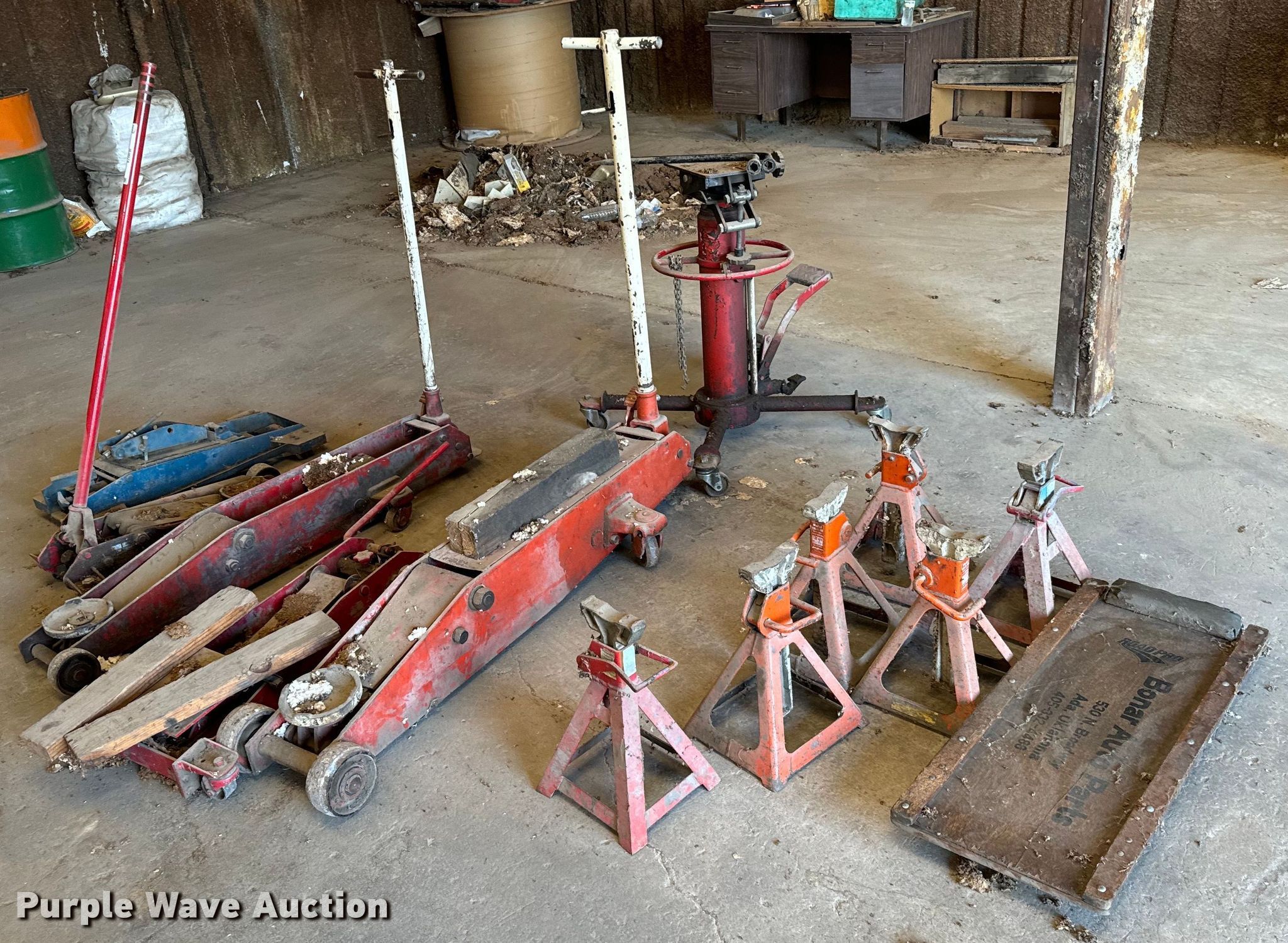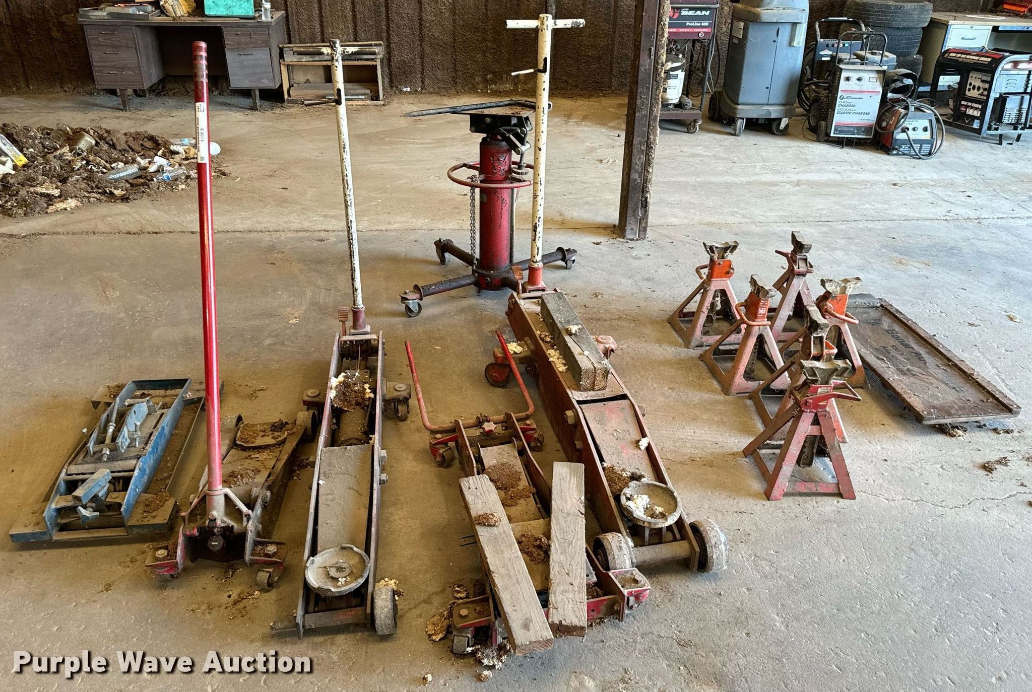 Purple Wave is selling a used Tools in Oklahoma. This item is a Automotive jacks with the following: (5) automotive jacks, (6) jack stands, Transmission stand