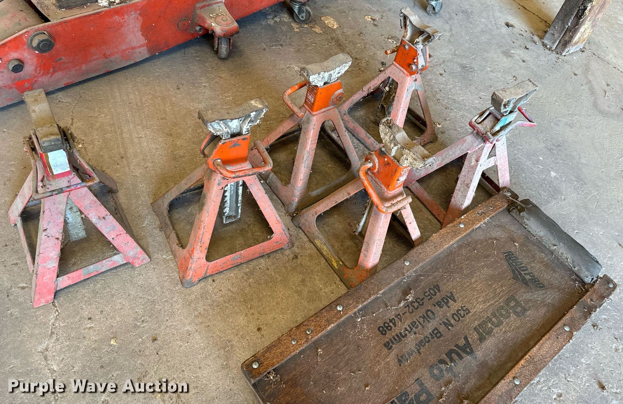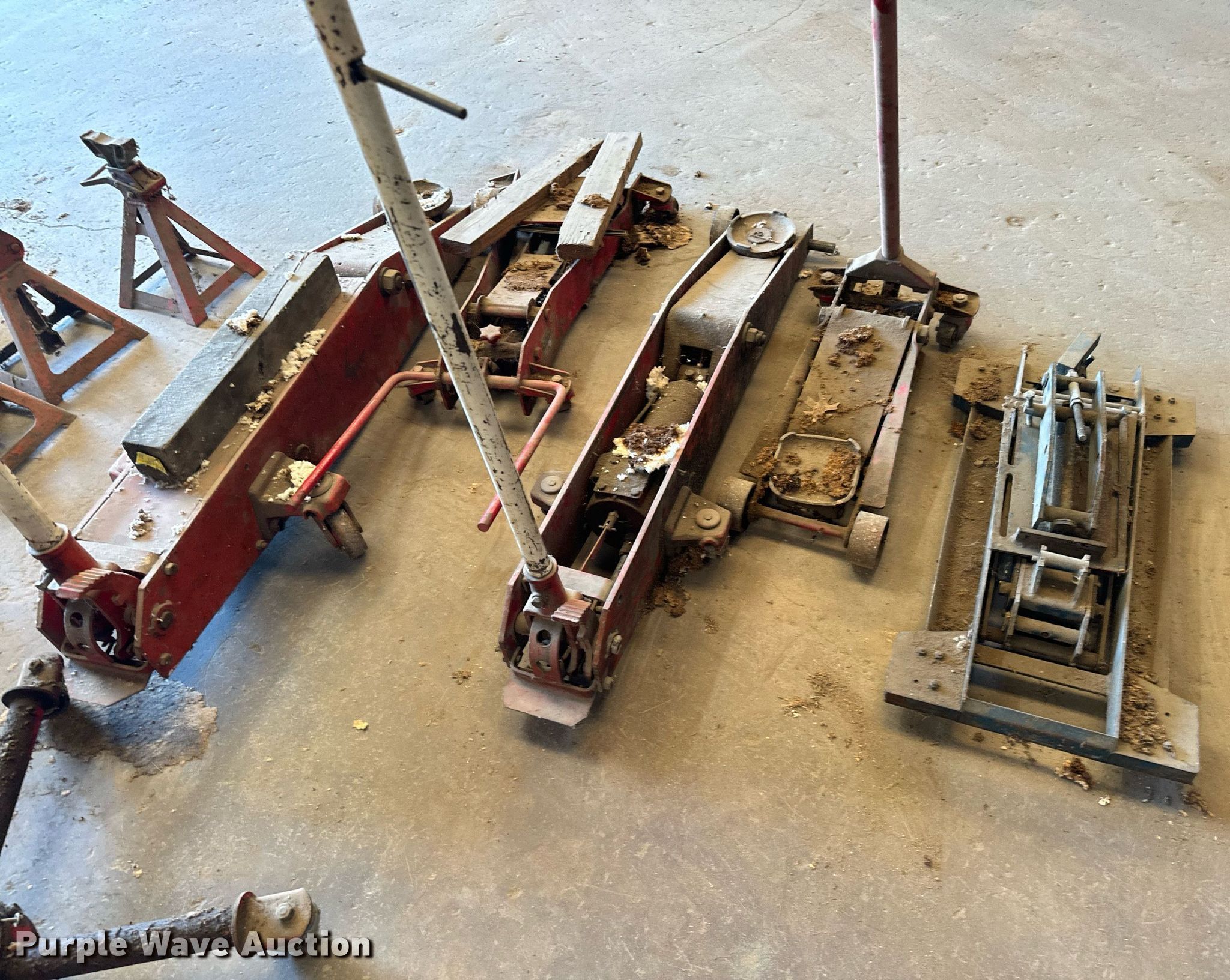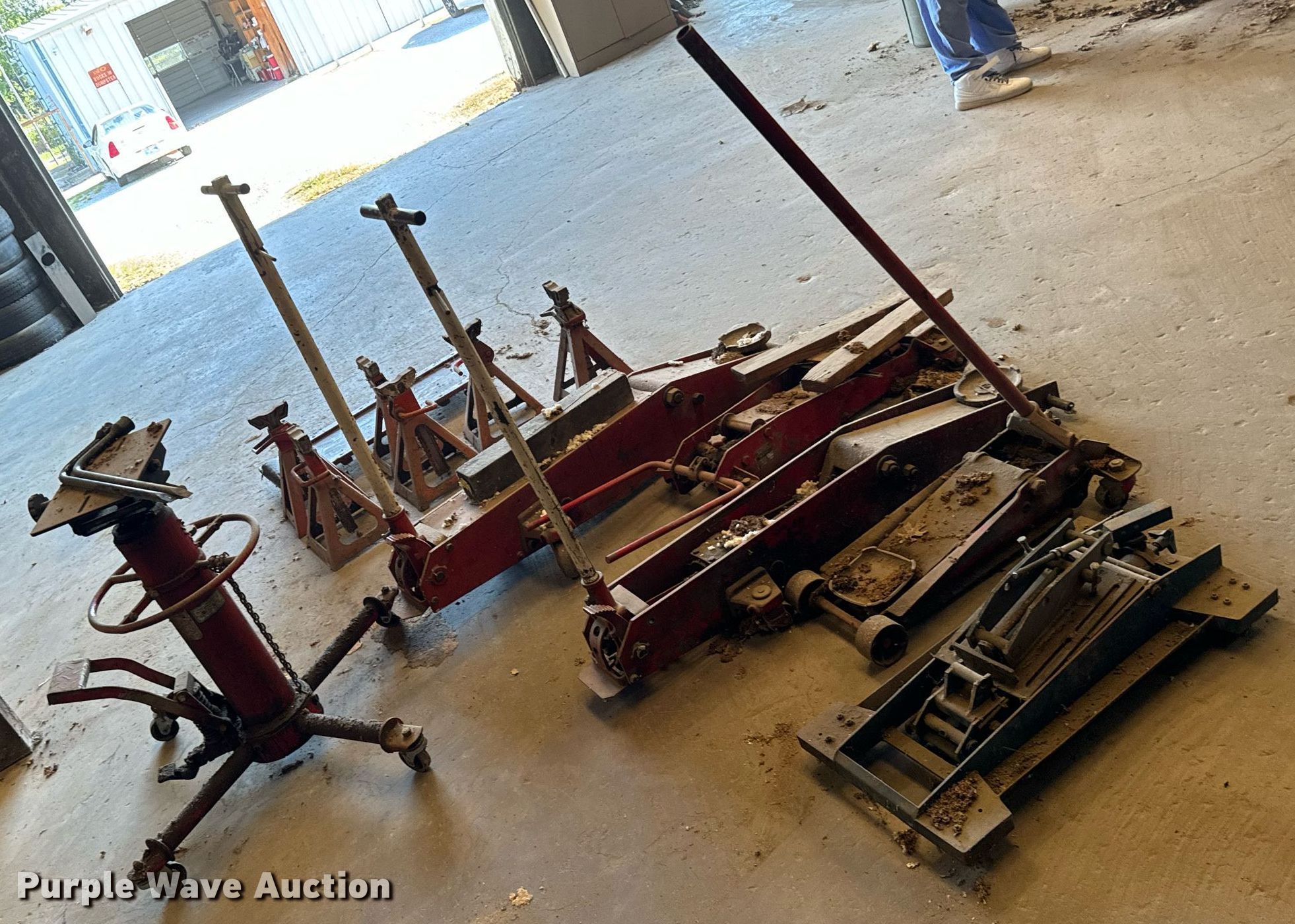 Purple Wave is selling a used Tools in Oklahoma. This item is a Automotive jacks with the following: (5) automotive jacks, (6) jack stands, Transmission stand