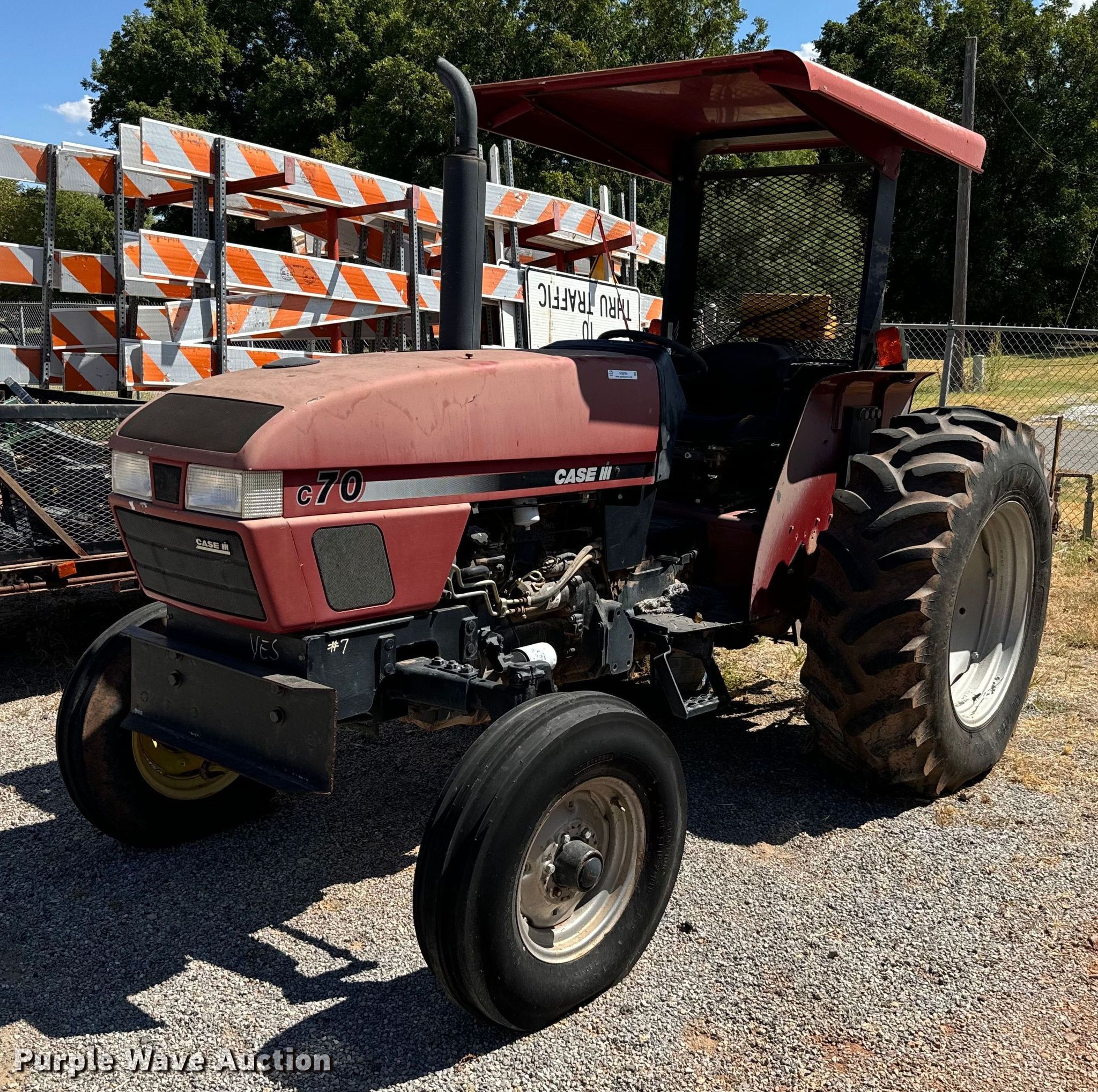 2000 Case C70 tractor. Hours: 1,605 on meter, Serial: C070RN3JJE1015537. Engine Perkins 5772, Serial: AS5Q663U105398G, Cylinders: 4, Fuel type: Diesel. Transmission Manual, 8F - 8R. Features PTO: 540, 1000, Three point, Seven pin outlet. Tires Front: 7.50-16, Rear: 16.9-30. Notes Ignition switch issues. Wichita County, TX. Electra, TX 76360