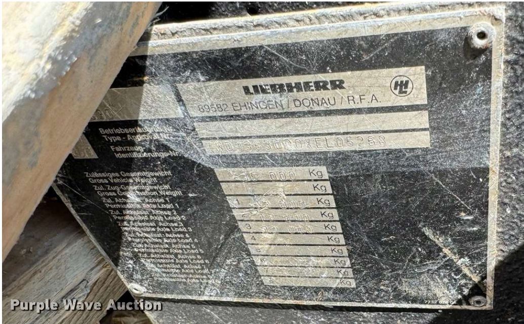 1999 Liebherr LTM 1040/1 crane. Hours: 8,633 on meter, VIN: W09363000XEL05268, Serial: 0019417. Engine Liebherr, Cylinders: 6, Fuel type: Diesel. Transmission Powershift, 5F - 2R. Chassis Axles: Tandem, Suspension: Air, Brakes: Air, Controls: Hydraulic actuated. Operators station Enclosed cab, AC, Heat, Crane controls: Joysticks. Features Boom Telescopic, Maximum boom length: 115' Sections: 4, Stabilizers: 4, Boom controls In-cab, Crane block Capacity: 48 tons, Certification: valid through 09/2025. Tires Size: 445/95R25. Arkansas title. Washington County, AR. Fayetteville, AR 72701