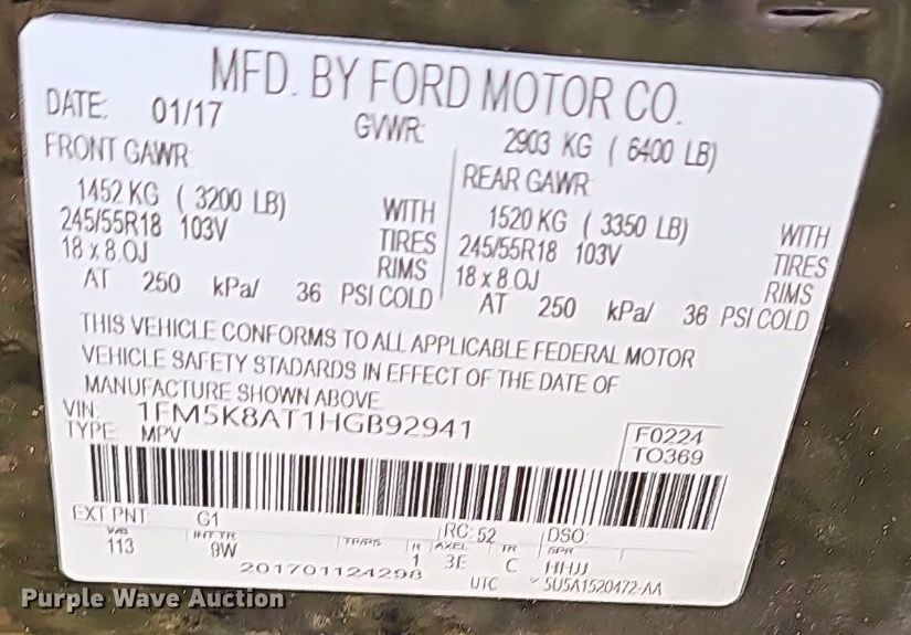 - VIN: 1FM5K8AT1HGB92941