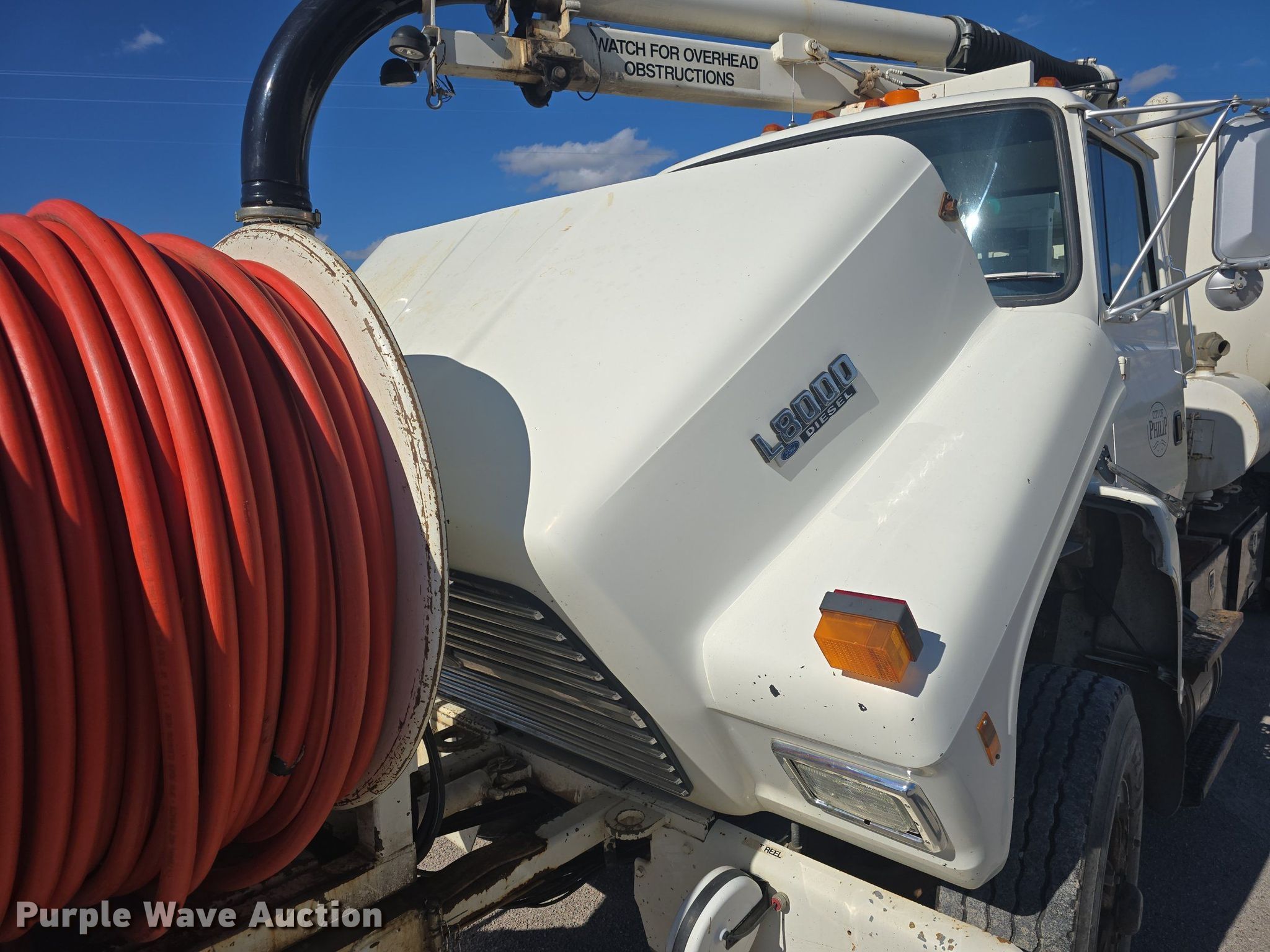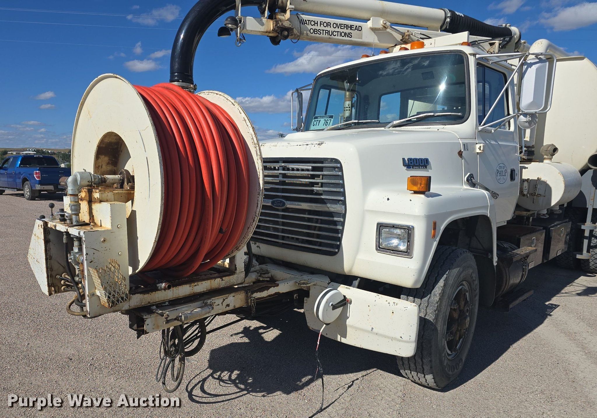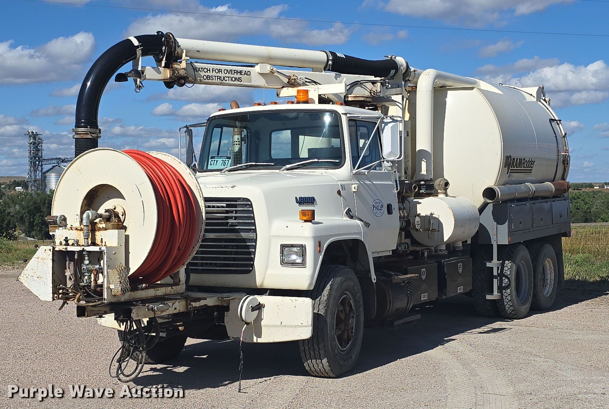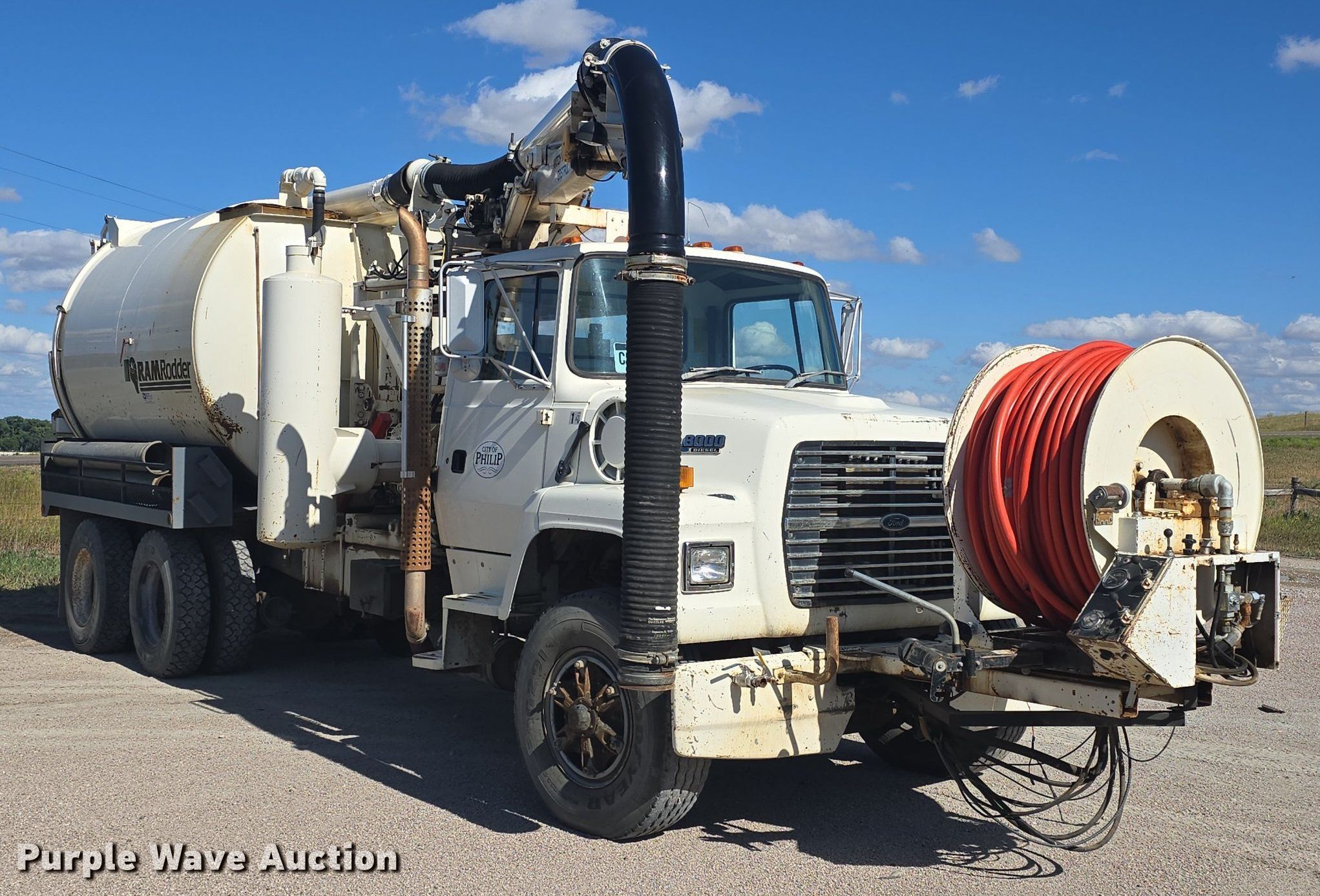 1993 Ford L8000 sewer rodder truck. Miles: 99,928 on odometer, Hours: 4,598 on meter, VIN: 1FDZW82E6PVA37995. Engine Cummins C Series, Displacement: 8.3L, Cylinders: 6, Fuel type: Diesel. Transmission Automatic. Chassis Axles: Tandem, Suspension: Spring over walking beam, Brakes: Air, PTO, GVWR: 56,000 lbs. Interior Heat. Features Tank bed Guzzler Ram Rodder, Serial: C229926Z651309193, Hose reel Front, Hydraulic, Diameter: 1", Telescopic boom Diameter: 9".. Tires Front: 315/80R22.5, Rear: 11R22.5. Notes Engine issues, overheats Intake leak, Coolant leak, Vacuum issues, loses suction, Air line leak. South Dakota title. Seller is a government entity who will be assigning and distributing the title. Please contact the seller for distribution questions. Title distribution may be delayed up to 14 days from verification of funds. City of Philip. Philip, SD 57567