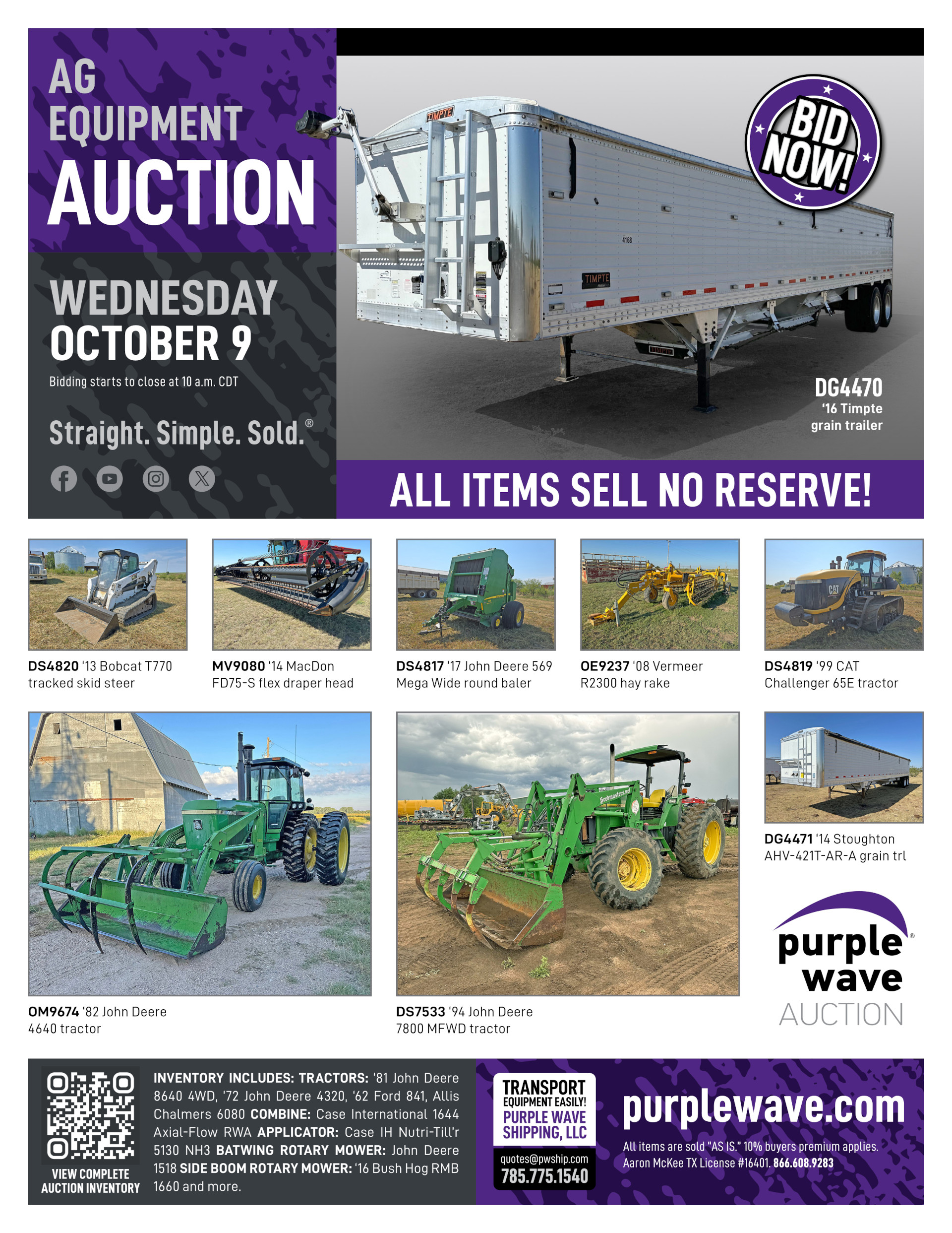 Purple Wave Shipping, LLC provides shipping and transportation services to winning bidders on ag, construction and fleet type assets. Purple Wave Shipping, LLC does not provide shipping on items weighing less than 1,000 pounds.