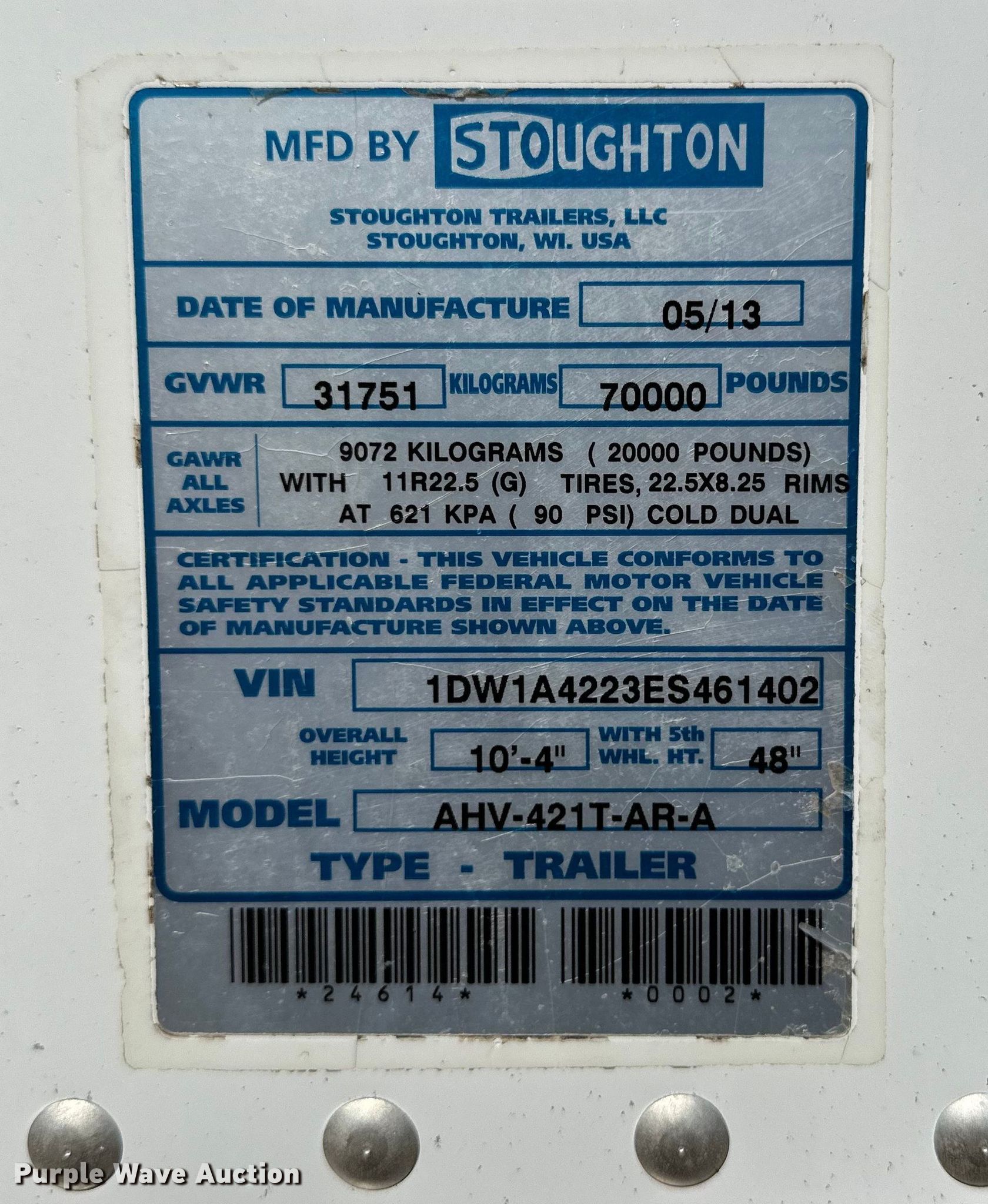 2014 Stoughton AHV-421T-AR-A grain trailer. VIN: 1DW1A4223ES461402. Dimensions Overall: 42' L x 96" W, Side height: 66". Features Body type: Aluminum, Hoppers: Double Trap gates: Manual, Roll tarp. Chassis Landing gear: Dual, Suspension: Air, Brakes: Air, Axles: Tandem, GVWR: 70,000 lbs, GAWR: 20,000 lbs. Tires Steel wheels, Size: 295/75R22.5. Oklahoma title. Seller is a Texas licensed motor vehicle dealer. The buyer may be required to pay sales tax and/or registration fees to the dealer prior to taking possession. Title will be assigned and distributed by the dealer. Please contact the seller for distribution questions. Texas Motors & Equipment. Canyon, TX 79015