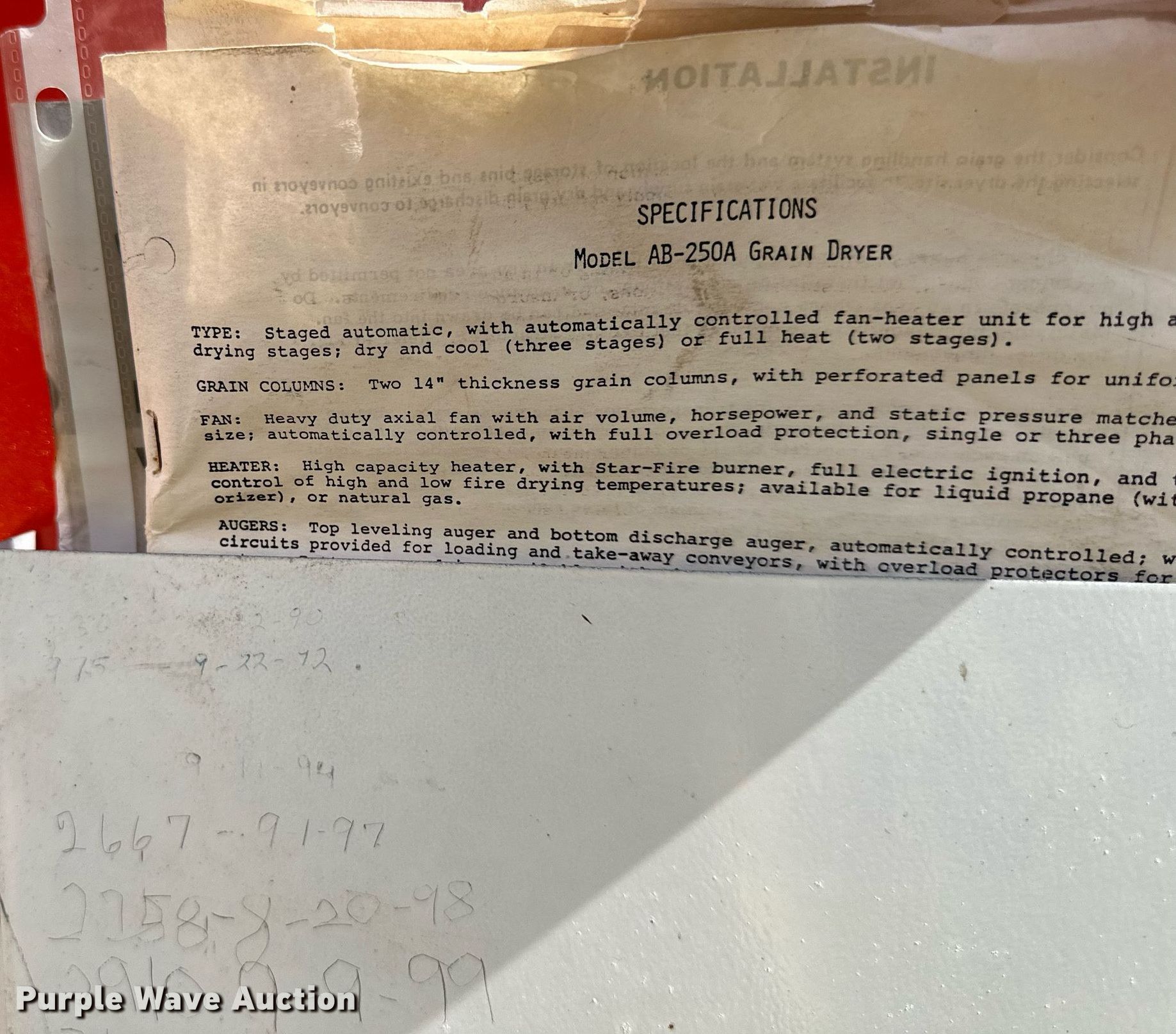 Farm Fans AB-250A grain dryer. Hours: 4,313 on meter, Serial: T2505. Features Bushel capacity: 250, Electric: Single Phase Volts: 230, Heating Farm Duty Motor, Model: 6K610K, Heating type: Propane. Tires Size: 8.50-15. Winchester, KS 66097
