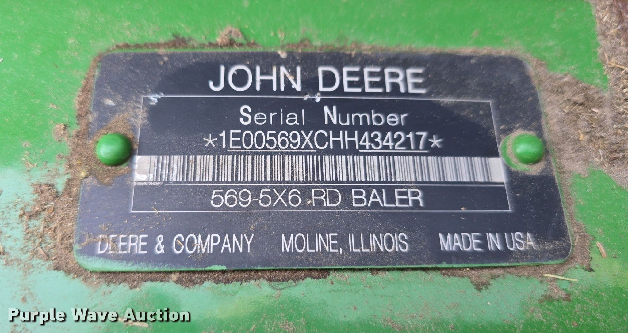 Purple Wave is selling a used Round Baler in Nebraska. This item is a 2017 John Deere 569 Mega Wide round baler with the following: Bale count: 14,784, Bale count may vary, unit still in use, Serial: 1E00569XCHH434217