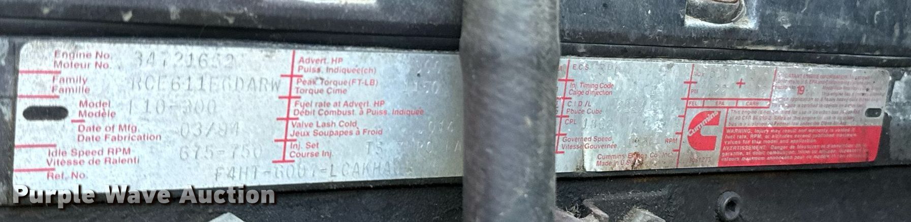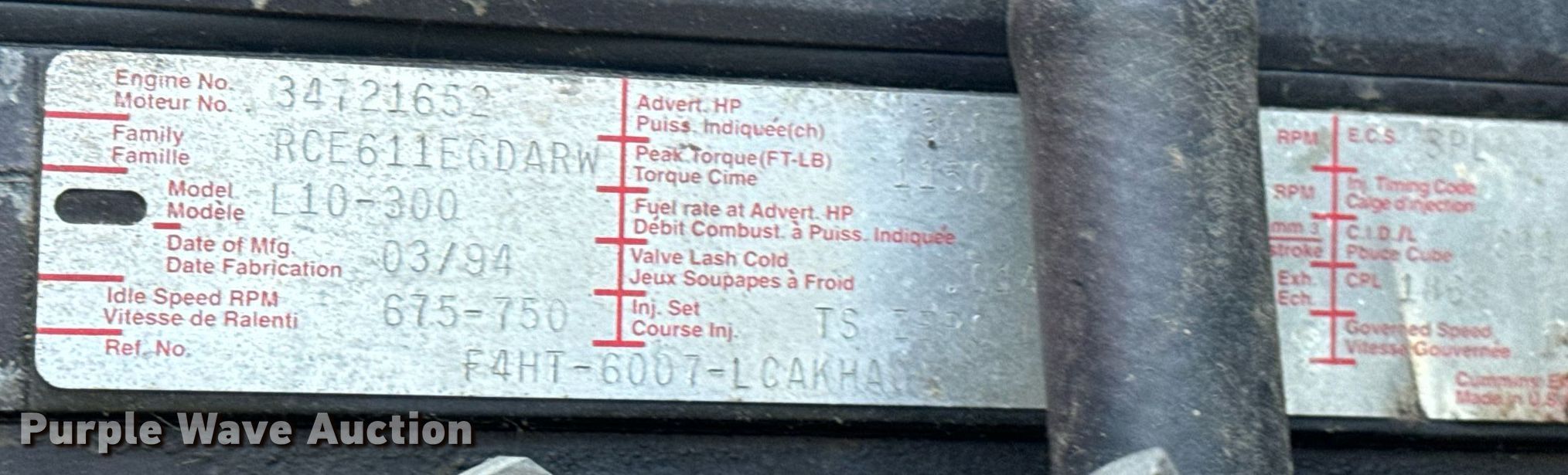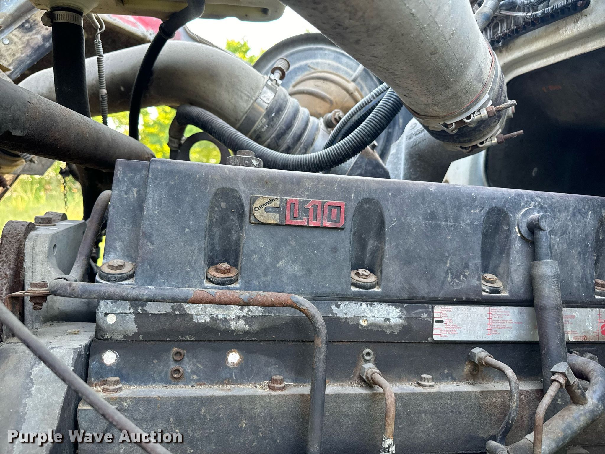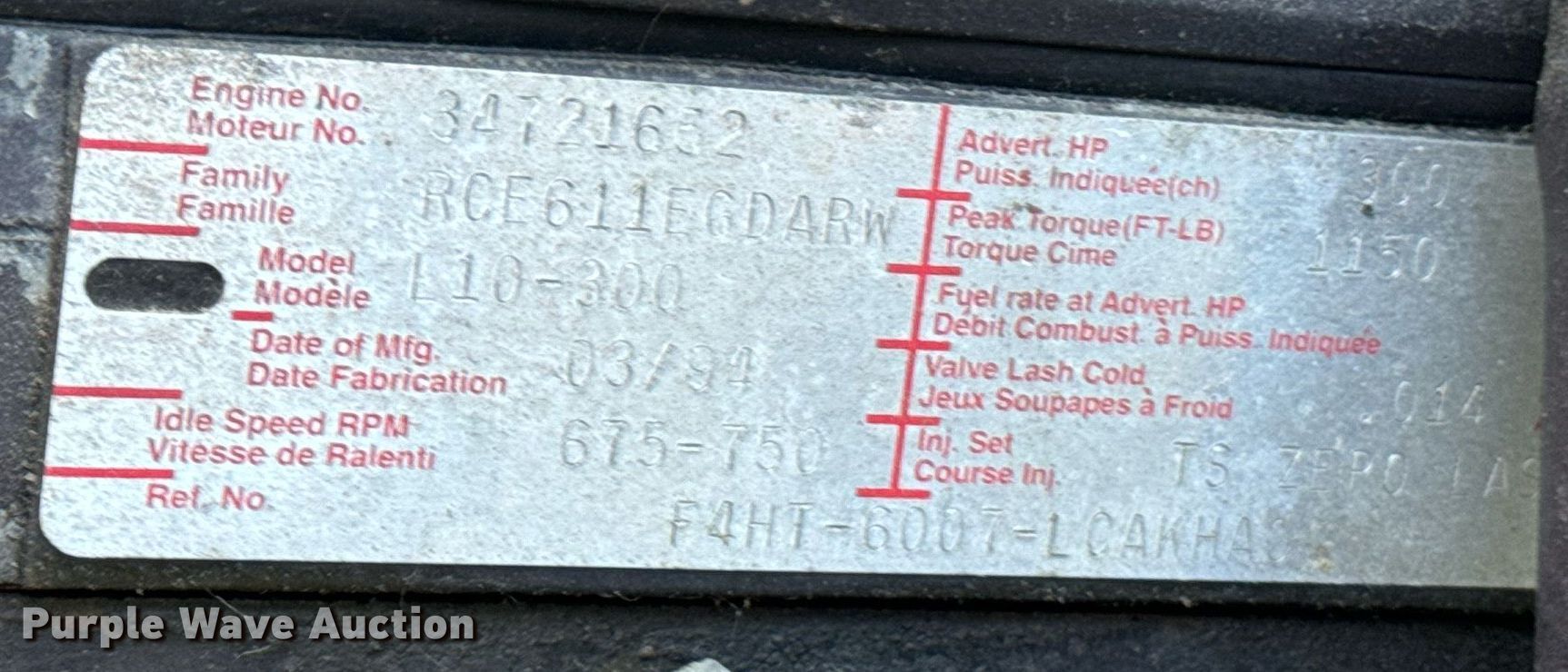 1994 Ford L9000 ready mix truck. Miles: 98,010 on odometer, VIN: 1FDZU90L6RVA47359. Engine Cummins L10, Displacement: 10.0L. Transmission Roadranger, Manual. Chassis Double frame, Axles: 4, Pusher axle, Tag axle, Differential lock: Inter-axle, Suspension: Spring over walking beam, Brakes: Air, Front mount PTO. Interior Heat. Features Mixer TMMB, Capacity: 10 cu.yd., Discharge: Rear, In-cab controls, Rear drum controls, Water tank capacity: 125 gallons, Chute Extensions: 3, Chute type: Steel.. Tires Front: 25/65R22.5, Rear: 11R22.5, Lift axle: 215/75R17.5. Notes Engine needs rebuilt , Non-operational unit. Ohio title. Title distribution may be delayed up to 30 days from verification of funds. LaPine Trucks and Trailer of Jackson Inc.. Richland, MS 39218