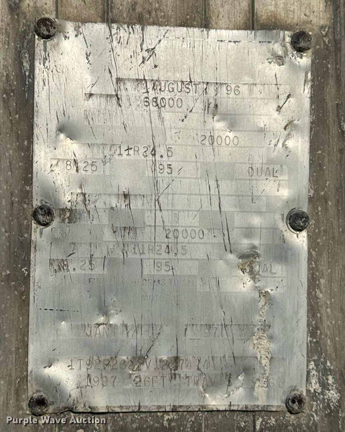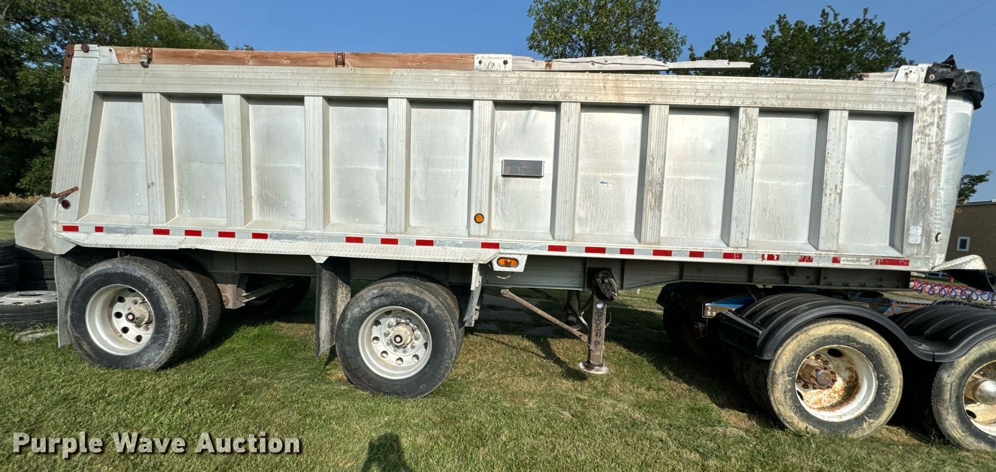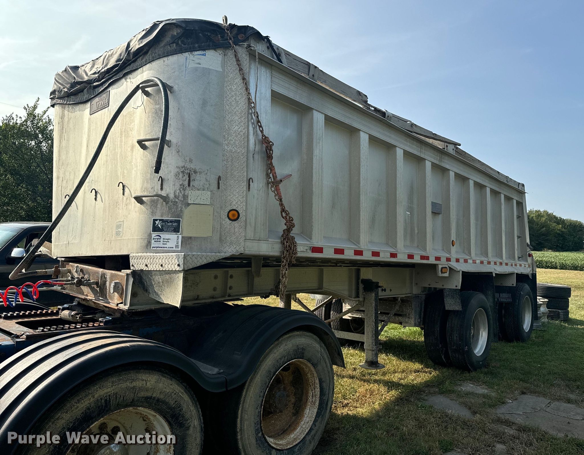 1997 Travis end dump trailer. VIN: 1T92F2627V1247474. Dimensions Overall: 26' L x 102" W, Side height: 48", Sideboard height: 6". Features Body type: Aluminum, Ram: Single, End gate: Air operated. Chassis Landing gear: Dual, Suspension: Air, Brakes: Air, Axles: Spread, GVWR: 68,000 lbs. Tires Aluminum wheels, Size: 11R24.5. Notes Unit previously in roll over accident, Frame damage Bent, Cracked, Semi not included. Kansas electronic title. Title has a lien that will be released following the close of the auction. A paper title will be printed once the lien is released. Title distribution may be delayed up to 30 days from verification of funds. White City, KS 66872