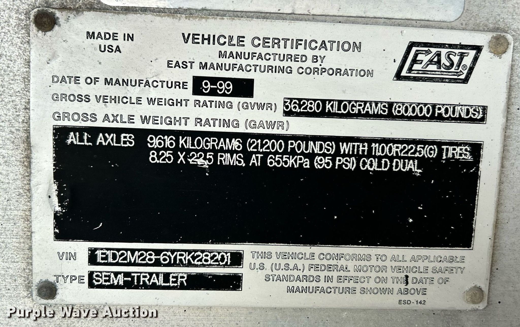 Purple Wave is selling a used End Dump Rock Trailer in Missouri. This item is a 2000 East end dump trailer with the following: VIN: 1E1D2M286YRK28201, Unit #: T8