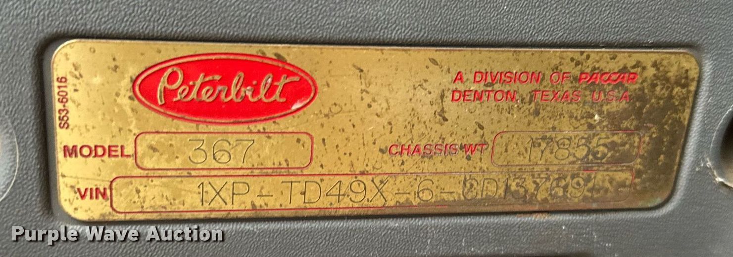2012 Peterbilt 367 semi truck. Miles: Unknown, VIN: 1XPTD49X6CD137691. Engine Cummins, Displacement: 14.9L, Cylinders: 6, Fuel type: Diesel. Transmission Manual. Chassis Axles: Tandem, Differential lock: Full, Suspension: Air Dump valves, Brakes: Air, PTO, Wet kit, GVWR: 52,000 lbs FAWR: 12,000 lbs, IAWR: 20,000 lbs, RAWR: 20,000 lbs. Interior AC, Heat, Heated mirrors, Power windows, Cruise control, Air ride cab, Sleeper Sleeper length: 3', Beds: Single. Features Deck plate: Aluminum, Fifth wheel type: Fixed, Fuel tank: Dual. Tires Size: 11R22.5. Notes Non-operational dash, Glass cracked. Oklahoma title. Mileage has not been verified. Odometer discrepancy will be marked on the title. RD Trucking & Dozer Inc.. Bennington, OK 74723