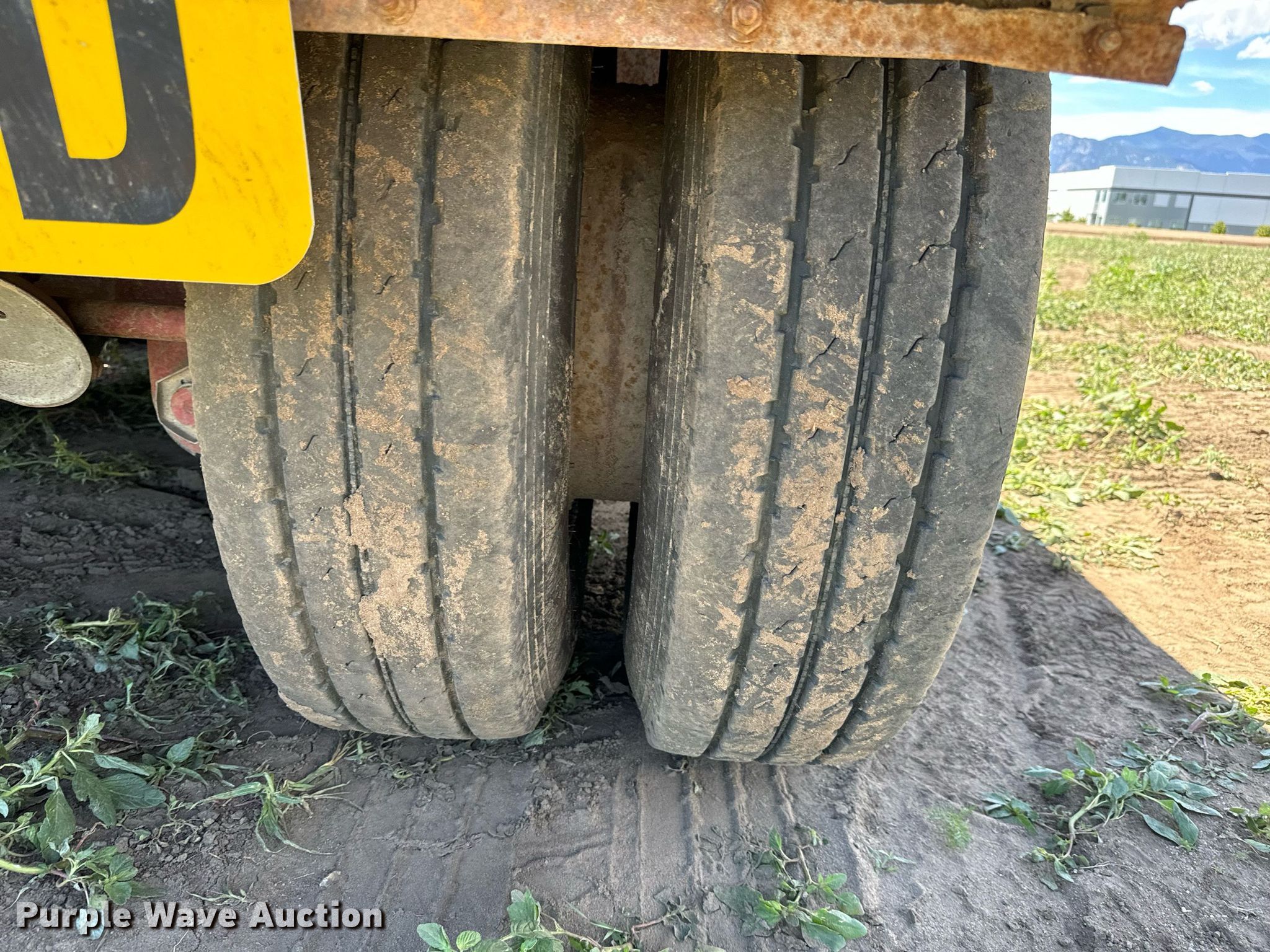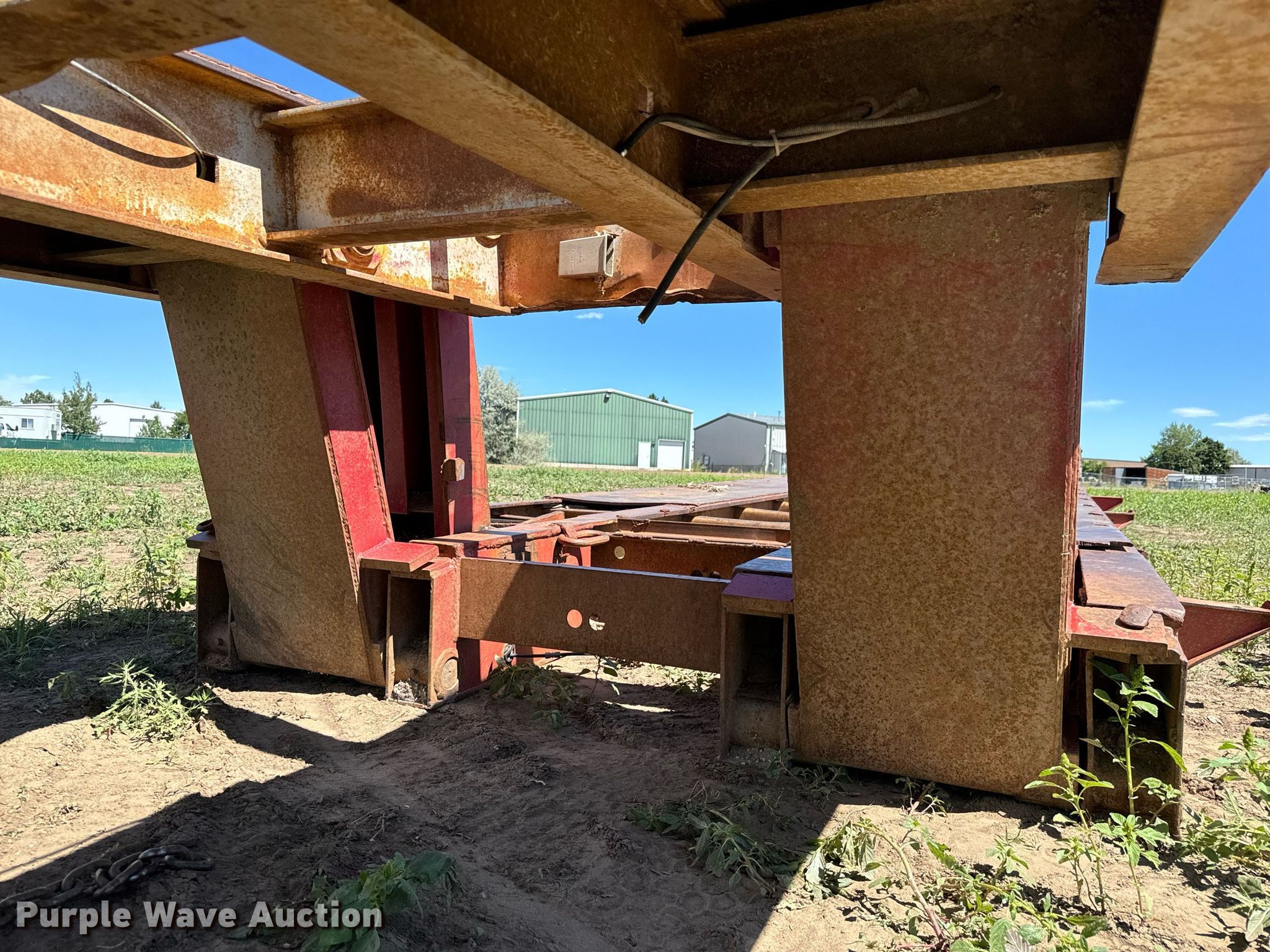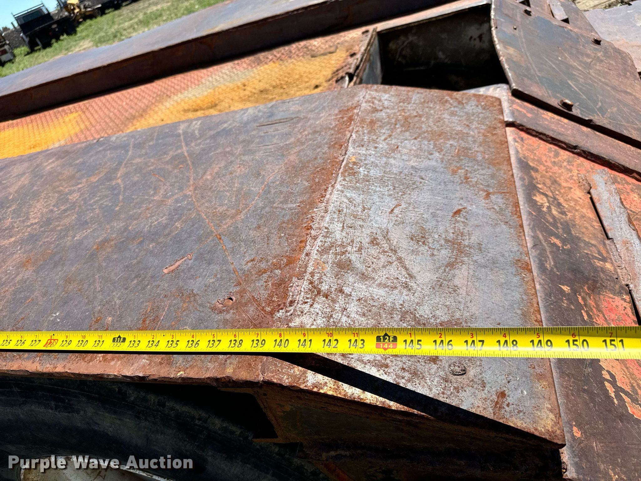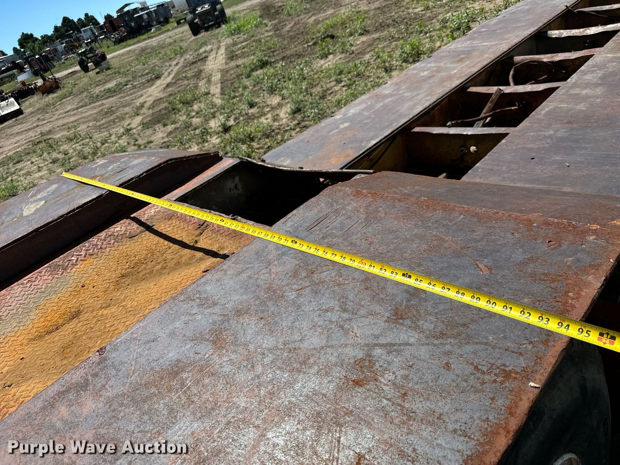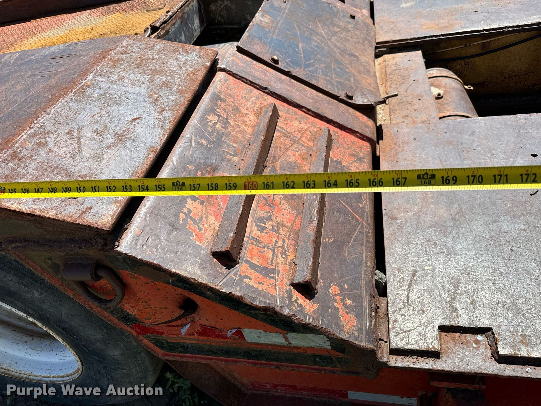 1980 Hyster lowboy equipment trailer. VIN: 23127, Unit #: 10. Dimensions Overall: 50' 6" L x 95" W, Deck: 21' L x 95" W, Top deck length: 15', Rear deck length: 13' 11". Features Deck type: Steel, Outriggers: Swing-out Board size: 12", Neck type: Folding. Chassis Suspension: Walking beam, Brakes: Air, Axles: Triple. Tires Steel wheels, Size: 11R22.5. Notes Hydraulic pump missing, Unknown operating condition of folding neck , Semi truck not included. Colorado title. Seedmasters Inc.. Colorado Springs, CO 80916