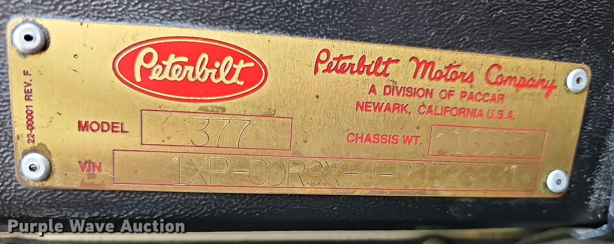 Purple Wave is selling a used Construction Dump Truck in Oklahoma. This item is a 1993 Peterbilt 377 dump truck with the following: Miles: 941,890 on odometer, Hours: 15,680 on meter, VIN: 1XPCDR9X6PD326831