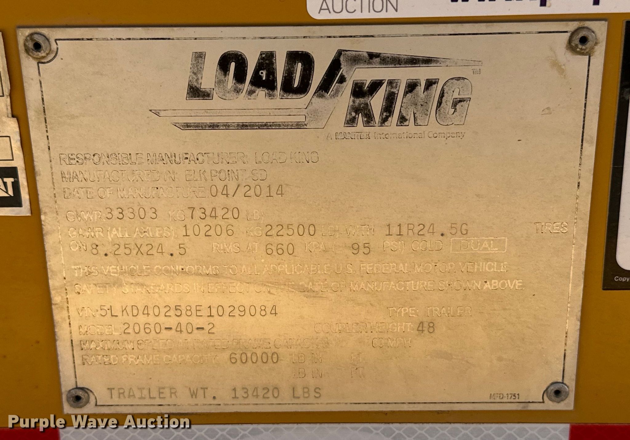 2014 Load King 2060-40-2 bottom dump trailer. VIN: 5LKD40258E1029084, Unit #: TT-25. Dimensions Overall: 40' L x 102" W, Side height: 72", Sideboard height: 8". Features Body type: Steel, Clamshell gate: Air operated, Trailer controls, Rear push block, Roll tarp. Chassis Landing gear: Dual, Suspension: Air, Brakes: Air, Axles: Tandem, GVWR: 73,420 lbs, GAWR: 22,500 lbs. Tires Steel wheels, Size: 11R24.5. Colorado title. Precision Excavating, Inc. Open Inspection September 18 and October 14 from 9 A.M. to 3 P.M. MST. 1545 West Jefferson Avenue. Hayden, CO 81639