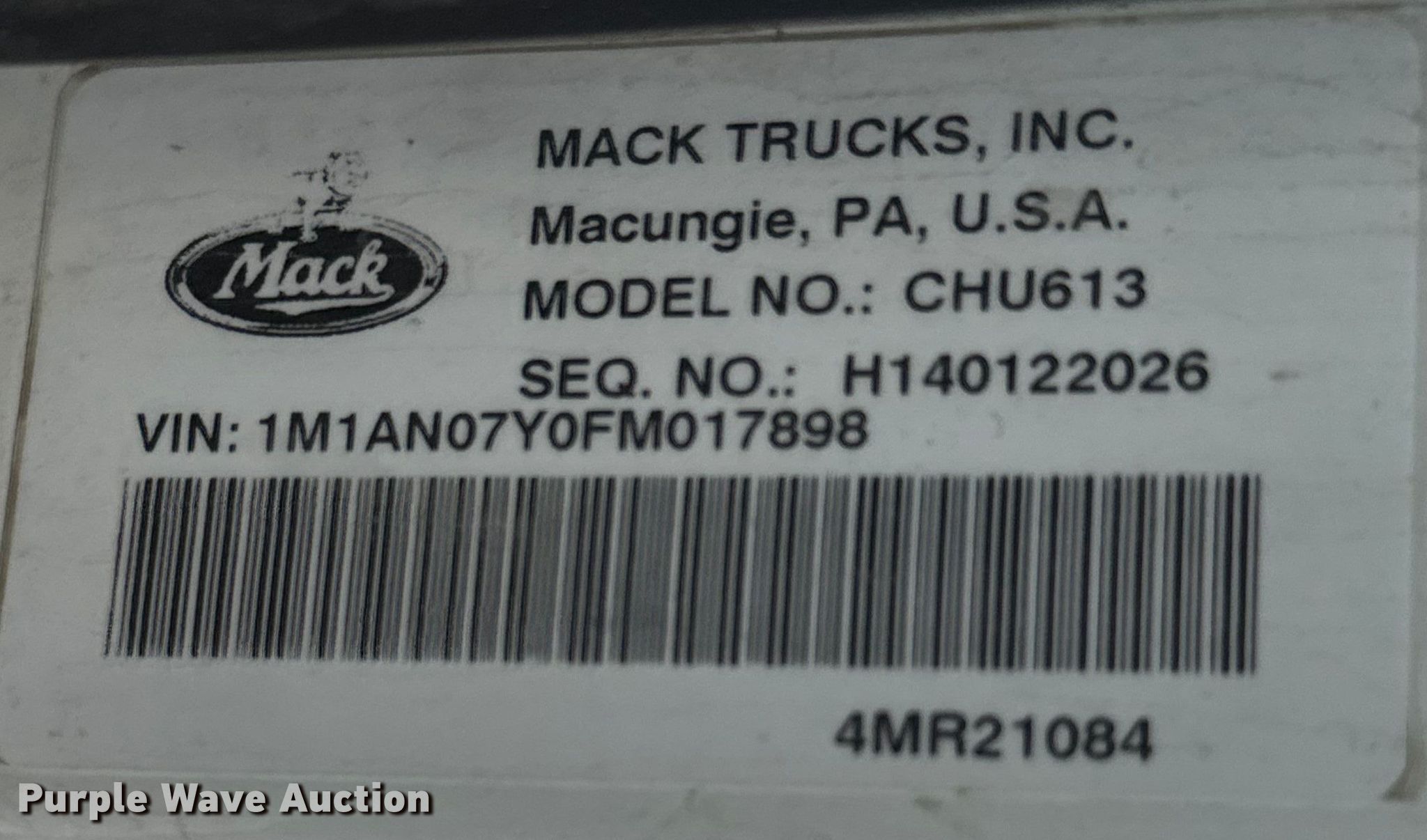Purple Wave is selling a used Truck Tractor in Colorado. This item is a 2015 Mack CHU613 semi truck with the following: Miles: 95,959 on odometer, Hours: 3,915 on meter, VIN: 1M1AN07Y0FM017898, Unit #: TR-31