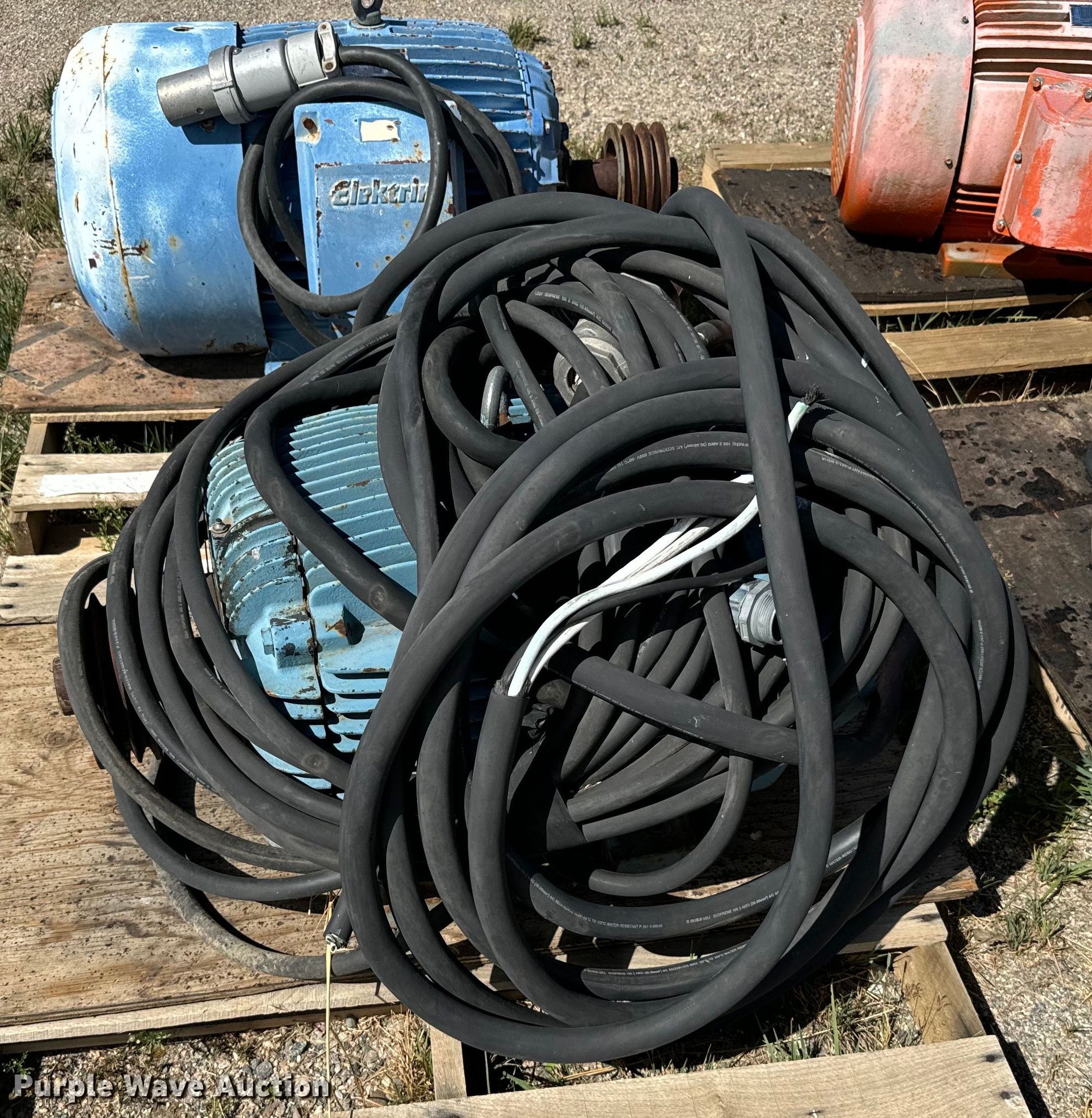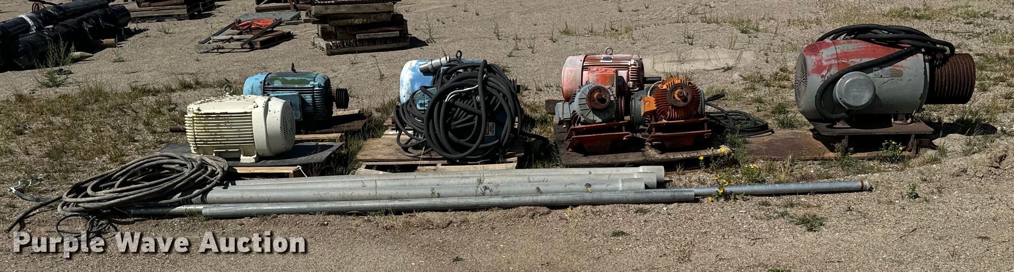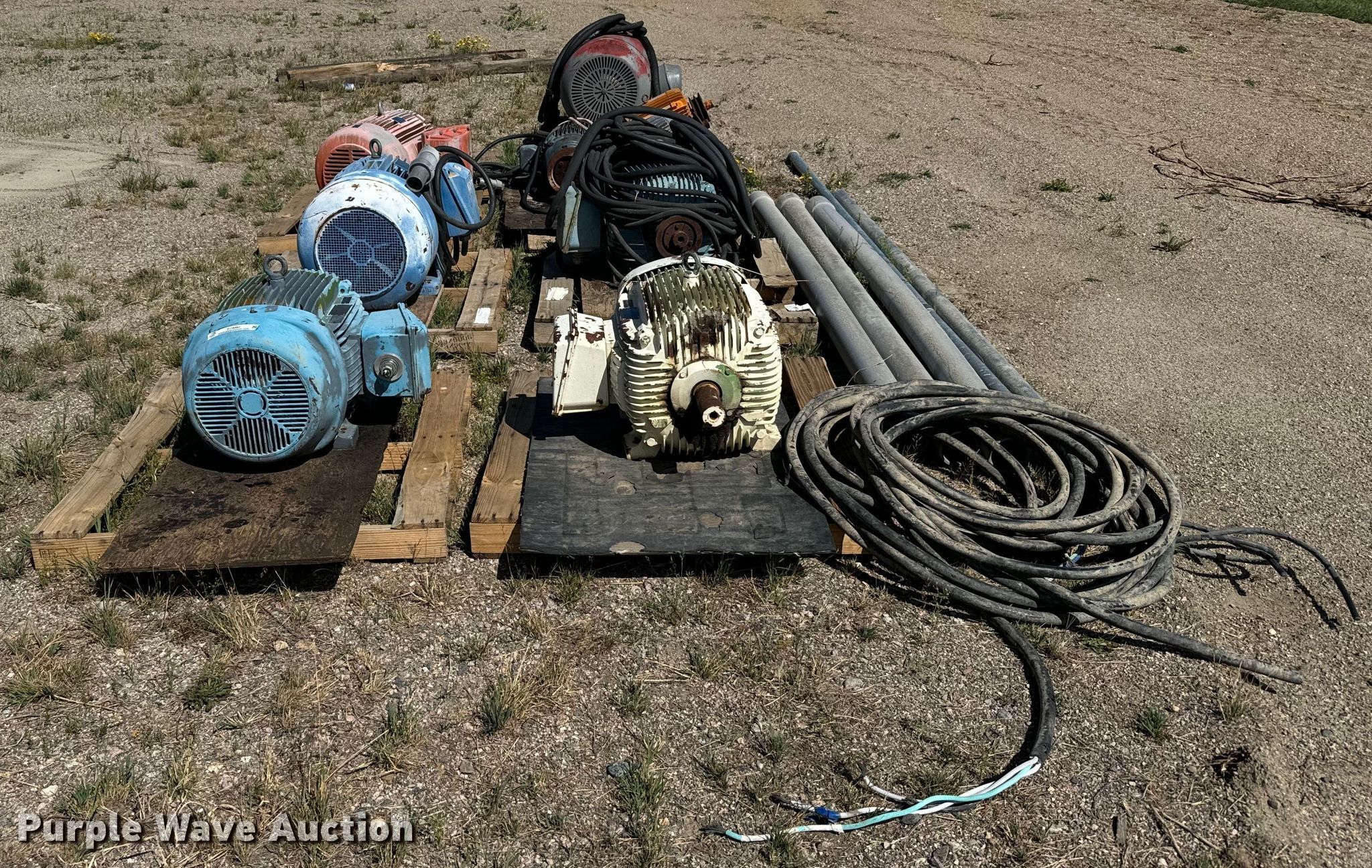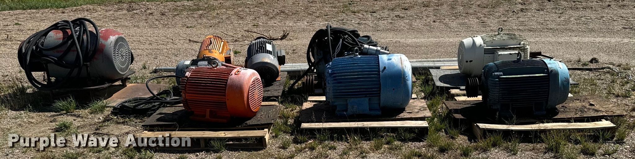 Purple Wave is selling a used Electric Motor in Colorado. This item is a (9) electric motors with the following: Weg, Phase: Three, HP: 10, Weg, Phase: Three, HP: 40, Elektrim, Phase: Three, HP: 60, Weg, Phase: Three, HP: 40, Nema, Phase: Three, HP: 60, US Electric, Phase: Three, HP: 20, E-LINE, US Electric, Phase: Three, HP: 15, Lincoln, Phase: Three, HP: 125, Approx. 3 4" x 10' PVC conduits, Electrical wire, 3" x 10' metal conduit, 2" x 15' metal EMT