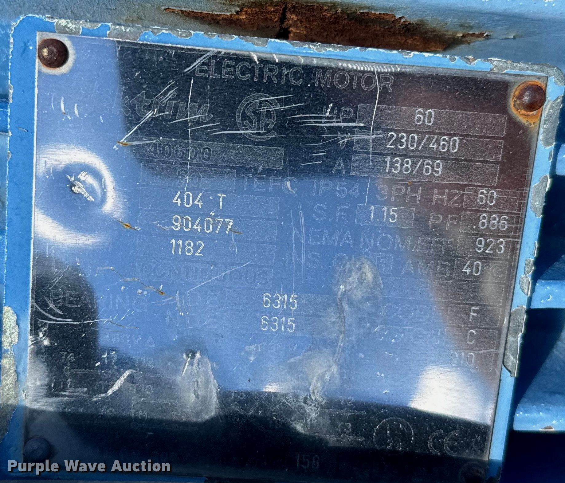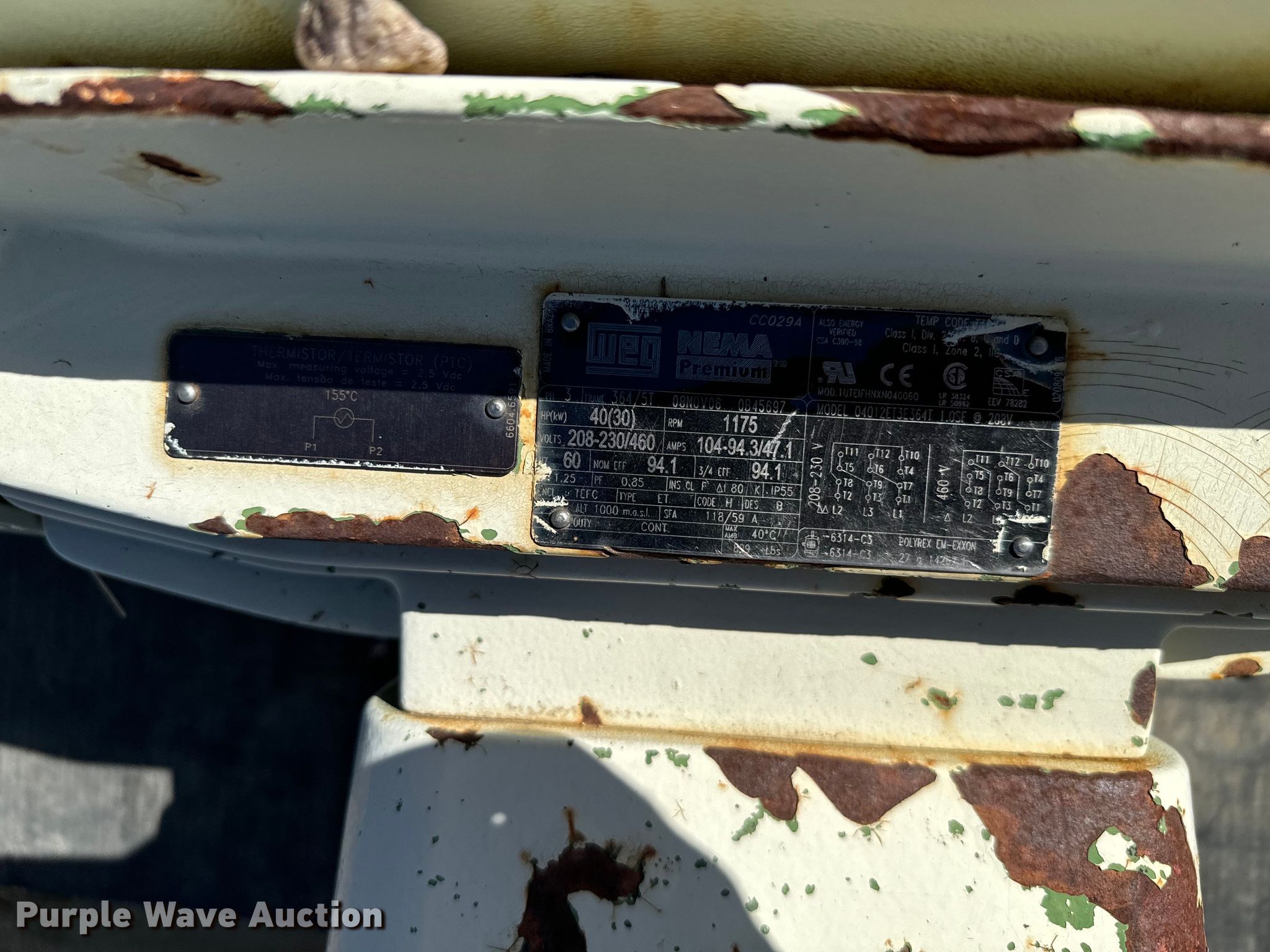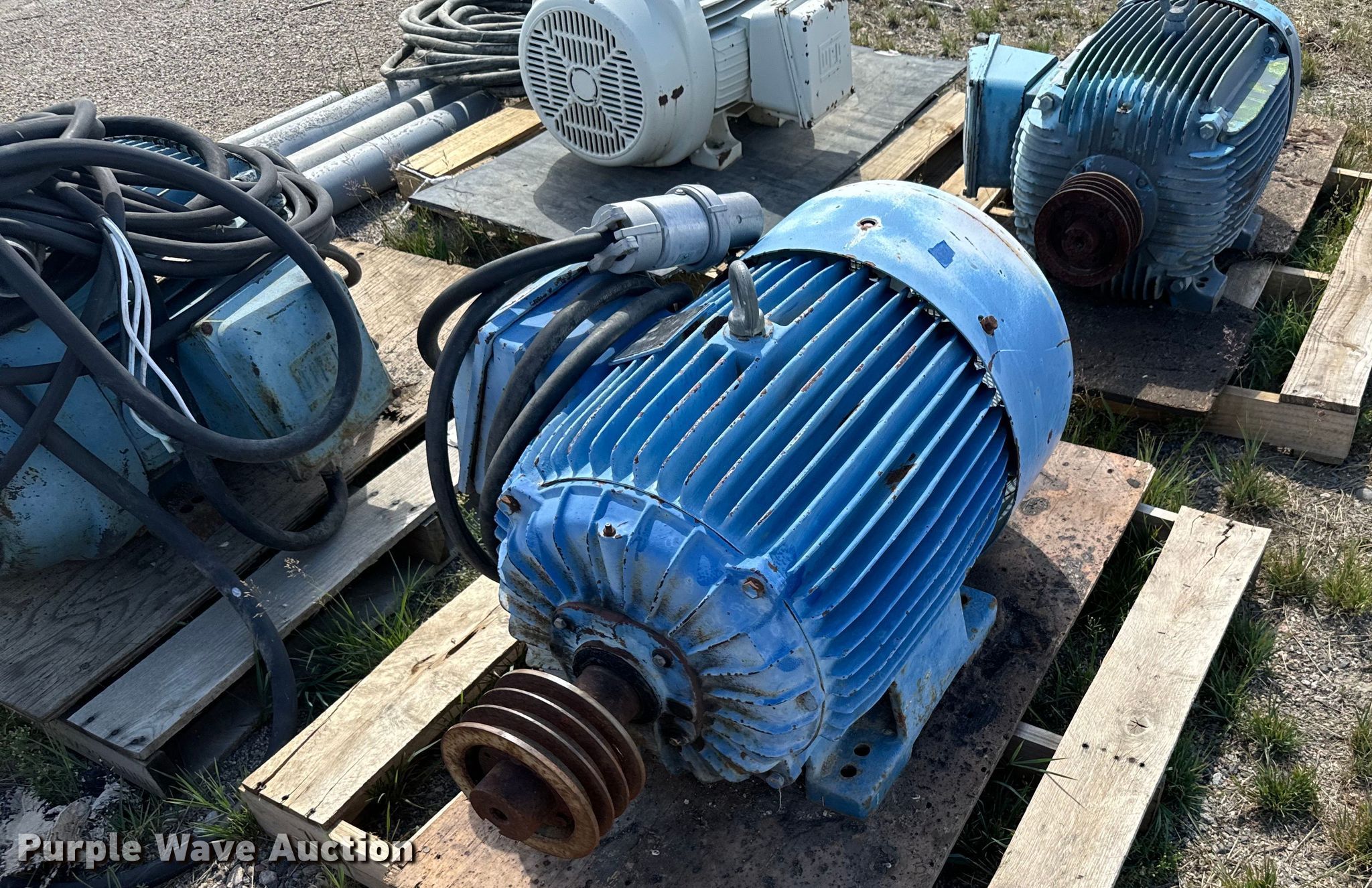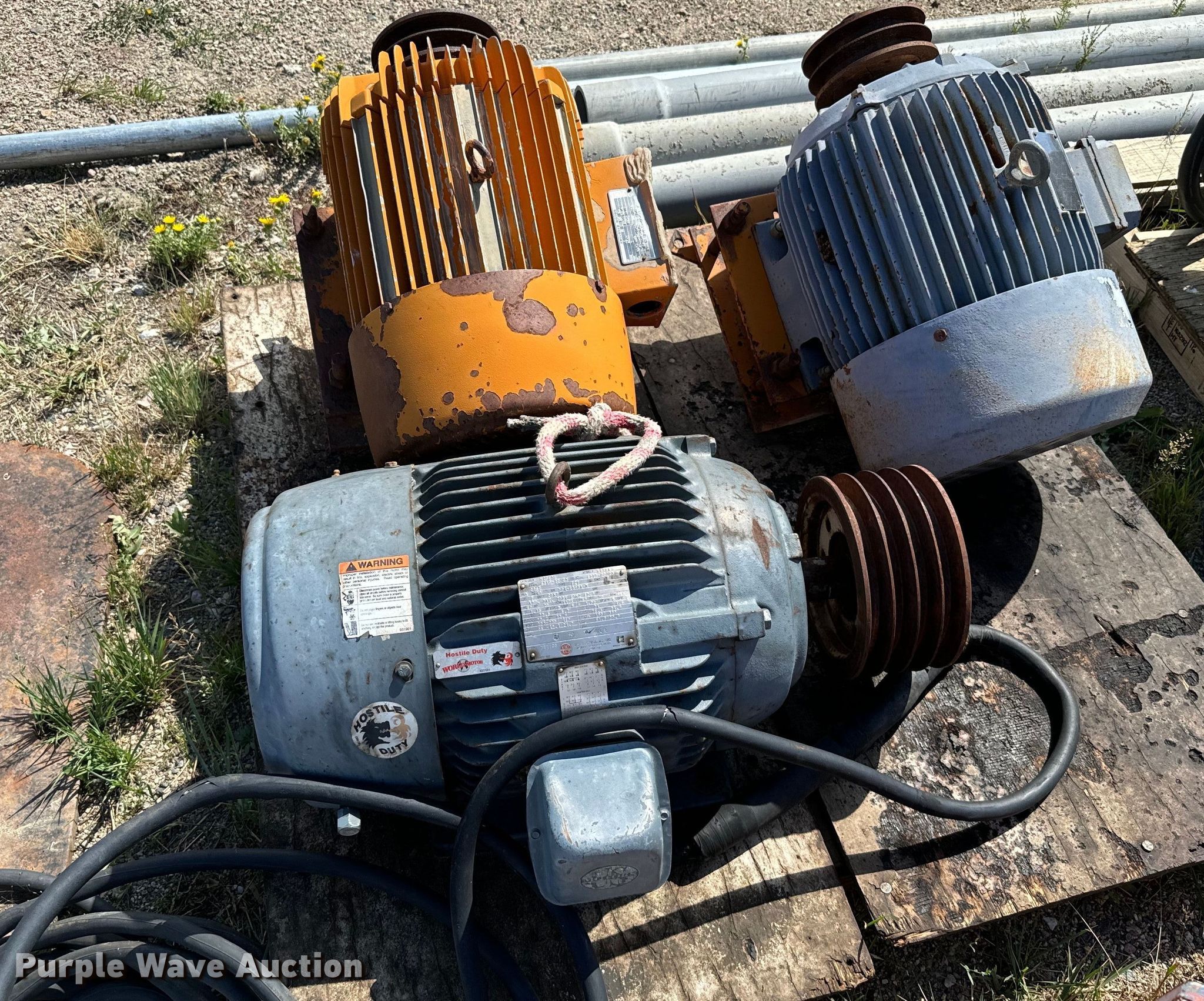 Purple Wave is selling a used Electric Motor in Colorado. This item is a (9) electric motors with the following: Weg, Phase: Three, HP: 10, Weg, Phase: Three, HP: 40, Elektrim, Phase: Three, HP: 60, Weg, Phase: Three, HP: 40, Nema, Phase: Three, HP: 60, US Electric, Phase: Three, HP: 20, E-LINE, US Electric, Phase: Three, HP: 15, Lincoln, Phase: Three, HP: 125, Approx. 3 4" x 10' PVC conduits, Electrical wire, 3" x 10' metal conduit, 2" x 15' metal EMT
