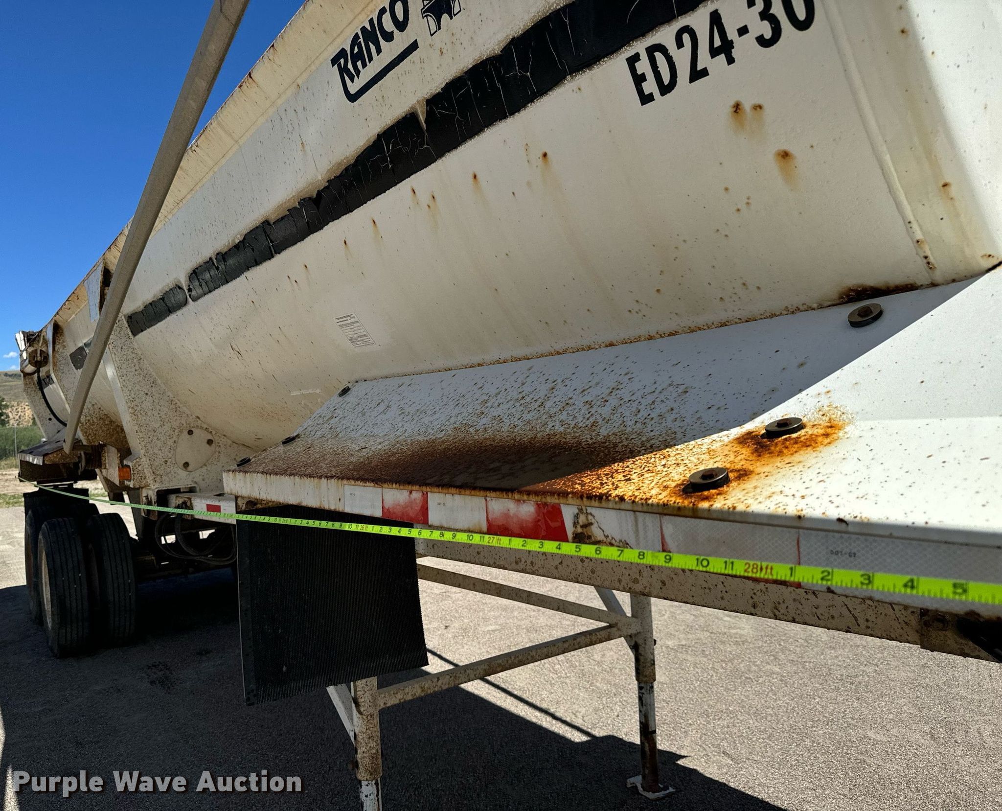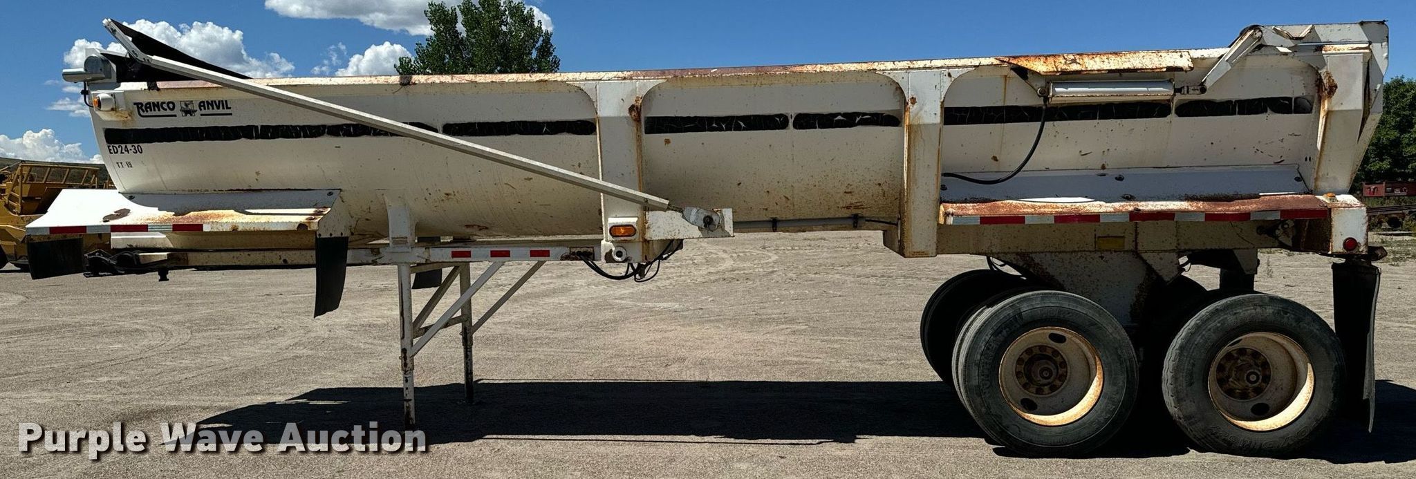 2004 Ranch Manufacturing end dump trailer. VIN: 1R9ES95044L008762, Unit #: TT-19. Dimensions Overall: 30' L x 102" W, Body: 28' L x 90" W, Side height: 44". Features Body type: Steel, Ram: Single, End gate: Air operated, Roll tarp. Chassis Landing gear: Dual, Suspension: Spring, Brakes: Air, Axles: Tandem, GVWR: 70,000 lbs. Tires Steel wheels, Size: 11R24.5. Notes Semi not included. Colorado title. Precision Excavating, Inc. Open Inspection September 18 and October 14 from 9 A.M. to 3 P.M. MST. 1545 West Jefferson Avenue. Hayden, CO 81639