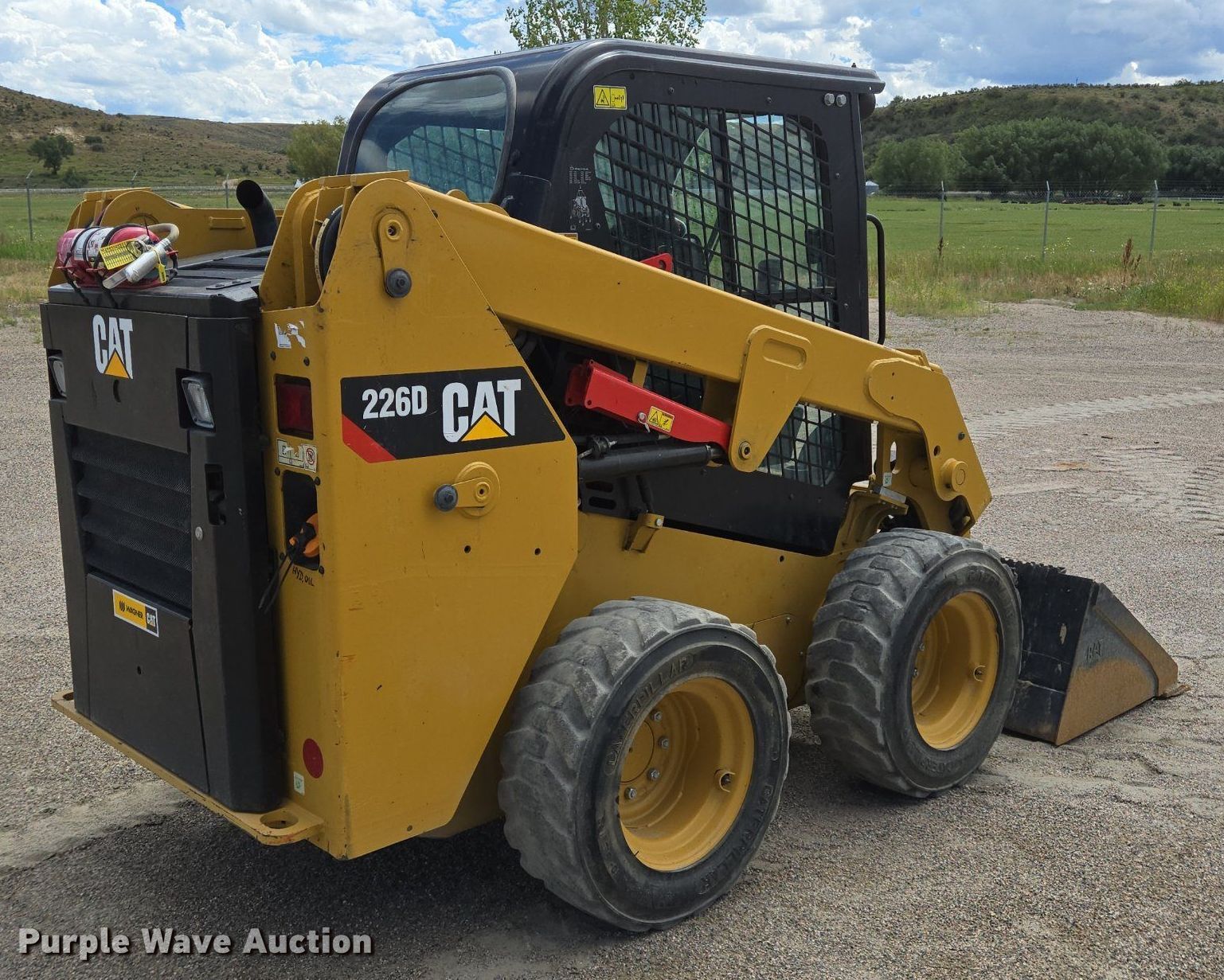 2019 Caterpillar 226D skid steer loader. Hours: 1,120 on meter, Serial: CAT0226DPHRD04289, Unit #: LS06. Engine Caterpillar, Cylinders: 4, Fuel type: Diesel. Transmission Hydrostatic. Operators station Enclosed cab, Bucket control: Hand. Features Auxiliary hydraulics, Quick coupler: Manual, Bucket Caterpillar, Capacity: 0.52 cu.yd., Width: 68", Low profile, Cutting edge: Bolt-on. Tires Size: 10-16.5 NHS, Brand: Caterpillar, Foam filled. Get A Free Shipping Estimate From:. Purple Wave Shipping, LLC.. Precision Excavating, Inc. Open Inspection September 18 and October 14 from 9 A.M. to 3 P.M. MST. 1545 West Jefferson Avenue. Hayden, CO 81639