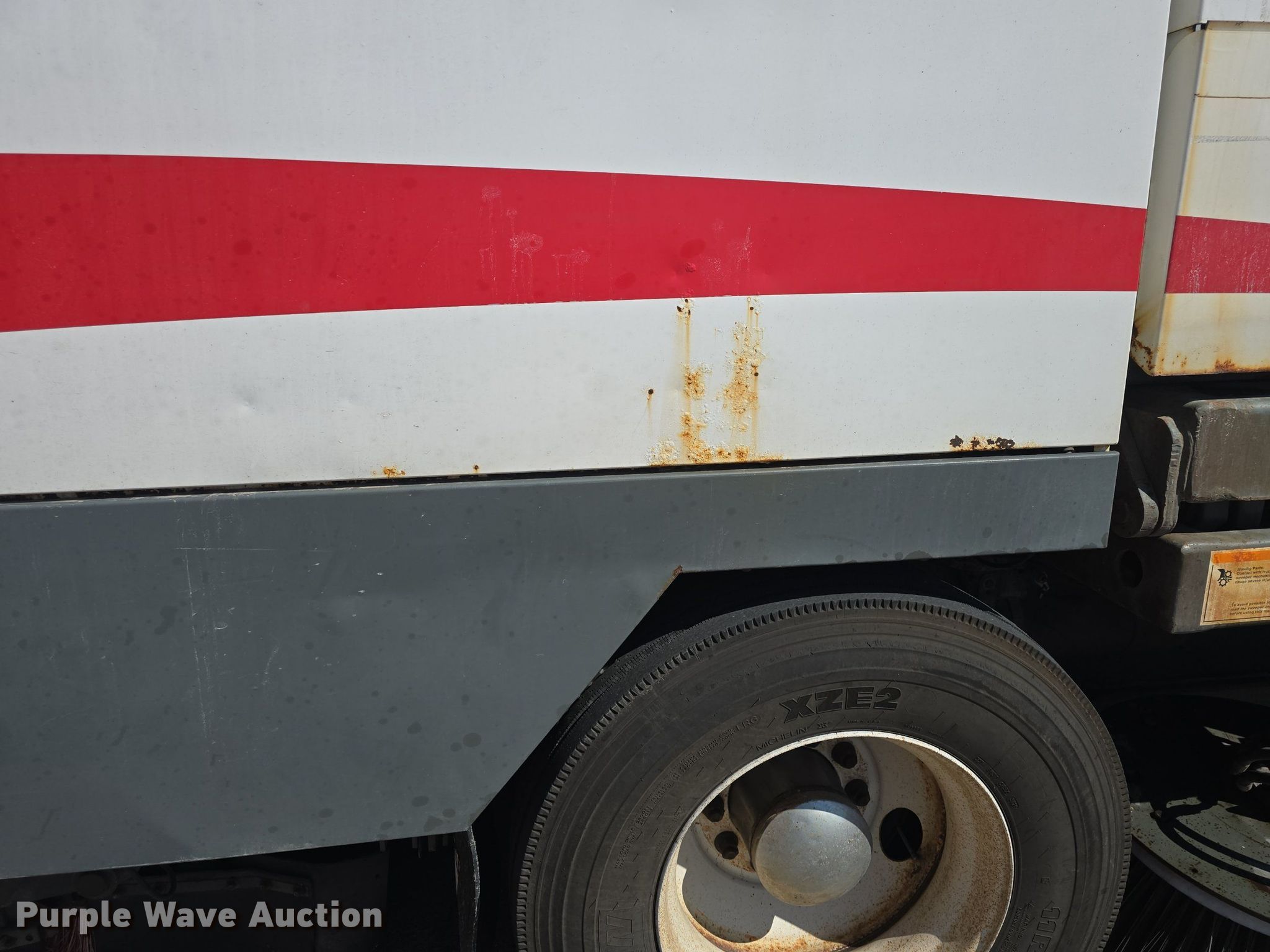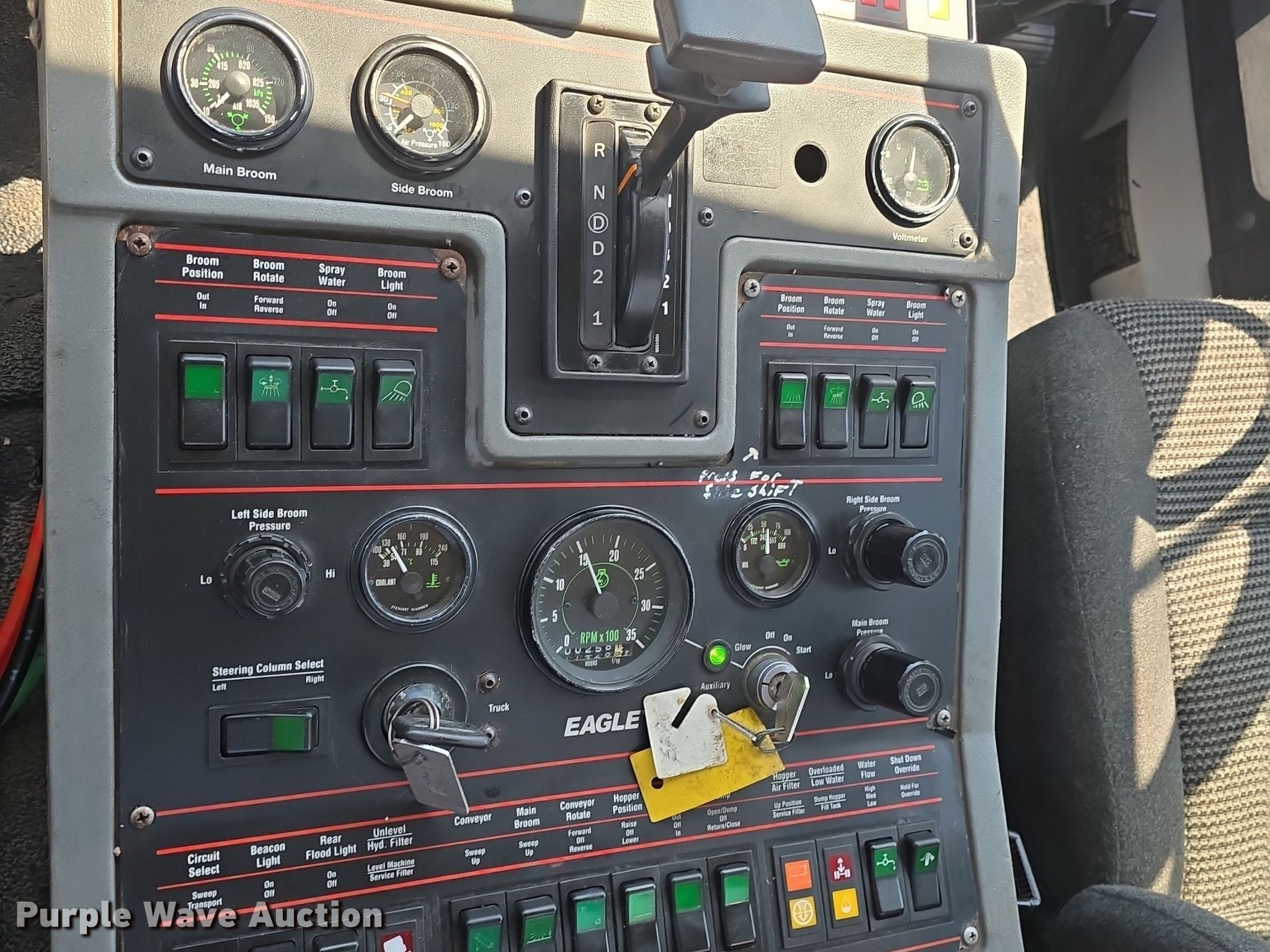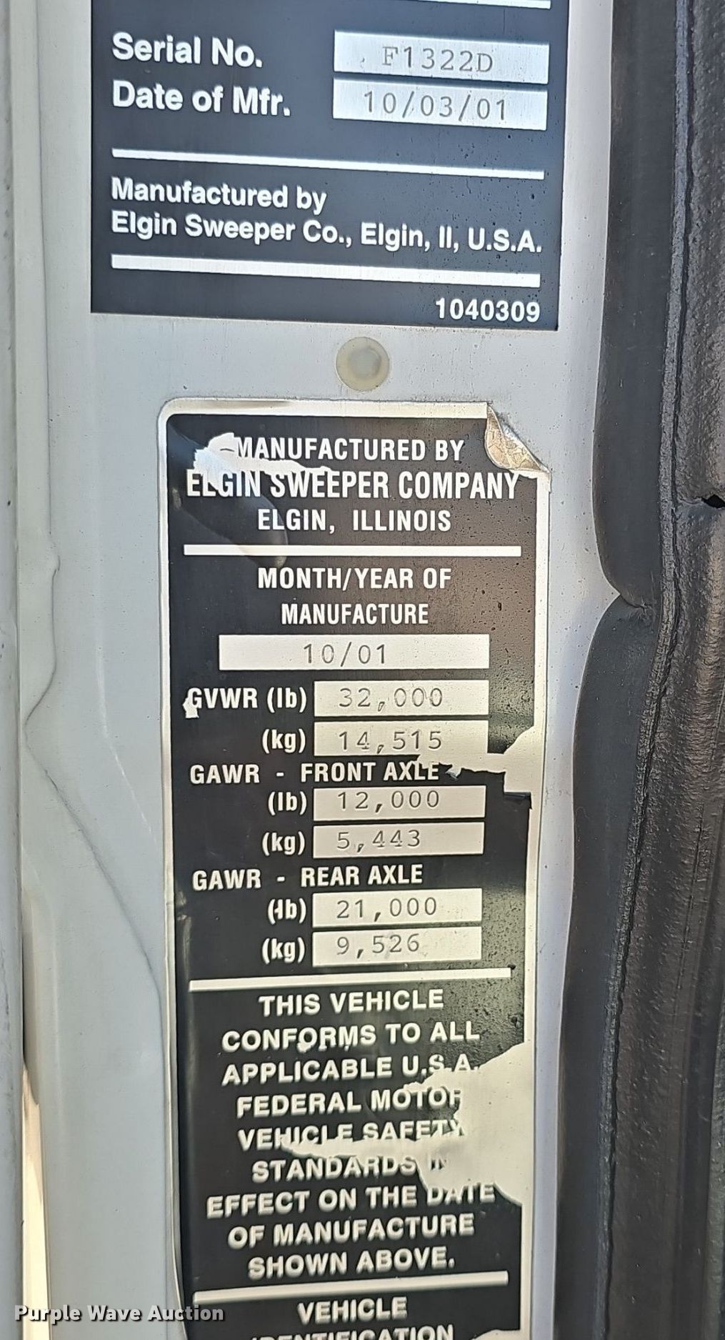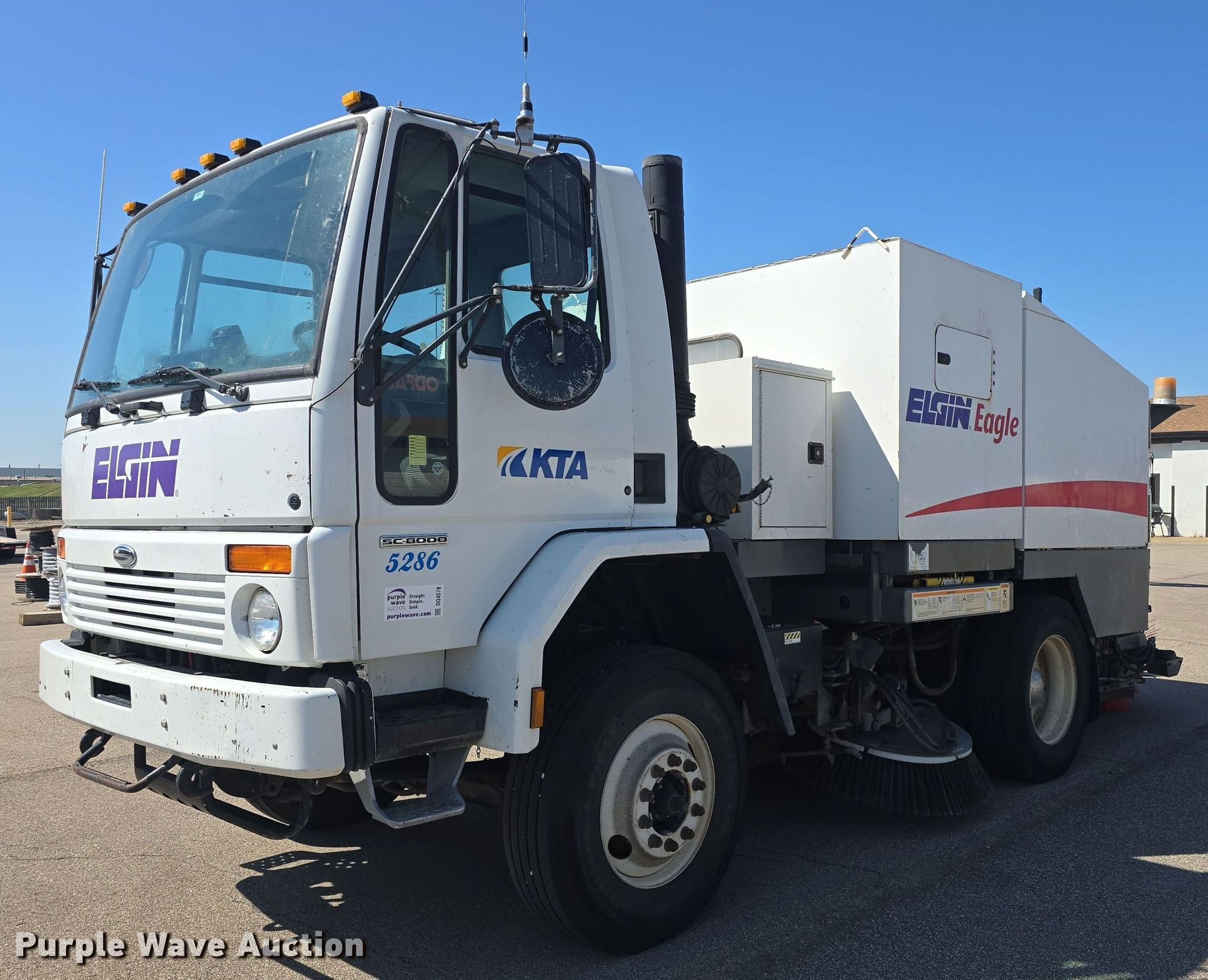 2002 Elgin Eagle SC8000 street sweeper truck. Miles: 57,566 on odometer, Hours: 5,322 on meter, VIN: 1FVAADBV820J48303, Unit #: 5286. Engine Fuel type: Diesel. Transmission Automatic. Chassis Suspension: Air, Brakes: Air, GVWR: 32,000 lbs. Operators station AC, Heat, Dual operating station. Features Broom Width: 60", Water spray system, Sweeper bed Sweeper bed type: Conveyor Elgin Eagle SeriesF, Serial: F1322D, Left gutter broom Diameter: 32", Right gutter broom Diameter: 32", Engine Isuzu, Serial: 240PW27, Cylinders: 4. Tires Size: 11R22.5. Notes Decals will be removed prior to auction, Arrow, strobes, CB radio not included, Non-operational water spray system, Dash warning indicator: ABS. Kansas title. Kansas Turnpike Authority. Topeka, KS 66609