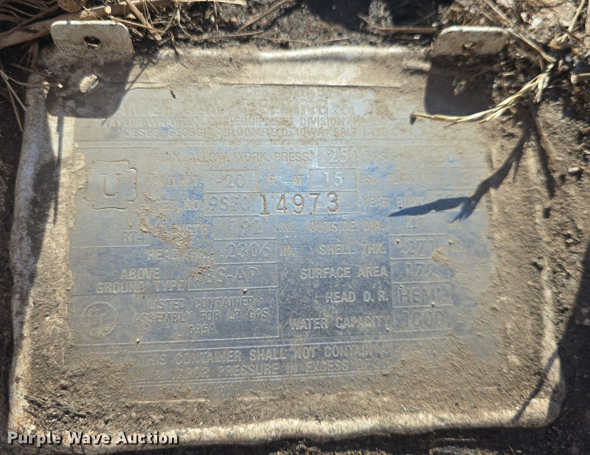 Purple Wave is selling a used Fuel and Lube in Kansas. This item is a Propane tank with the following: Capacity: 1,000 gallons