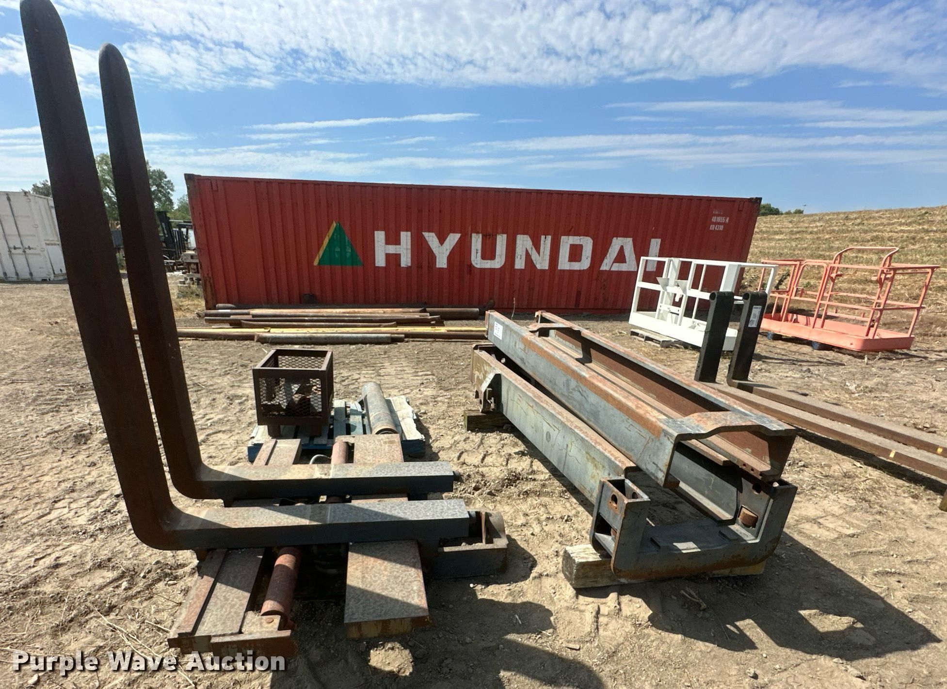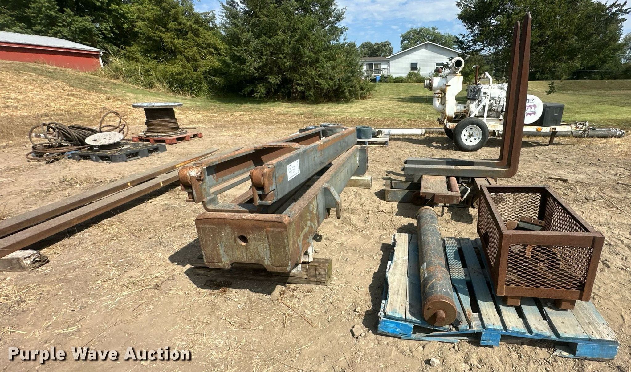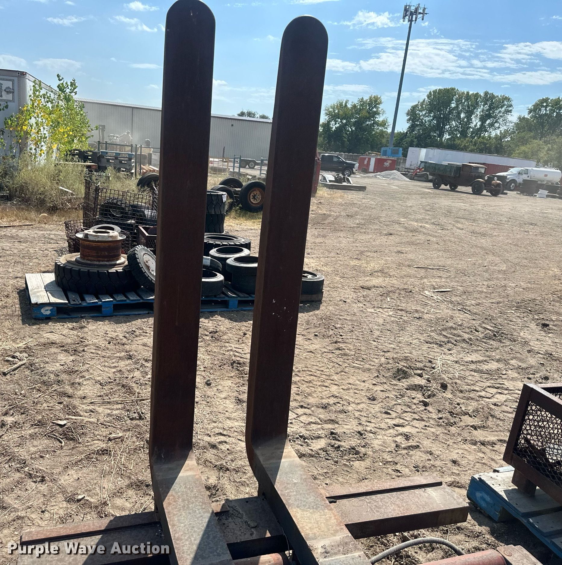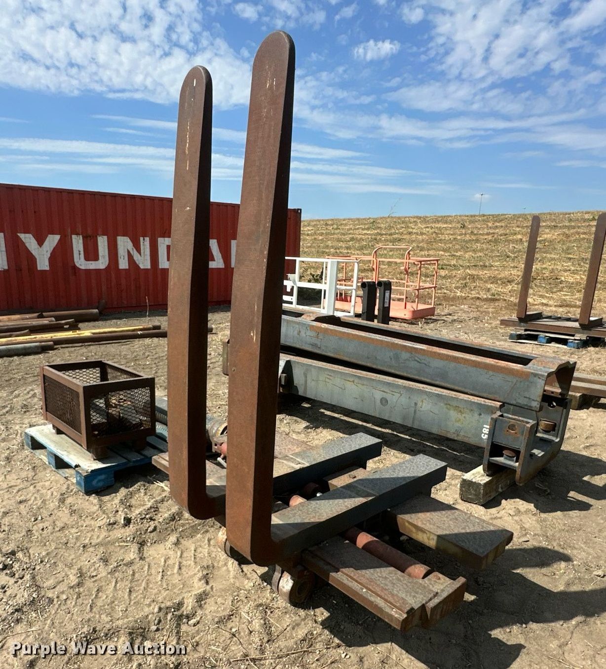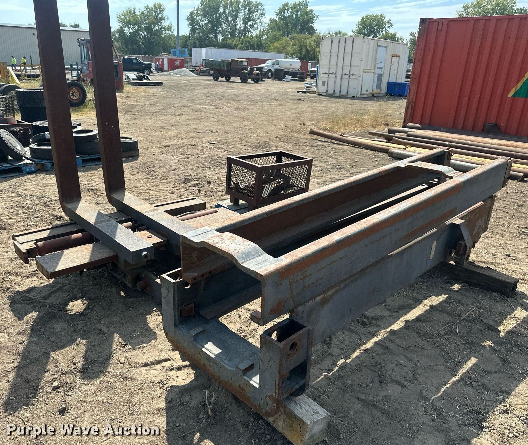Purple Wave is selling a used Forklift Attach. in Kansas. This item is a Forklift mast with the following: Capacity: 25,000 lbs, Adjustable pallet forks, Length: 58", Parts included