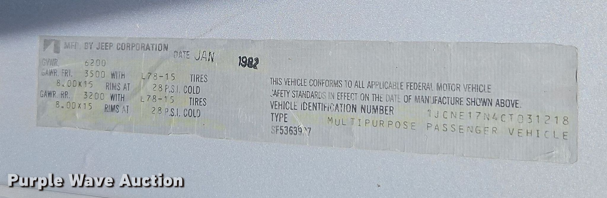 Purple Wave is selling a used Passenger Vehicle in Kansas. This item is a 1982 Jeep Cherokee SUV with the following: Miles: 70,477 on odometer, VIN: 1JCNE17N4CT031218