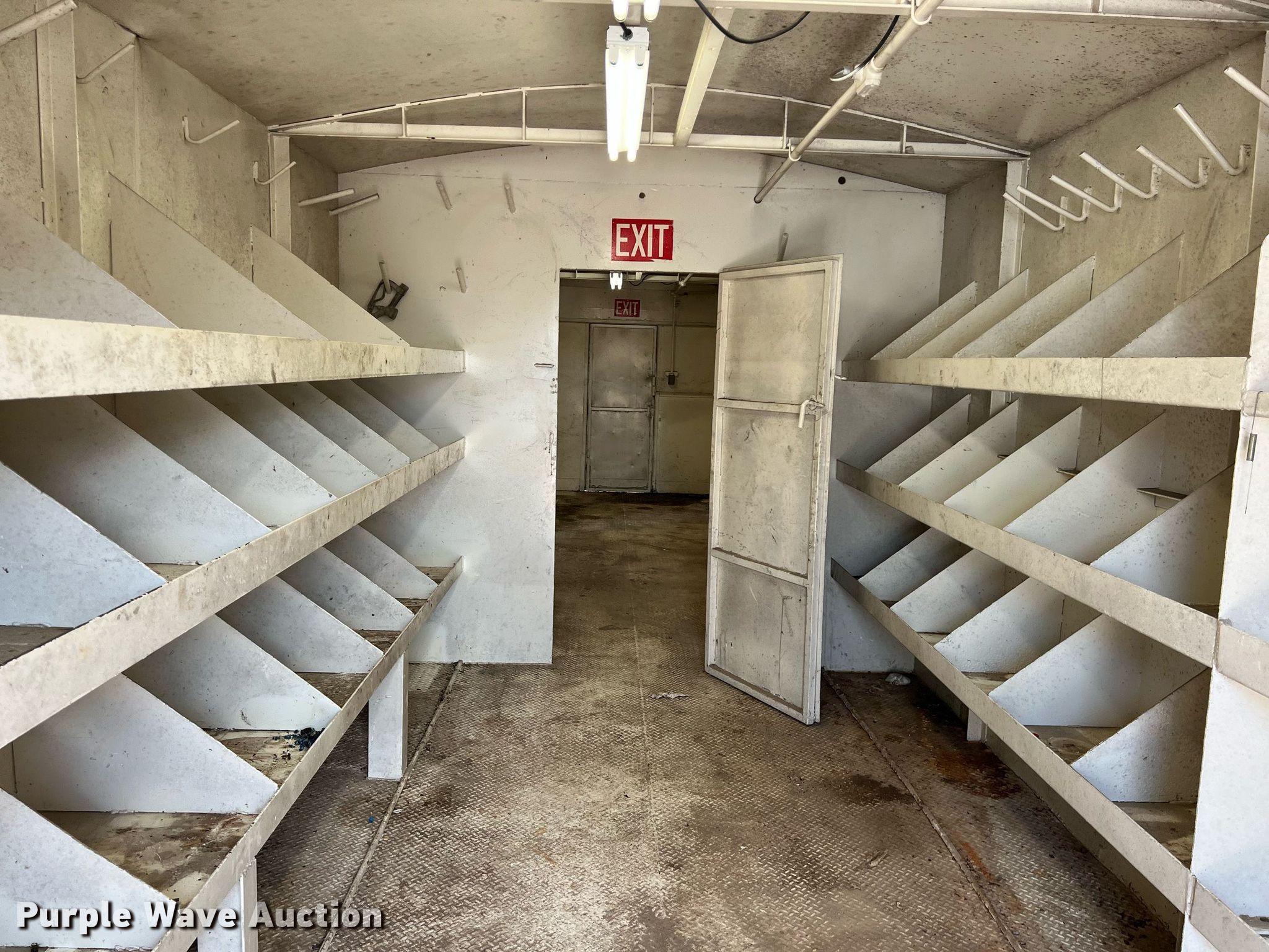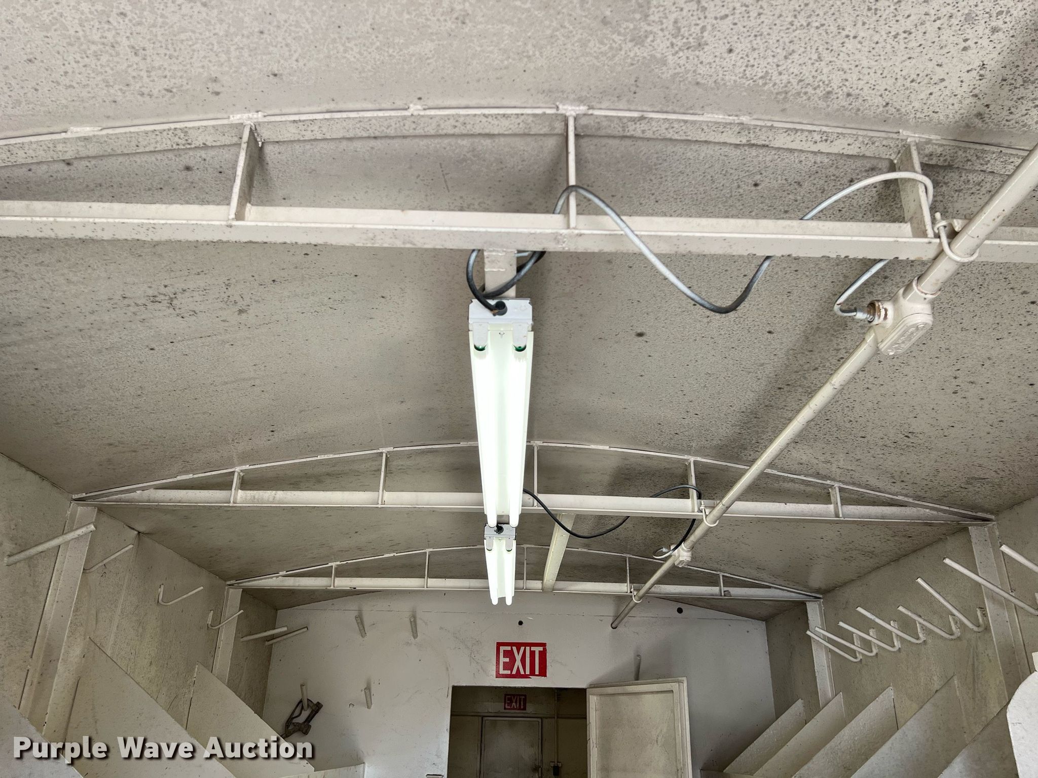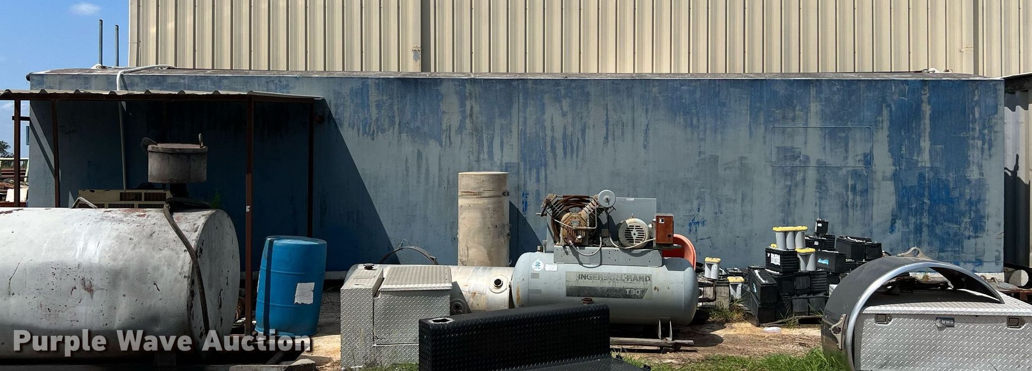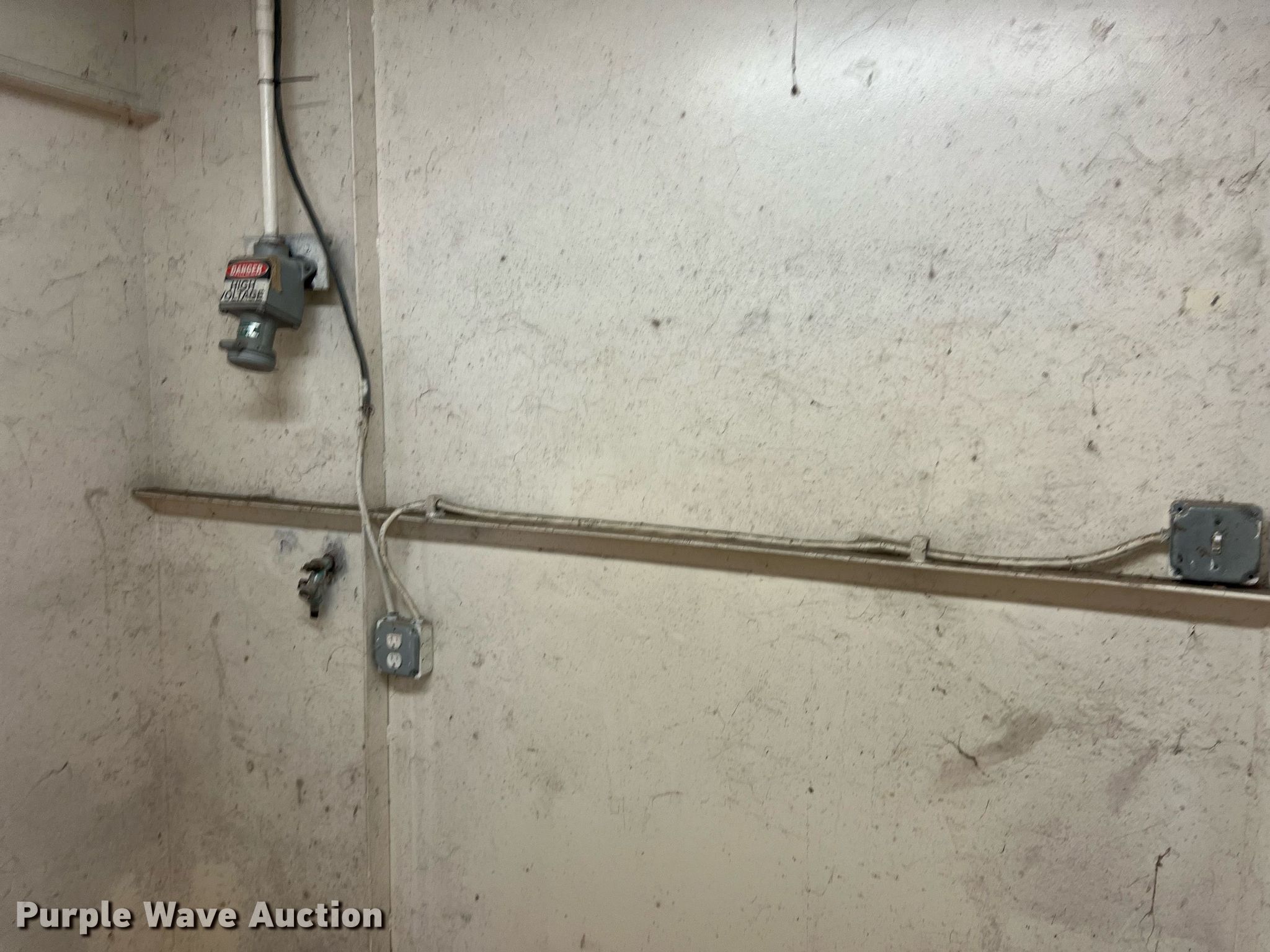 Skid mounted storage container. Dimensions: Approx. 40' L x 10' W x 10' H, Contents included, Canopy included. All aspects of disassembly and removal are the sole responsibility of the purchaser. Including the electric service and canopy. Bobby Lehmann Equipment. Giddings, TX 78942