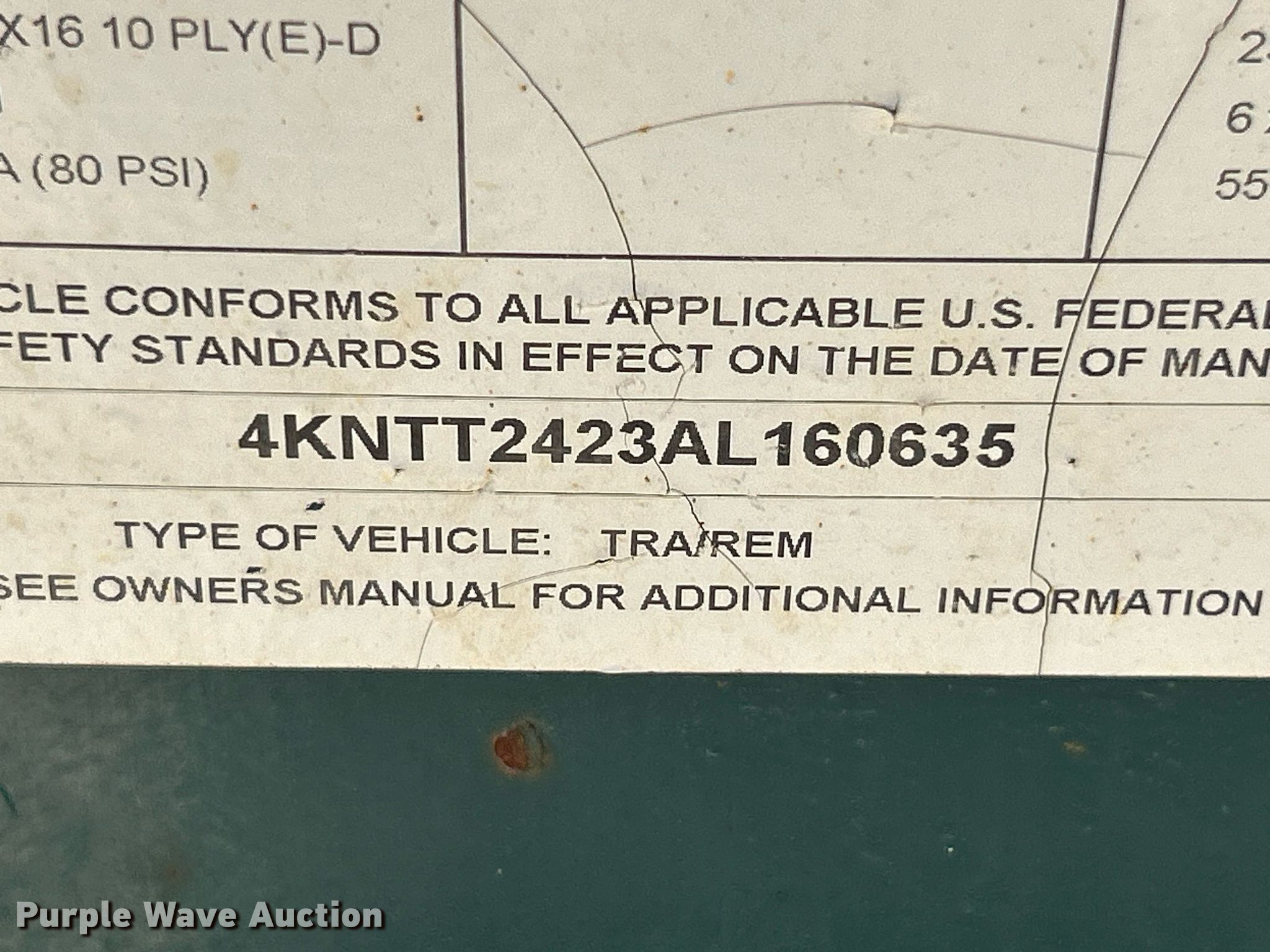 2010 Towmaster T-20 Deck Over Tilt tilt deck equipment trailer. VIN: 4KNTT2423AL160635. Dimensions Overall: 33' L x 101" W, Deck: 28' L x 101" W, Ramps: Manual Length: 16". Features Deck type: Wood. Chassis Hitch: Pintle, Landing gear: Single, Suspension: Spring, Brakes: Electric, Axles: Tandem, GVWR: 25,900 lbs, GAWR: 10,000 lbs. Tires Steel wheels, Size: 235/85R16. Missouri title. Title distribution may be delayed up to 14 days from verification of funds. M Turpin Services LLC. Foristell, MO 63348