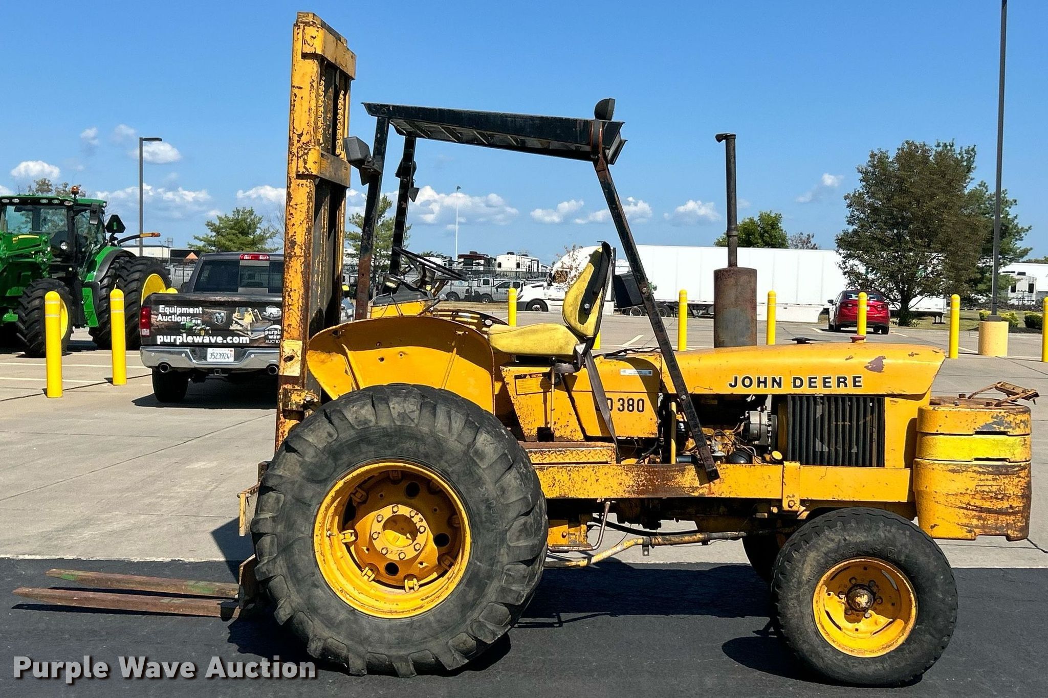 1972 John Deere 380 forklift. Hours: 6,780 on meter, Serial: 147244T. Engine Cylinders: 3, Fuel type: Diesel. Transmission Shuttle shift. Features Mast stages: 2, Side shift, Mast tilt, Fork length: 48". Tires Front: 16.9-24, Rear: 11L-15. Sydenstricker Nobbe Partners Inc.. Wentzville, MO 63385
