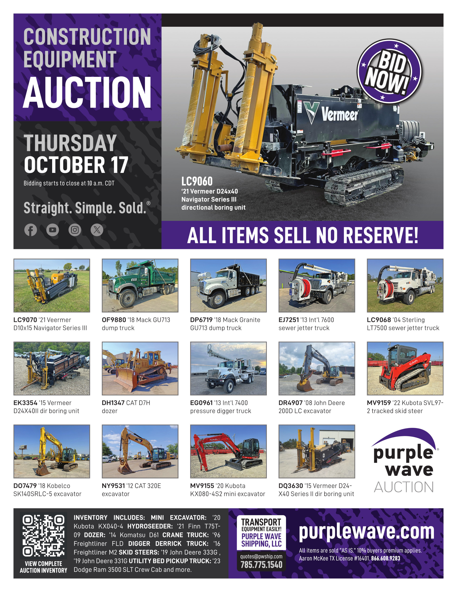 This auction is conducted by Purple Wave, Inc., whose home office is 825 Levee Drive, Manhattan, Kansas. Aaron McKee, Texas auctioneer license # 16401, operates Purple Wave, Inc. Complaints against us may be directed to the Texas Department of Licensing and Regulation, P.O. Box 12157, Austin, Texas 78711, (512) 463-6599. For additional required information, see the attached document.