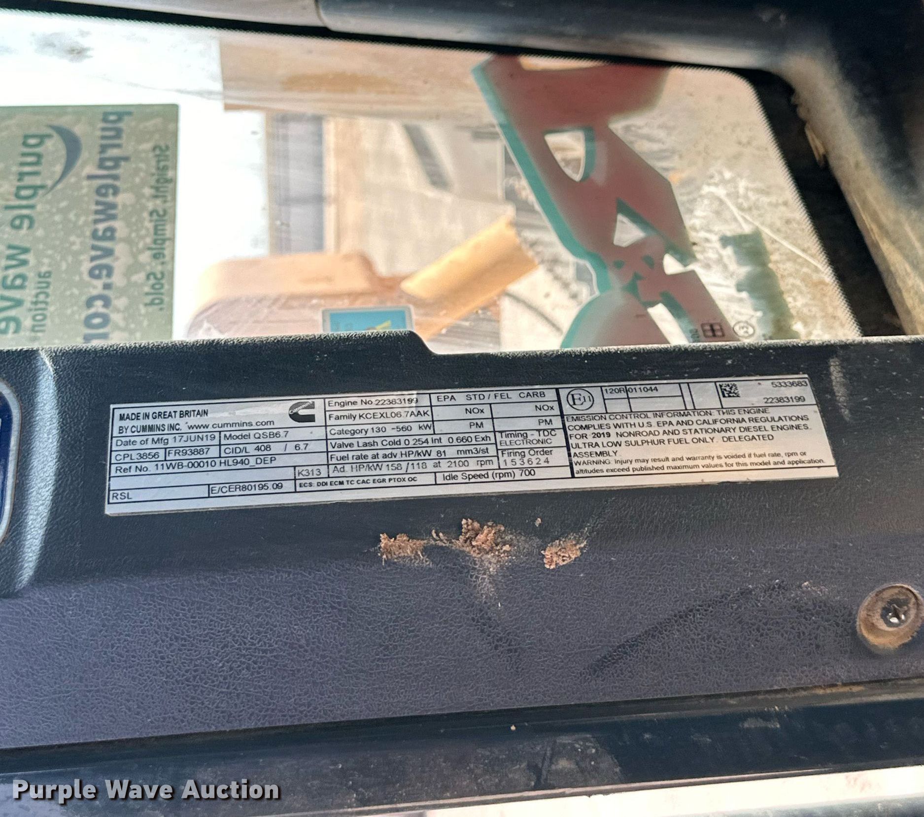2020 Hyundai HL940XT high lift wheel loader. Hours: 13,015 on meter, Serial: HHKHW400CL0001175. Engine Cummins, Displacement: 6.7L, Cylinders: 6, Fuel type: Diesel. Transmission Powershift, 4F - 4R. Chassis Differential lock. Operators station Enclosed cab, AC, Heat, Bucket controls: Joystick. Features Bucket Width: 105", Self- leveling bucket, Cutting edge: Bolt-on. Tires Size: 20.5R25. R&S Industries Inc. Clovis, NM 88101